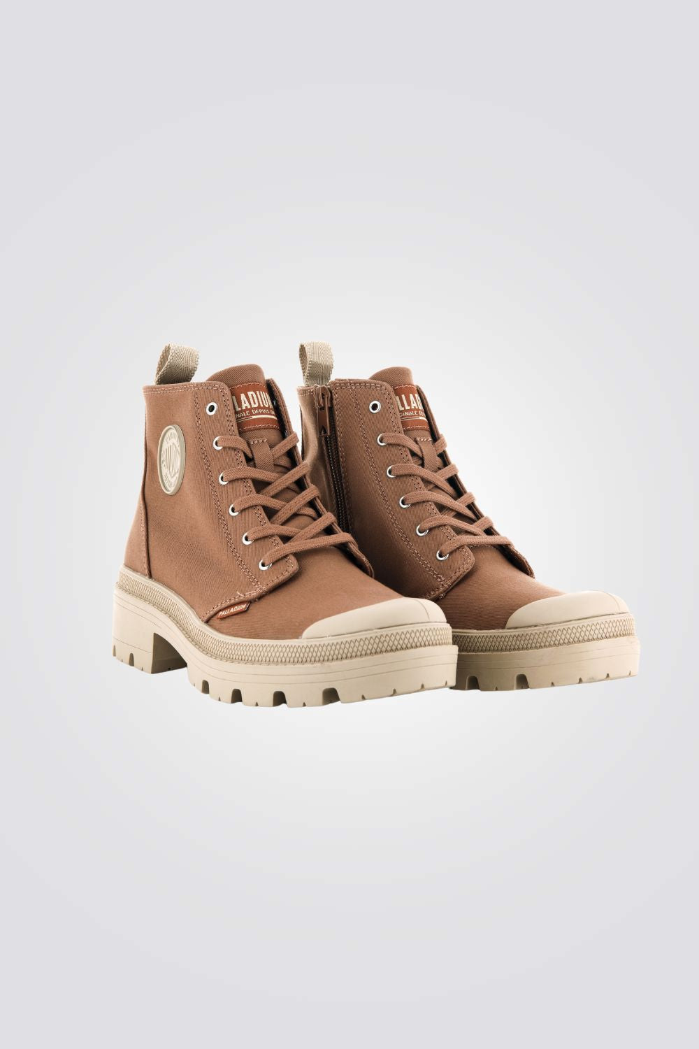 מגפונים לנשים מבית המותג PALLADIUM, בצבע חום בעיצוב קלאסי עם סולייה גבוהה , שרוכים וסגירת רוכסן בצד.