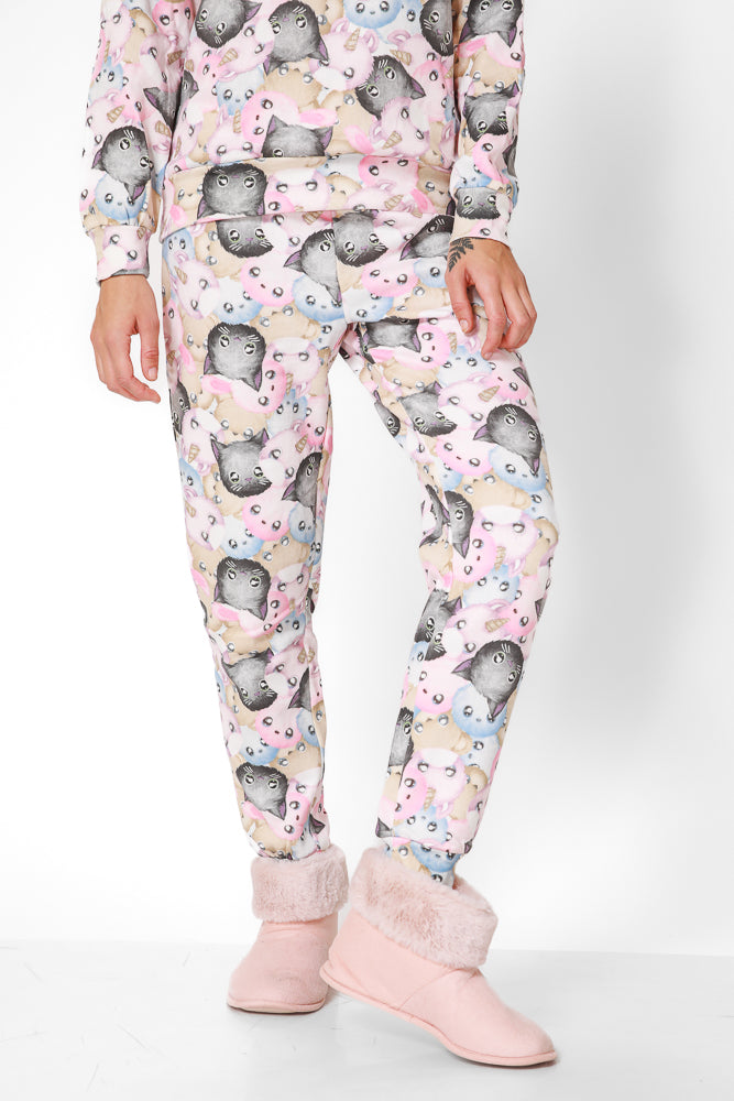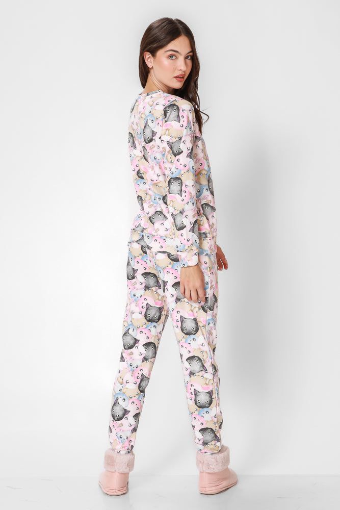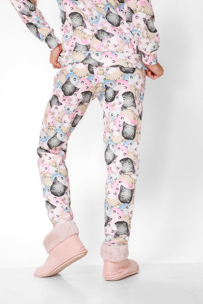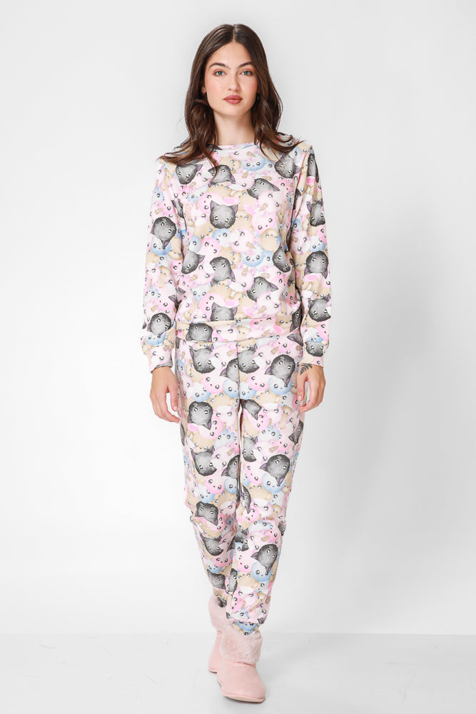 סט פיג’מת חורף מבד פוטר חם ונעים בהדפס חתולי נהנהנה. חולצה ארוכה עם מפתח צוואר עגול וסיומת מנג’ט. מכנסיים ארוכים תואמים עם שרוך קשירה וסיומת מנג’ט. חפשו דגם תואם לילדות!
