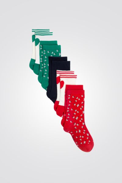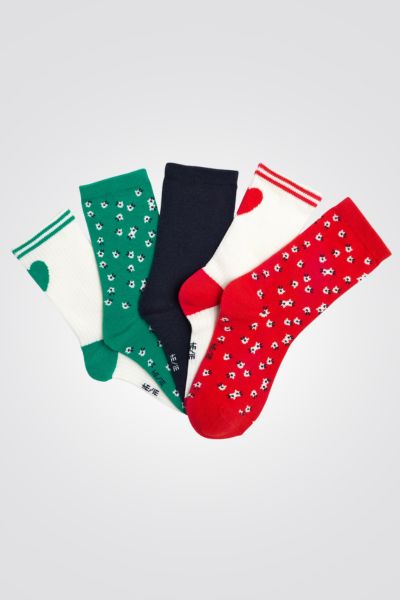 חמישיית גרבים לילדים מבית המותג OKAIDI, גרבי בצבעים שונים עם הדפסים עליזים בגווני ירוק ואדום.