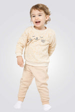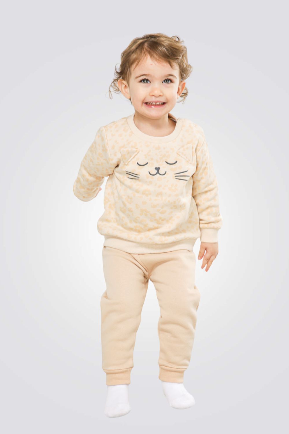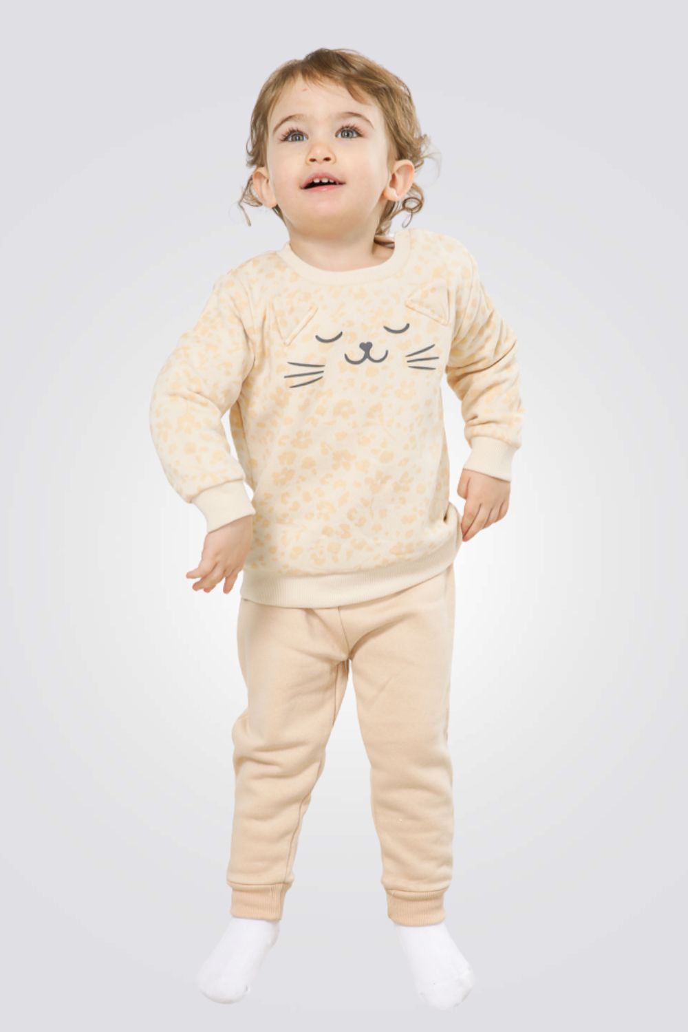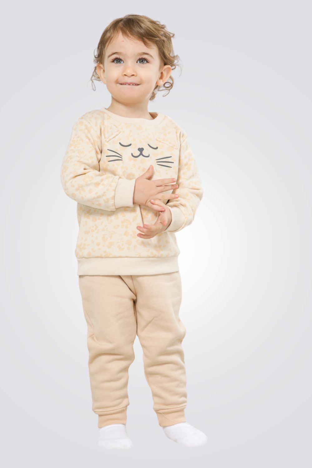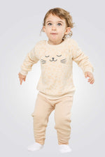 סט מבד פוטר רך ומפנק במוטיב מנומר. חולצה עם שרוולים ארוכים, צווארון עגול וסיומת מנג’ט ומכנסיים ארוכים עם גומי במותניים וסיומת מנג’ט.