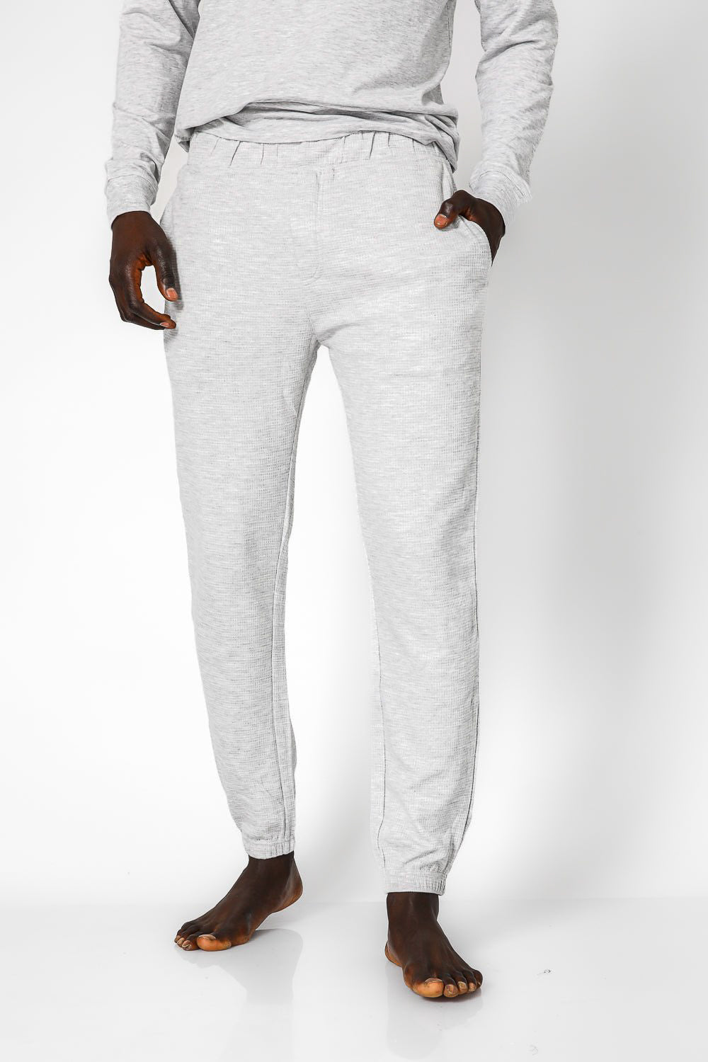 סט פיג’מה ארוכה מבד במבוק רך בטקסטורת וופל. חולצה עם שרוולים ארוכים, צווארון עגול וסיומת מנג’ט ומכנסיים ארוכים עם גומי, כיסים וסיומת מנג’ט.