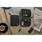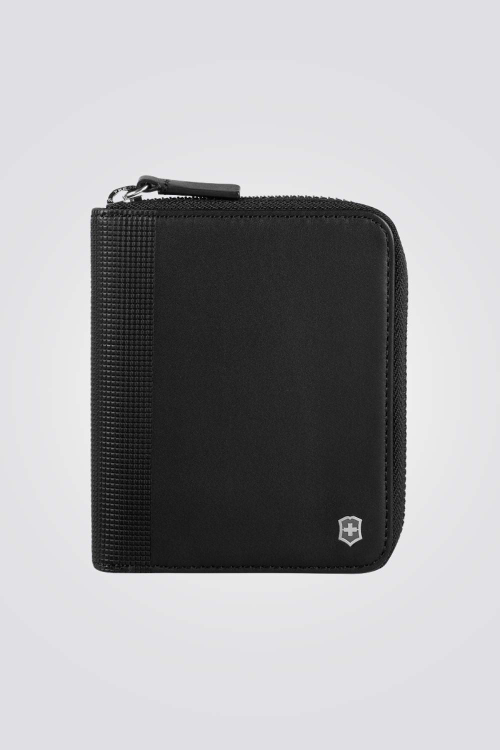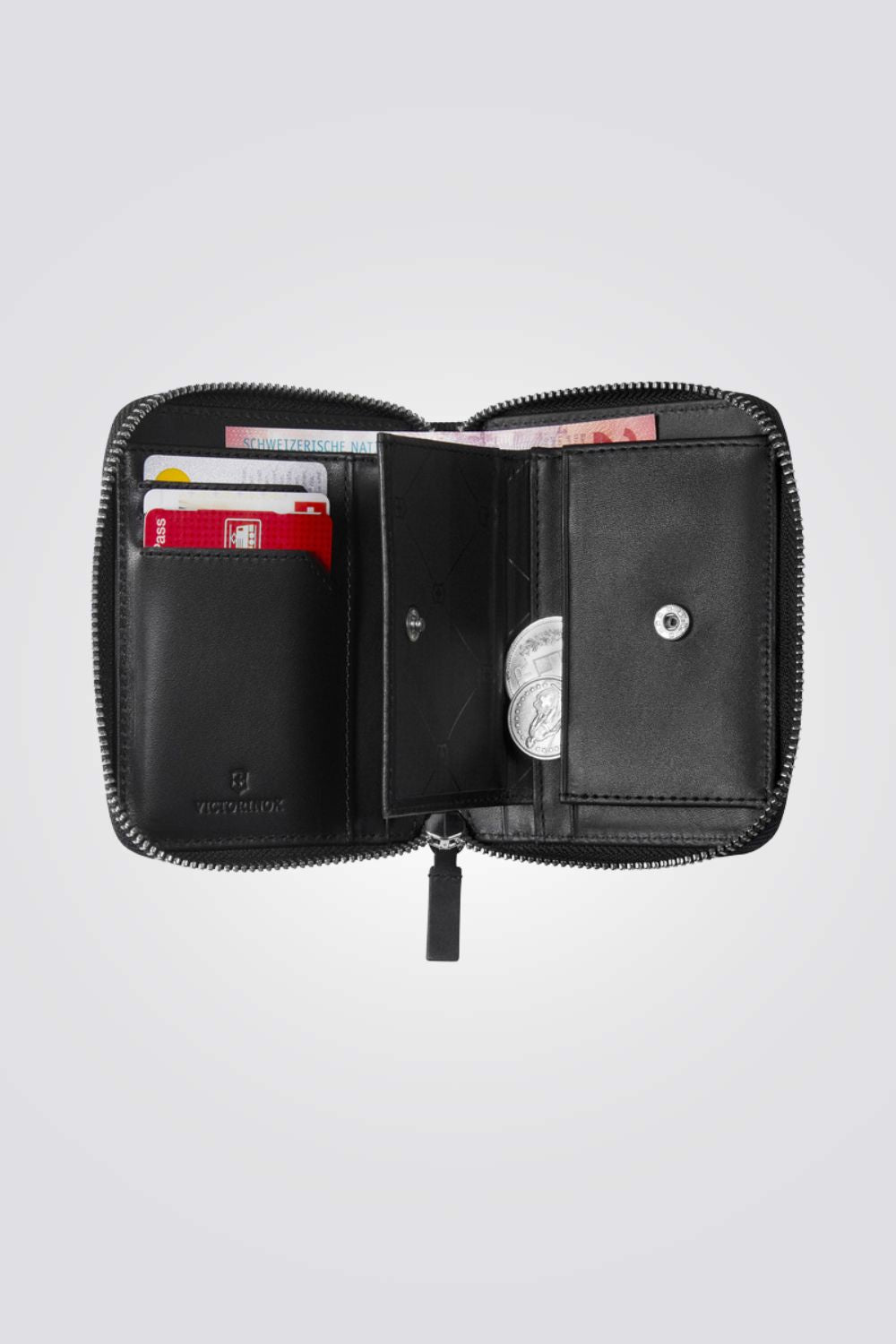 ארנק קומפקטי בצבע שחור, עשוי עור איכותי עם הגנה משולבת מפני גניבת מידע.
