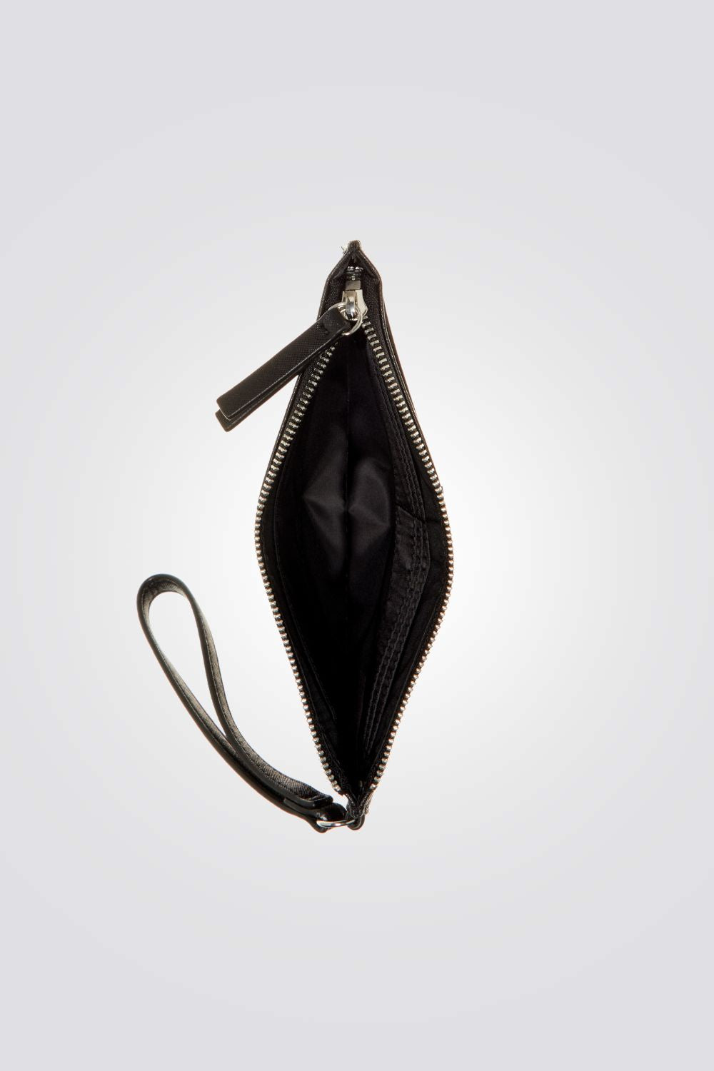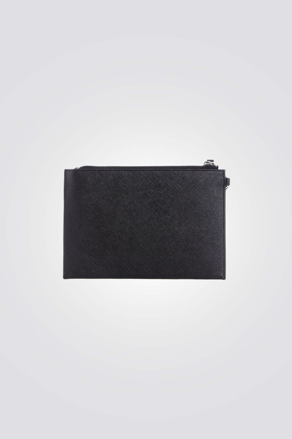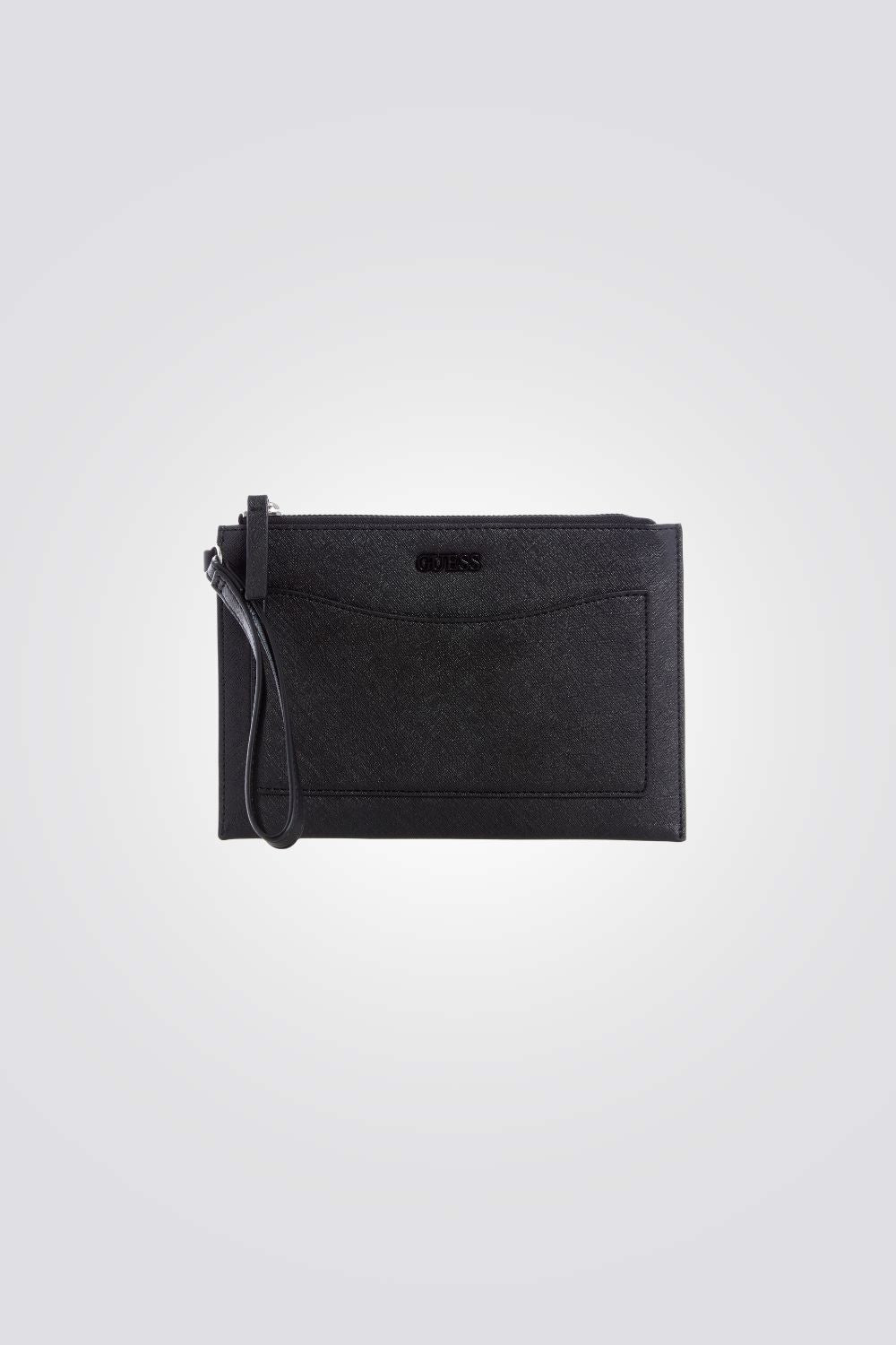 ארנק לנשים מבית המותג GUESS, בעיצוב נקי ואלגנטי, עם לוגו המותג ,תא אחד וסגירת רוכסן ורצועה קטנה ליד.