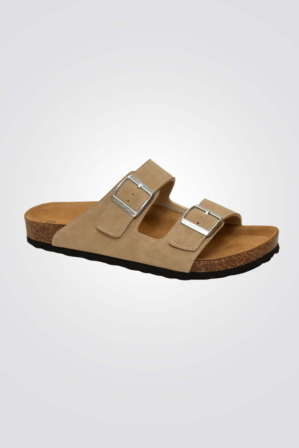 כפכפי נוחות לגברים מבית המותג LADY COMFORT, מבד דמוי זמש איכותי בצבע בז', בעל 2 רצועות מתכווננות עם אבזם.