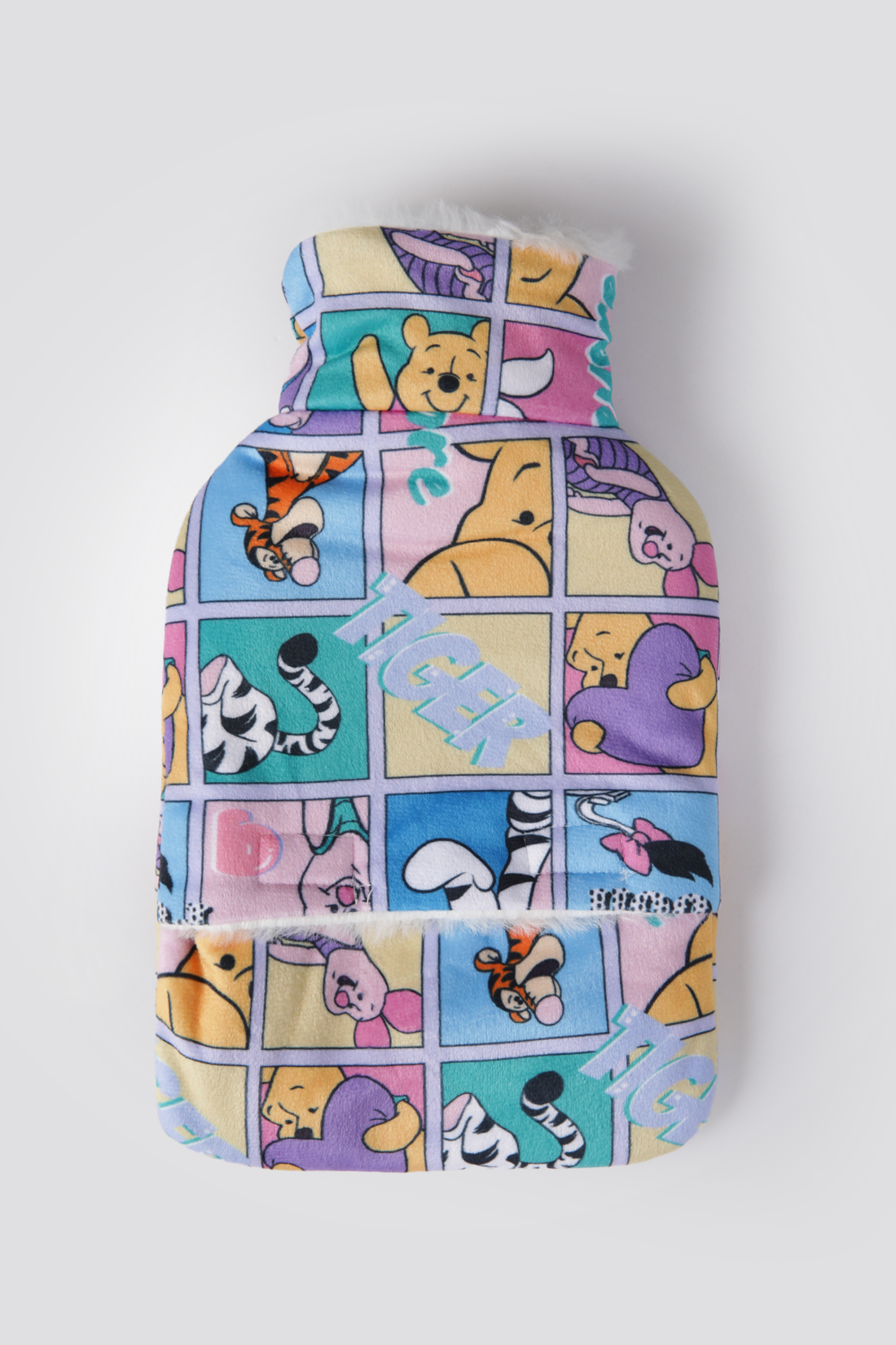 בקבוק מים חמים מבית המותג DELTA עם כיסוי פלאפי מפנק ונעים למגע עם הדפס צבעוני של פו הדב וחברים.