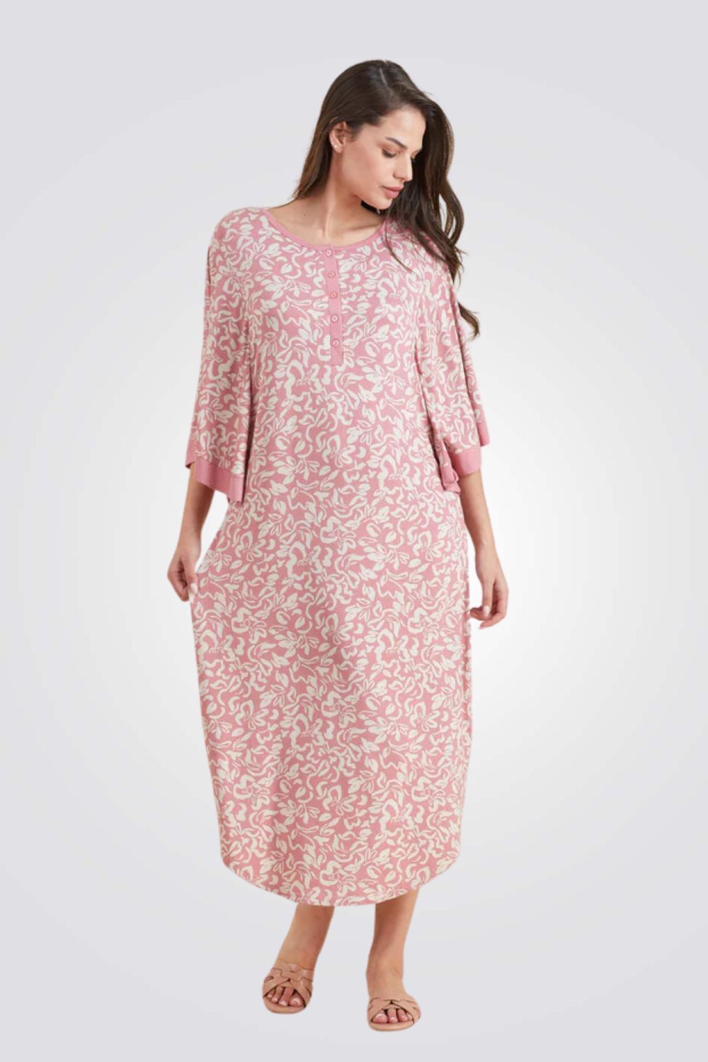 בעלת גזרת עטלף מקסי ובהדפס מפרחוני.