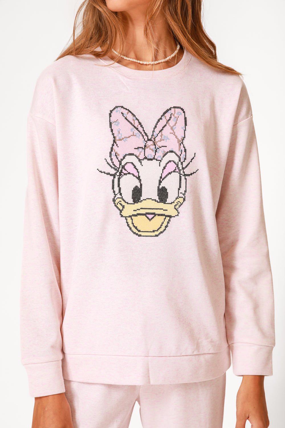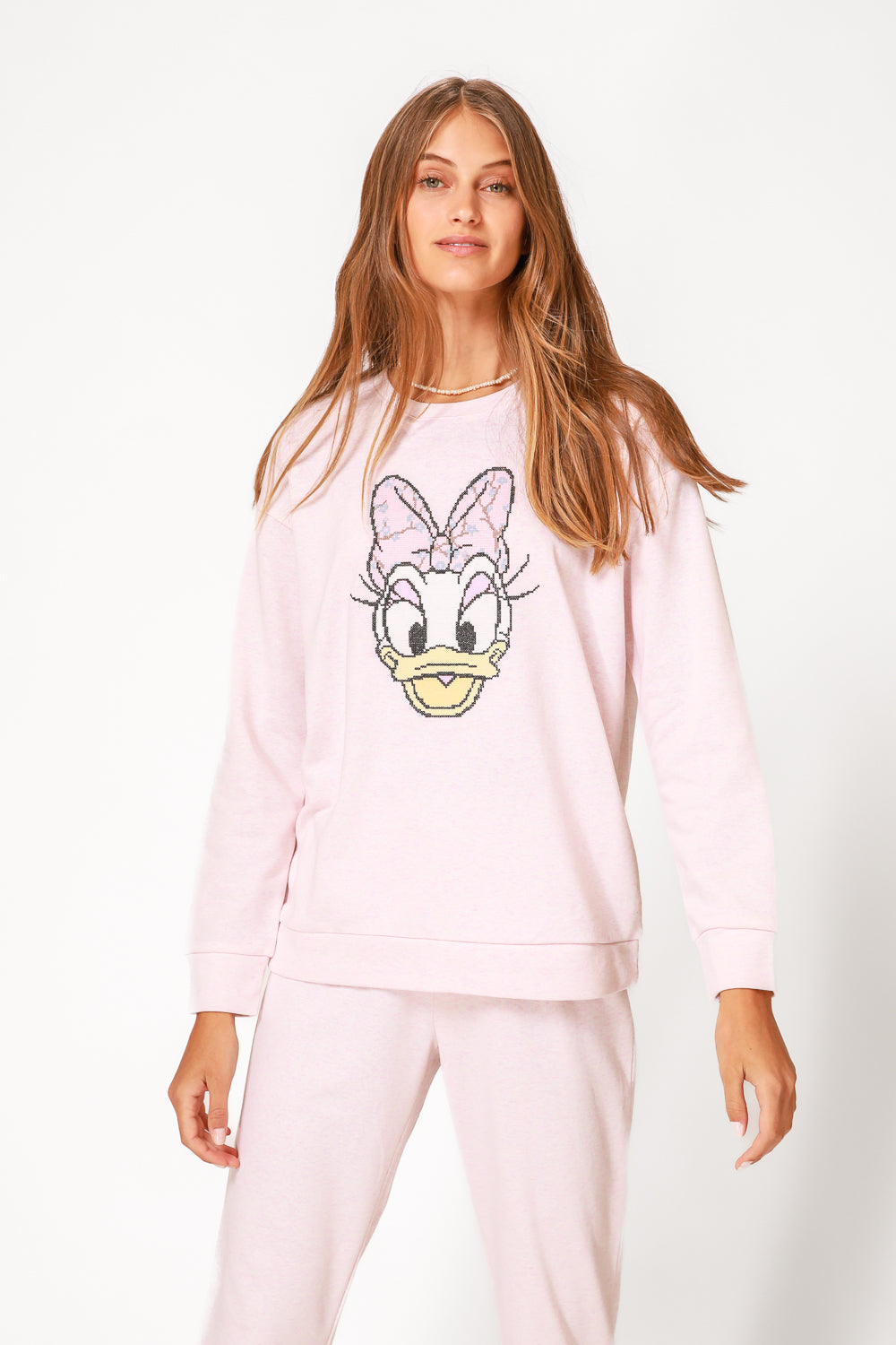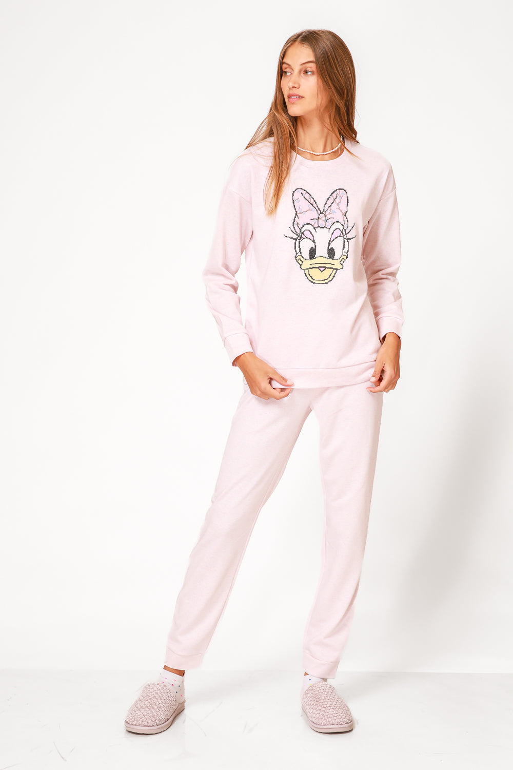 סט פיג’מה מבד דק עם הדפס רקום ומדליק של דייזי. חולצה ארוכה עם מפתח צוואר עגול וסיומת מנג’ט, מכנסיים תואמים עם שרוכי קשירה, כיסים בצדדים וסיומת מנג’ט. חפשו את הדגם התואם לילדים!
