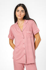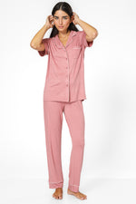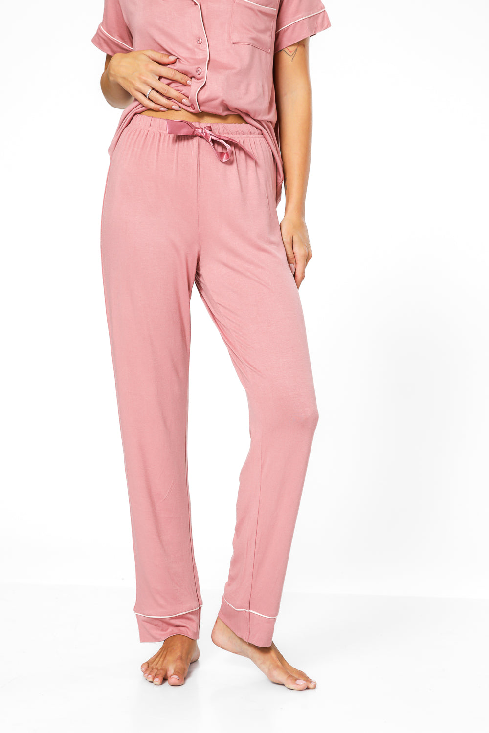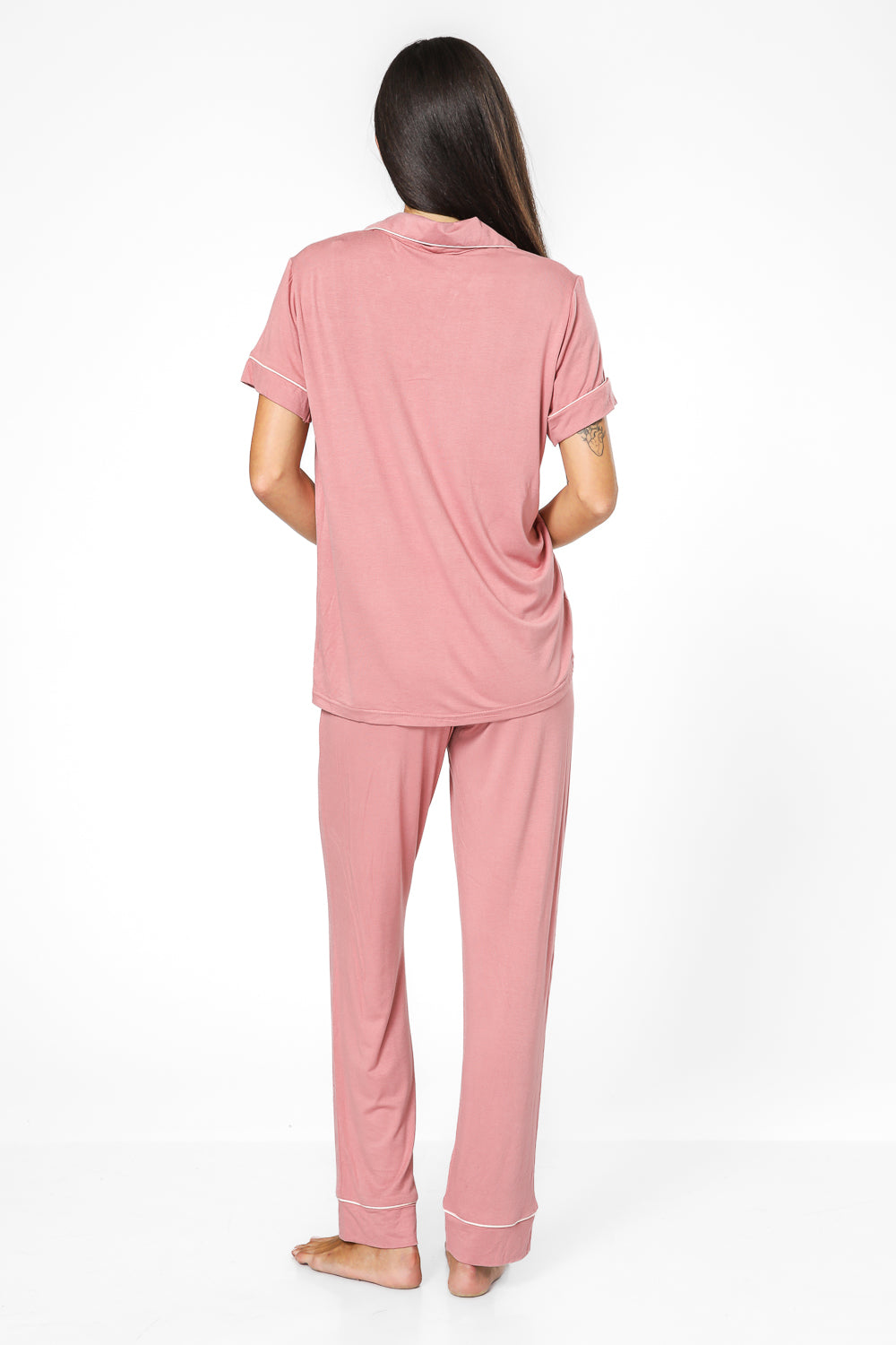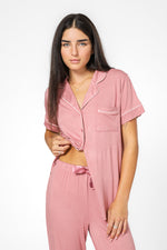 סט פיג'מה מכופתרת לנשים מבית המותג TEHABAD המורכבת מחולצה עם שרוול קצר וכיס קטן בחלק העליון ומכנסיים אורכים עם שרוך קשירה מקדימה.