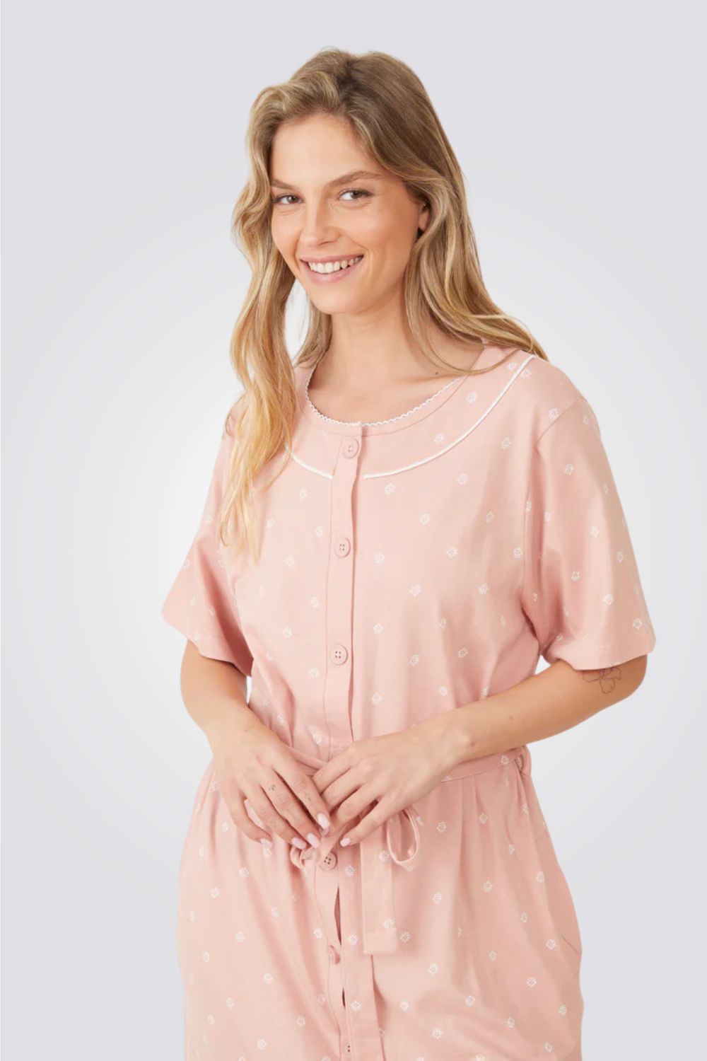 בעלת שרוולים עד גובה המרפק, בהדפס עלים עדין ומיוחד, כפתורים בחזית עם שרוך קשירה על קו המותניים ומסגרת עגולה דקיקה באיזור החזה.