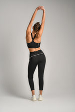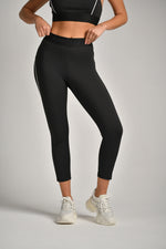 טייץ ספורט ארוך מבית המותג KENNETH COLE לנשים בצבע שחור, מבד נוח ואוסף, בעל חגורת מותן ממותגת מגומי אלסטי לתמיכה ופס לבן דק לאורך הטייץ.