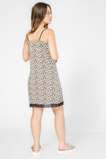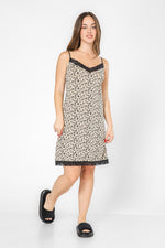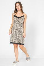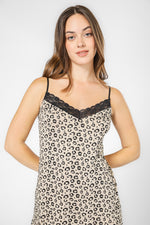 כותונת לילה בגזרה משוחררת מבית המותג DELTA העשויה מבד סינגל ג’רסי נעים בהדפס מנומר עם מחשוף וי, כתפיות דקות וסיומת תחרה.