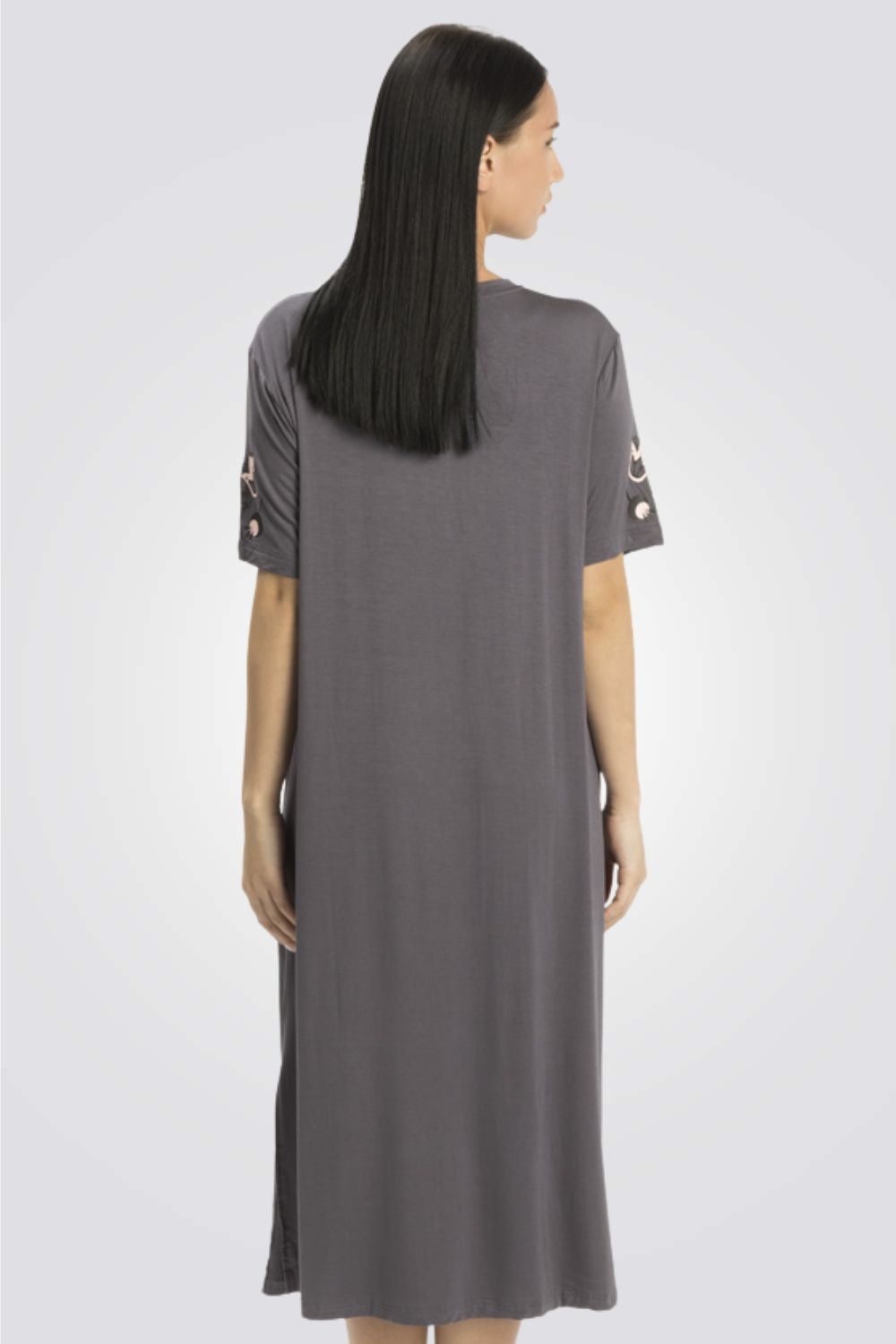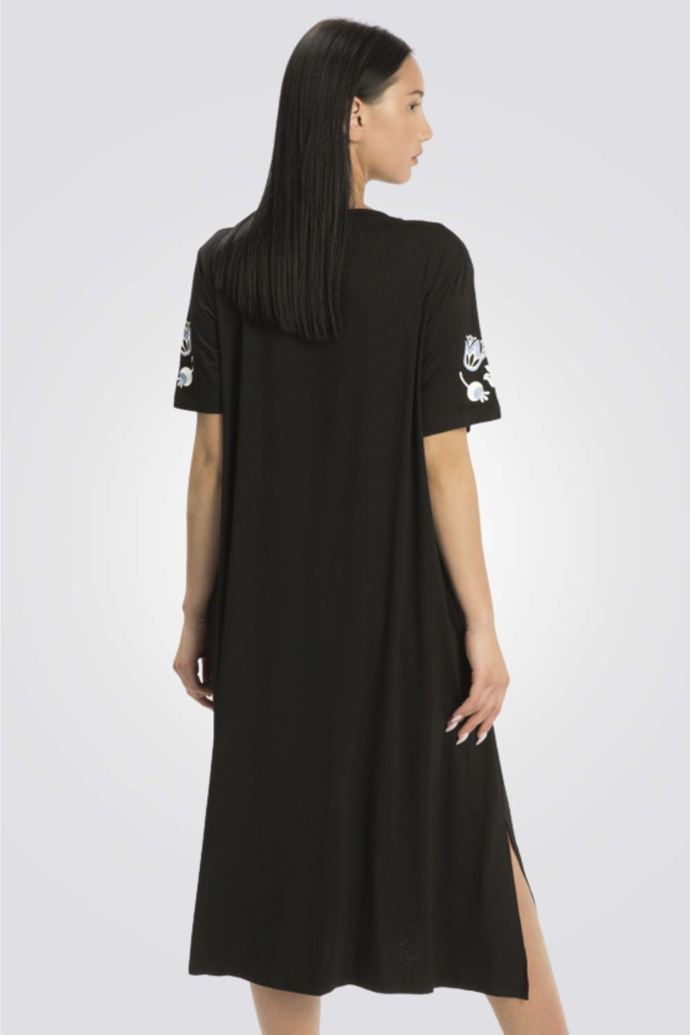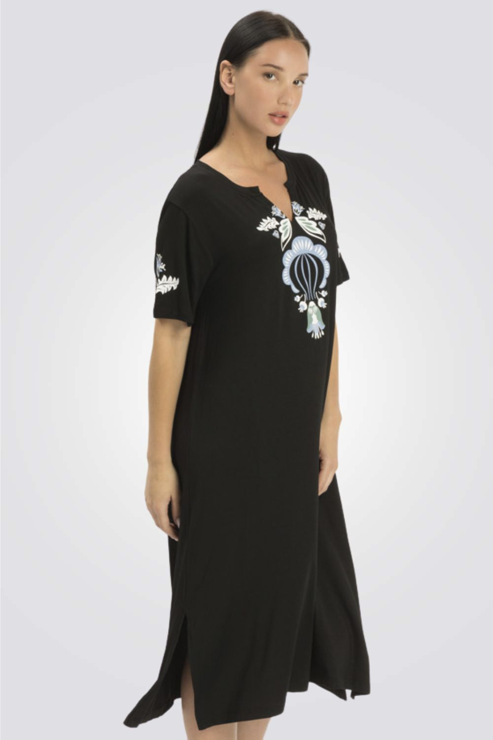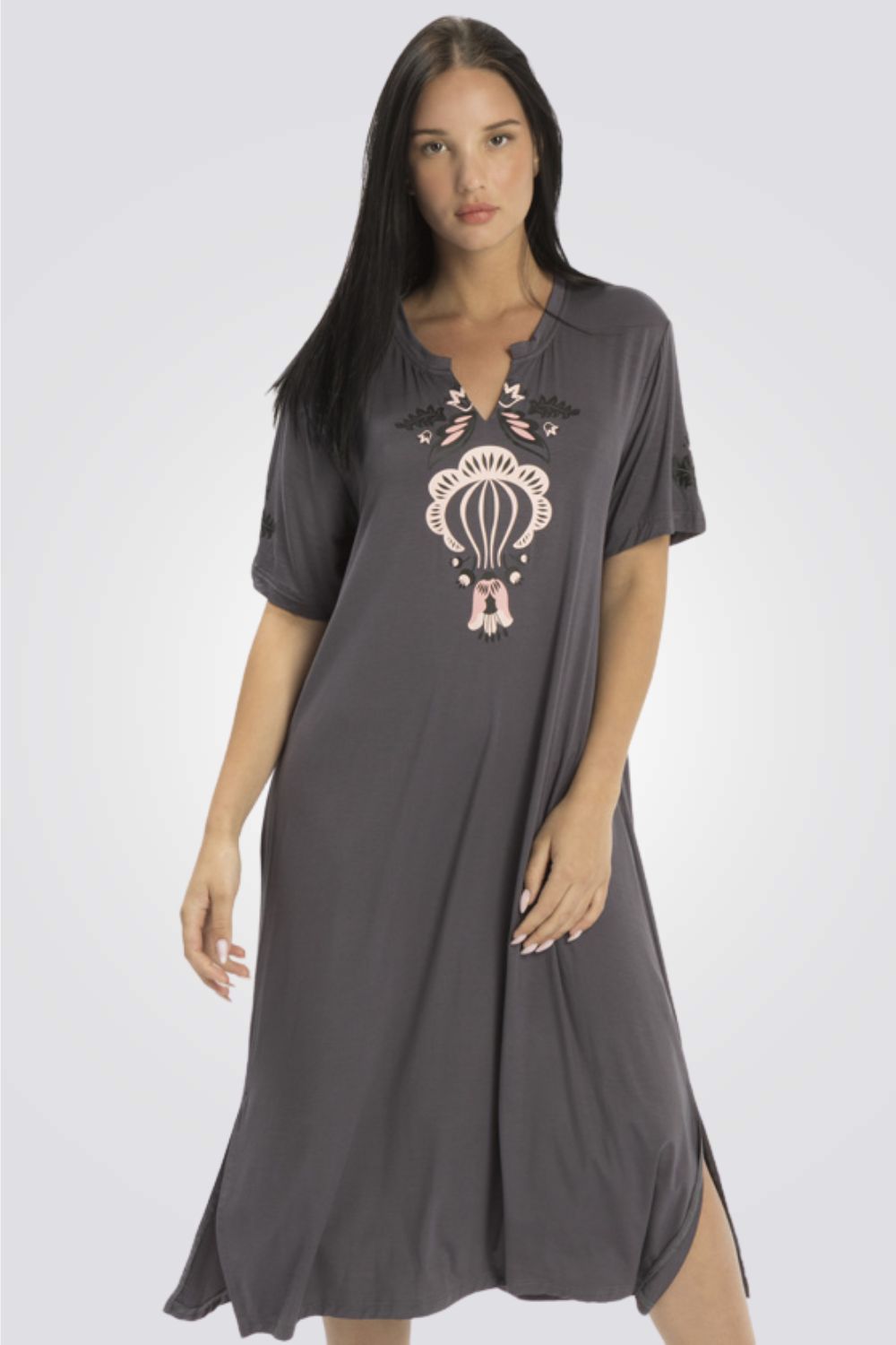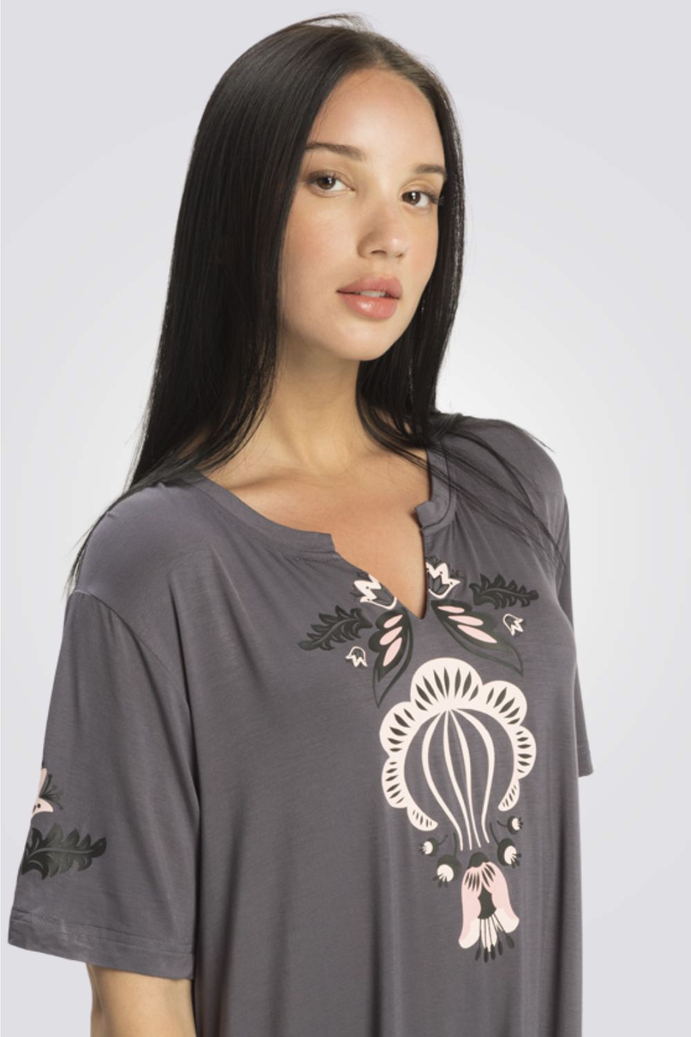 כותונת לילה מבית המותג ONTOP LINGER בעלת שרוולים קצרים עם שסע עדין בשני הצדדים, צווארון עגול עם מחשוף ד והדפס מיוחד בחלקה העליון.
