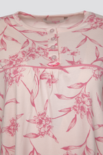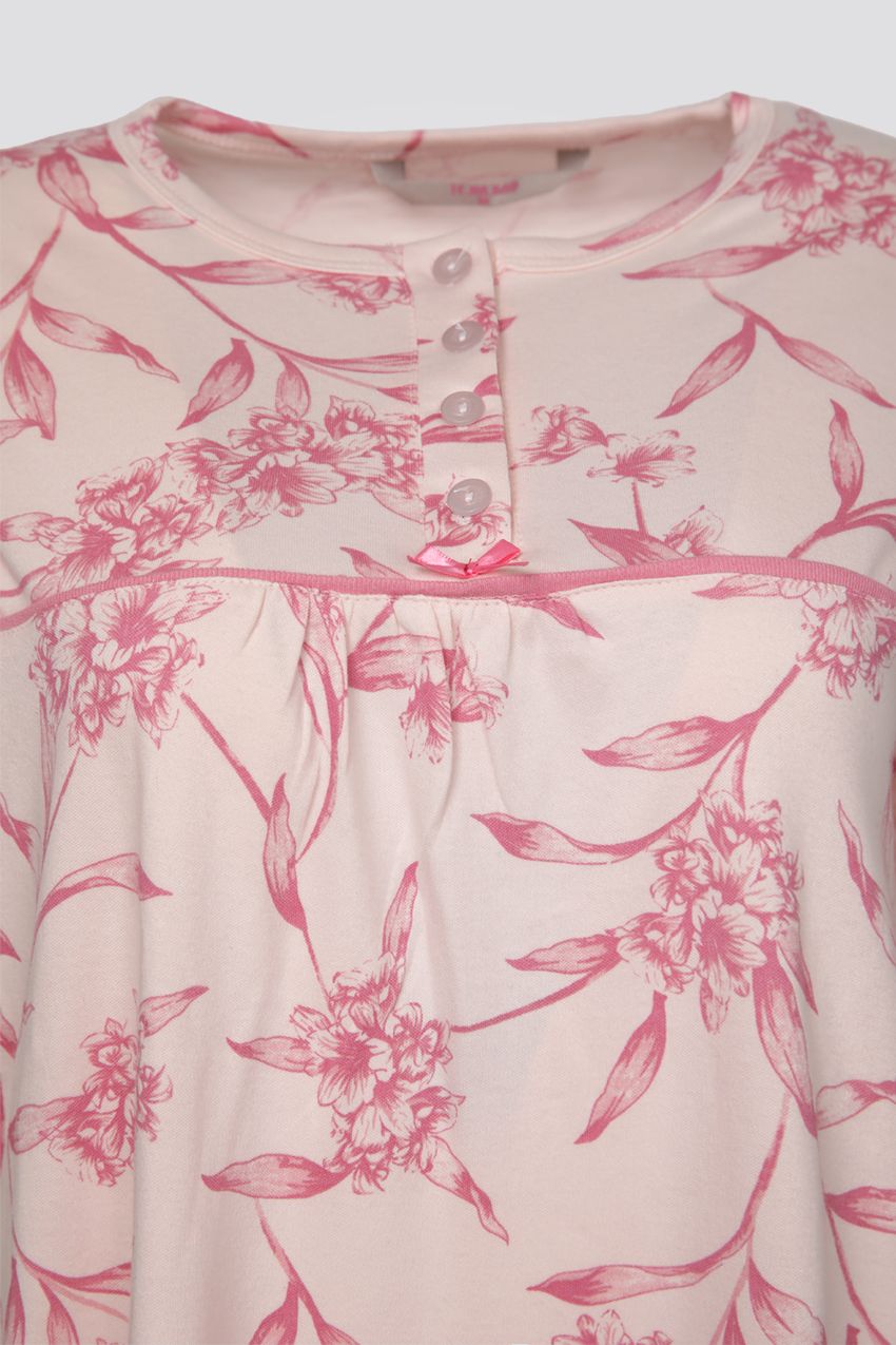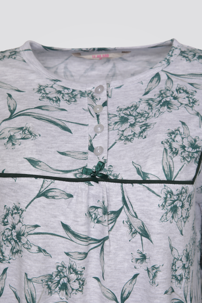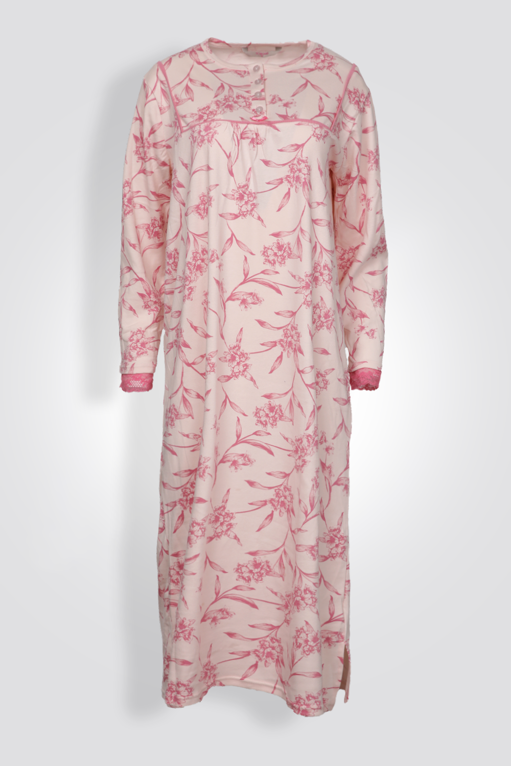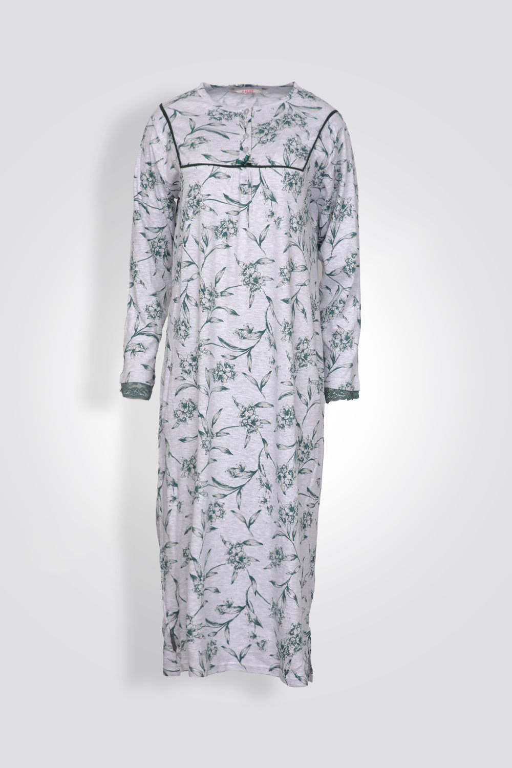כותונת לילה דקה מבית המותג TEHABAD, בגזרה ישרה וארוכה, בעלת שרוולים ארוכים, צווארון עגול ורבעיית כפתורים בחלק העליון.