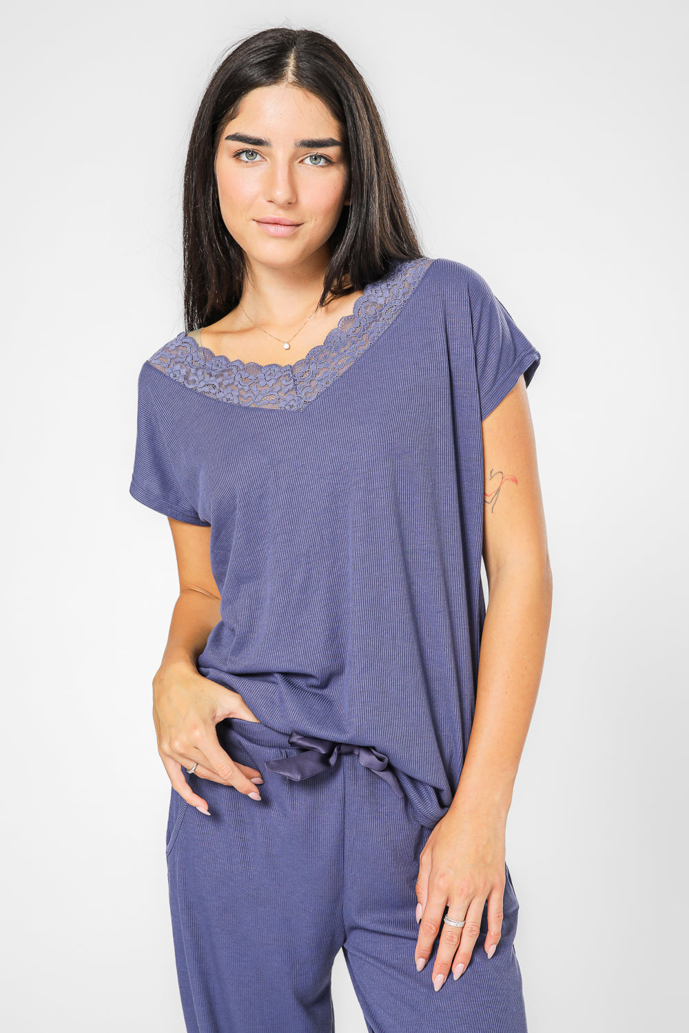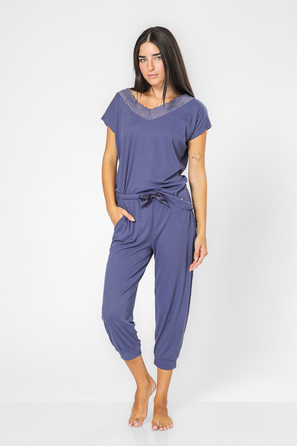 סט פיג'מת קיץ לנשים מבית המותג TEHABAD המורכבת מחולצה עם שרוול קצר וגימור תחרה יחד עם מכנסיים ארוכים בעלי גומי בקו מותניים ושרוך קשירה.