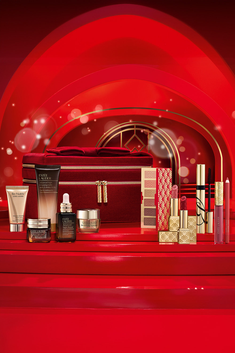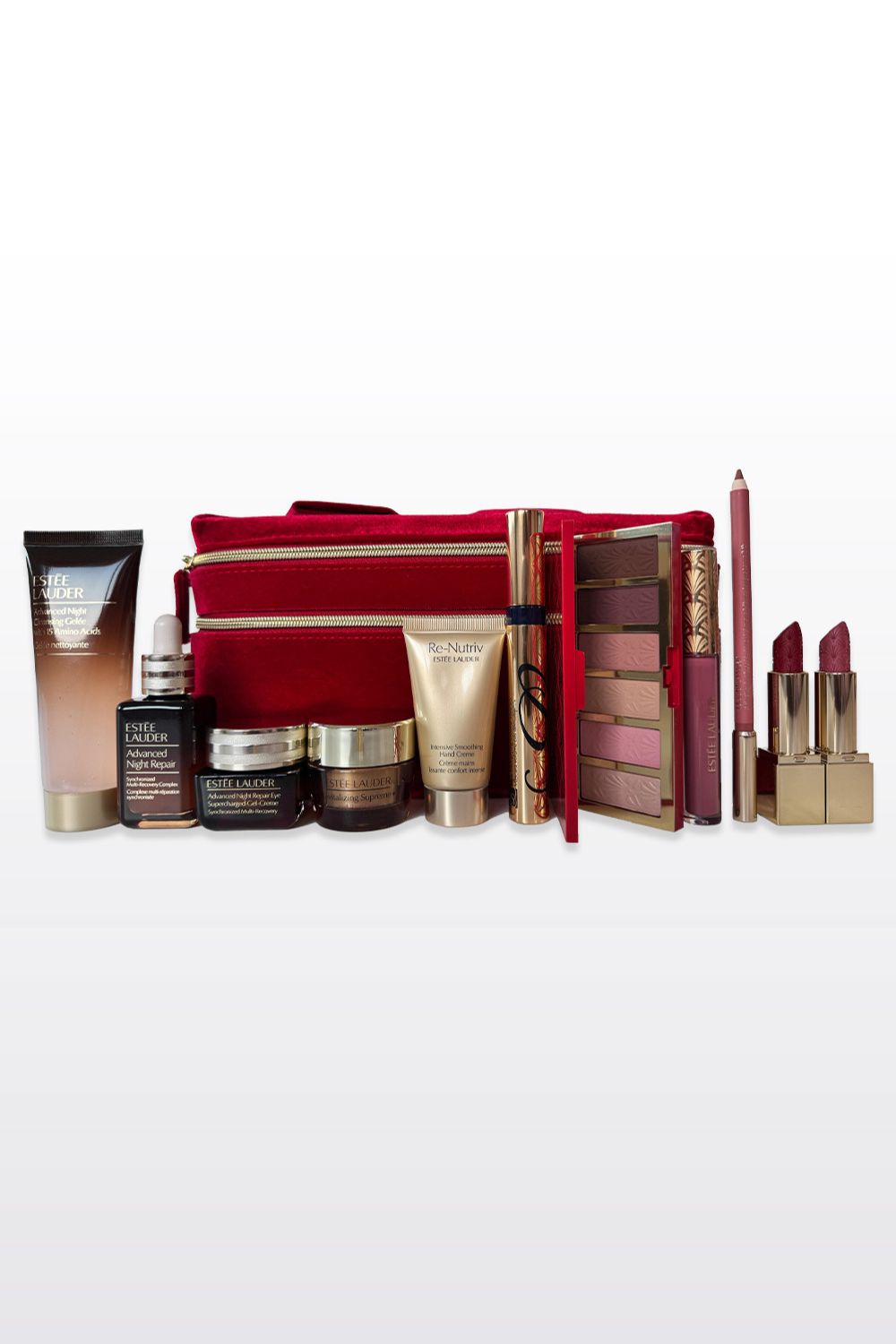 "המארז הגדול והיפה ביותר של אסתי לאודר, המכיל 11 מוצרים אהובים, 6 מוצרים בגודל מלא ועוד 5 בגודל מיוחד, ארוזים בתיק ייחודי ומעוצב העשוי מ95% בד ממוחזר ו5% ספנדקס