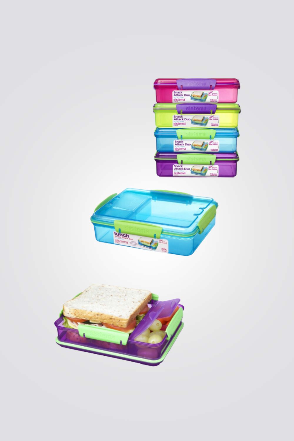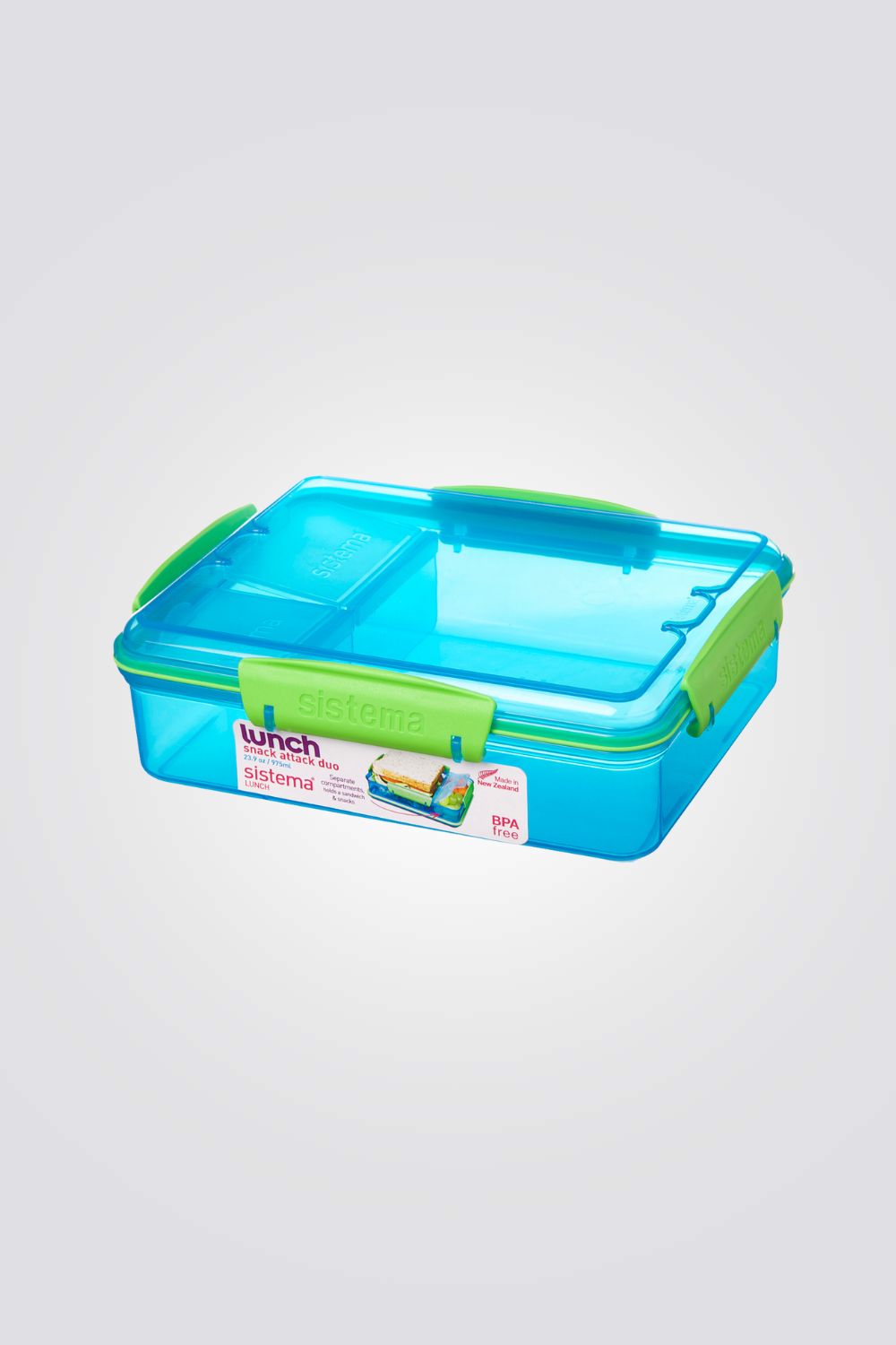 קופסת אוכל מבית המותג SISTEMA, מבלנית ומחולקת לשלושה תאים.