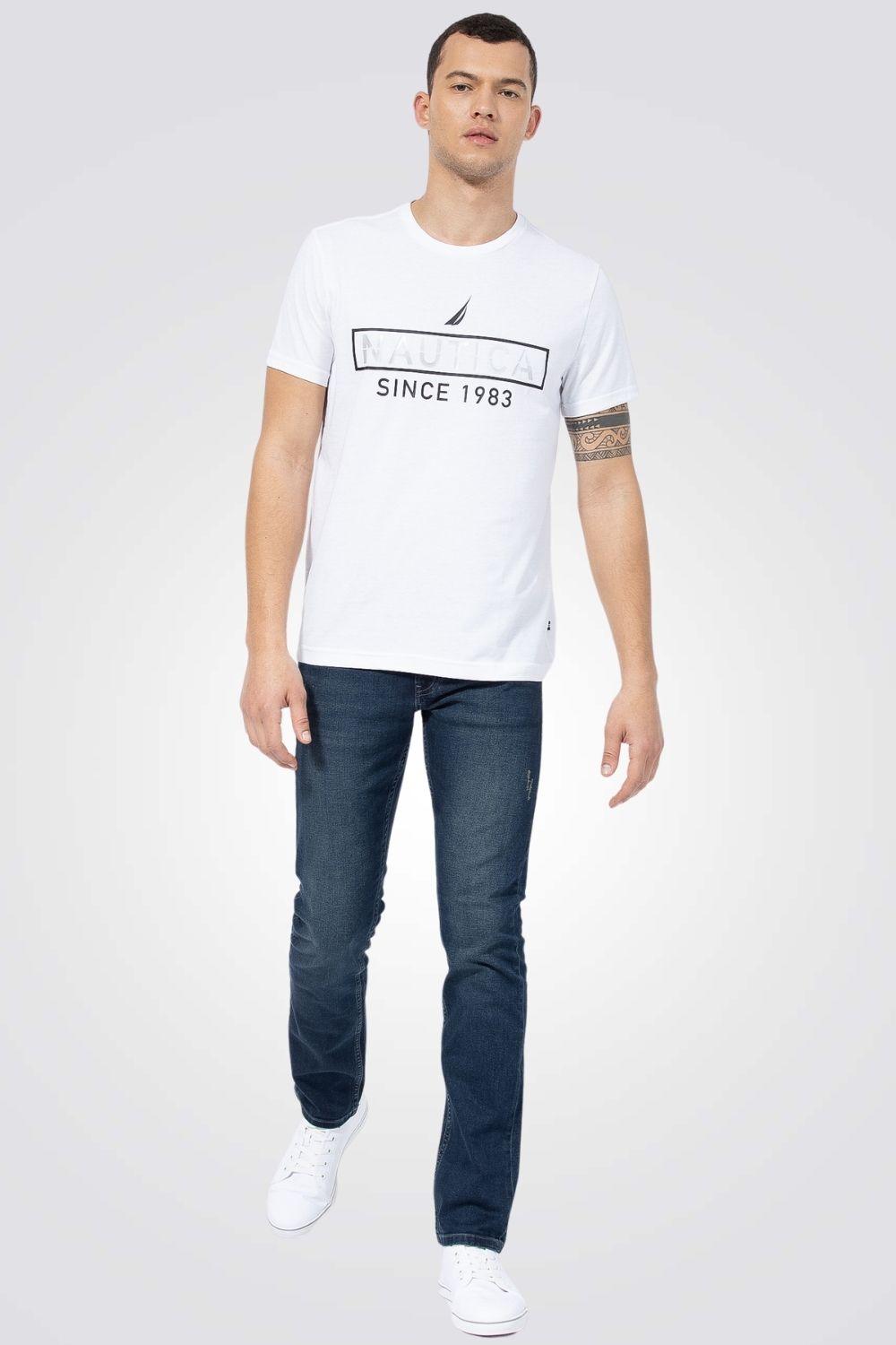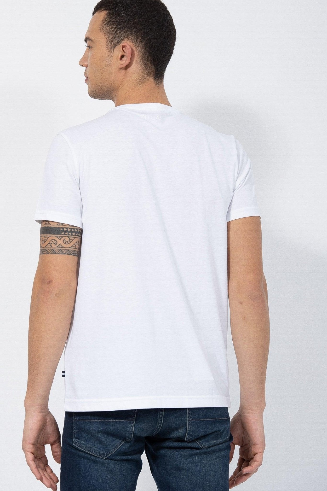 טישירט בצבע לבן מבית המותג NAUTICA. טישירט לבנה עם הדפס לוגו מטאלי כסוף במלבן שחור . שרוולים קצרים וצווארון עגול.