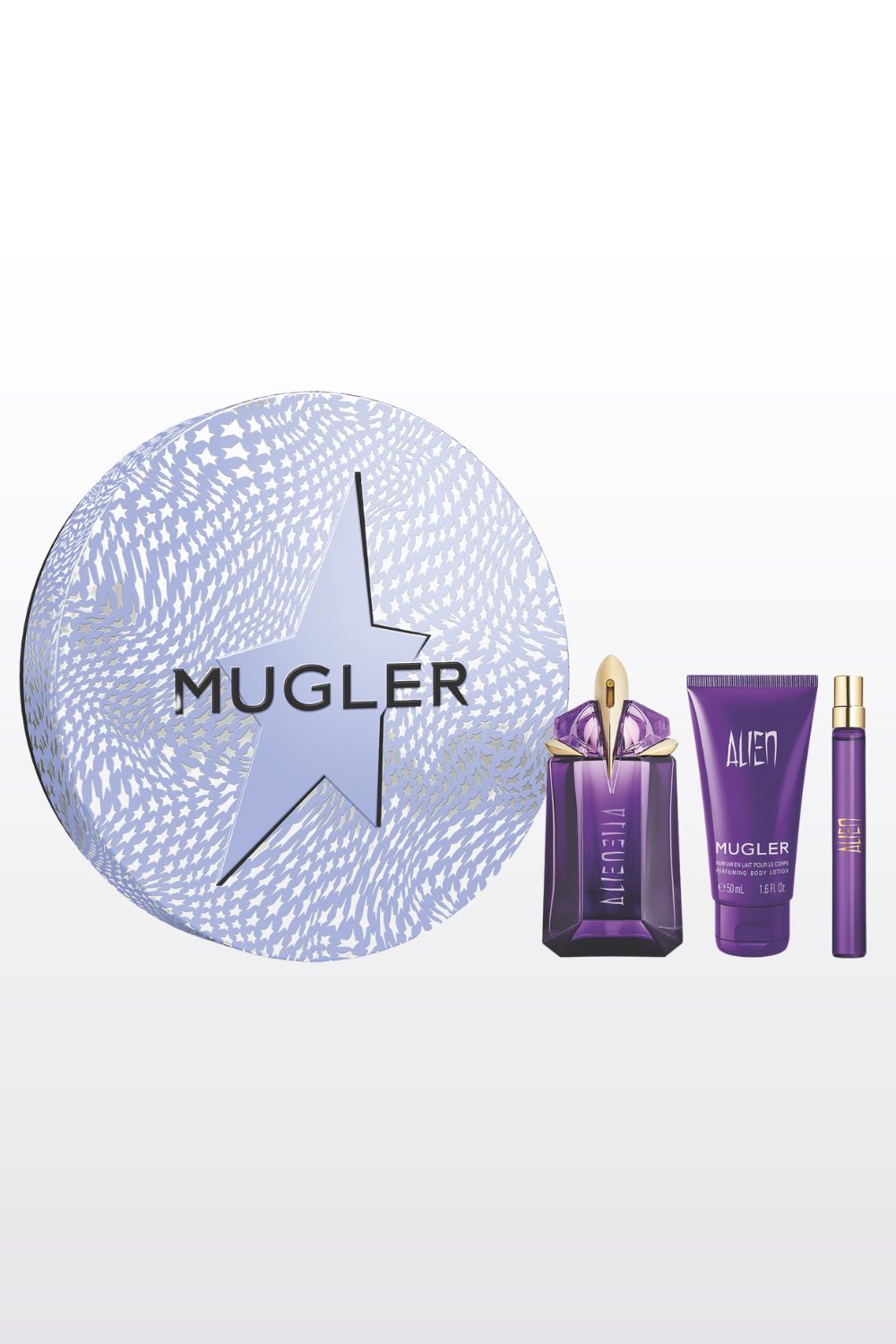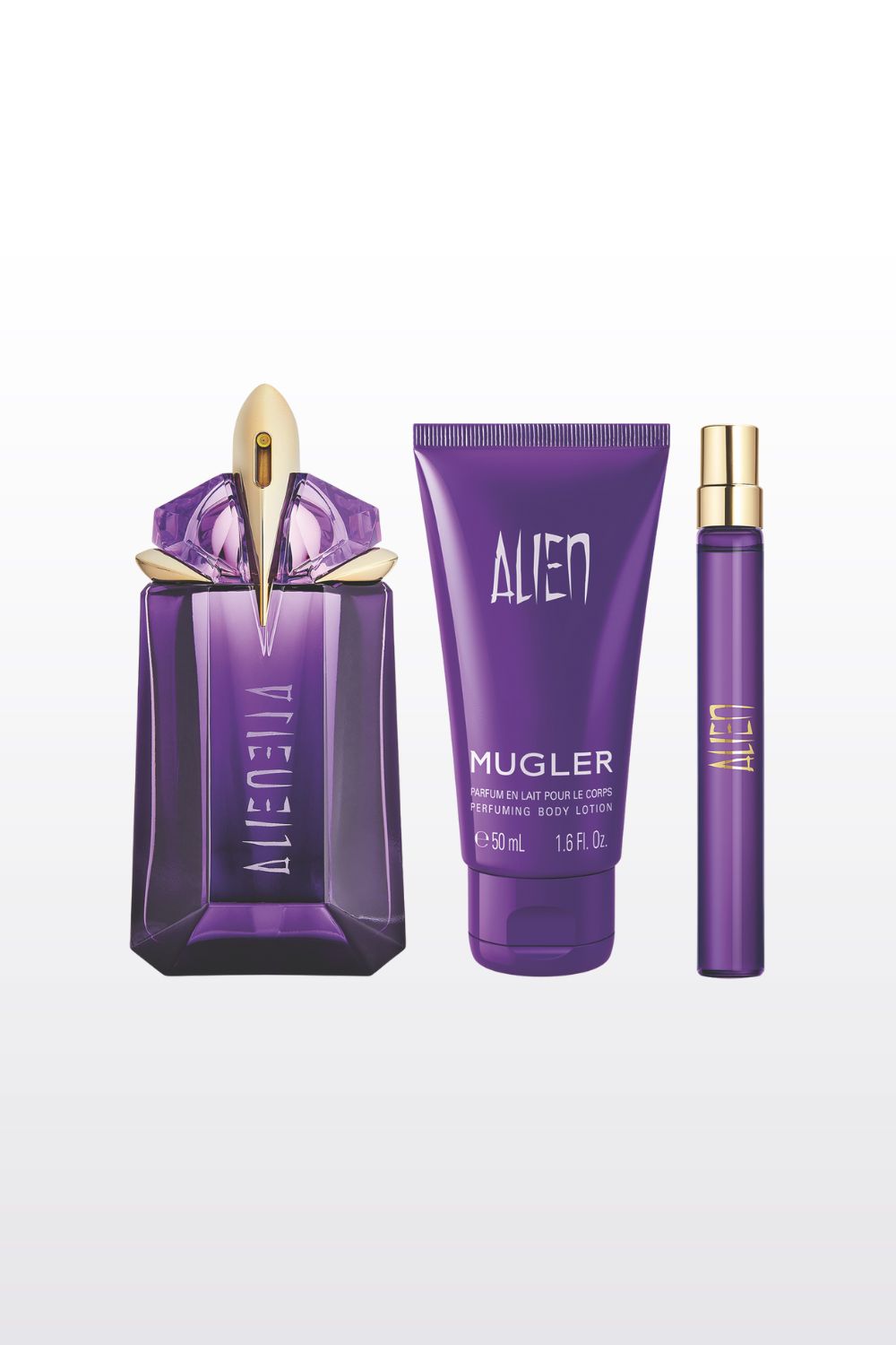 מארז יוקרתי במהדוקה מוגבלת לחג מבית MUGLER - Alien edp המארז מכיל בושם 60 מ"ל + תחליב גוף 50 מ"ל + בושם בגודל 10 מ"ל.