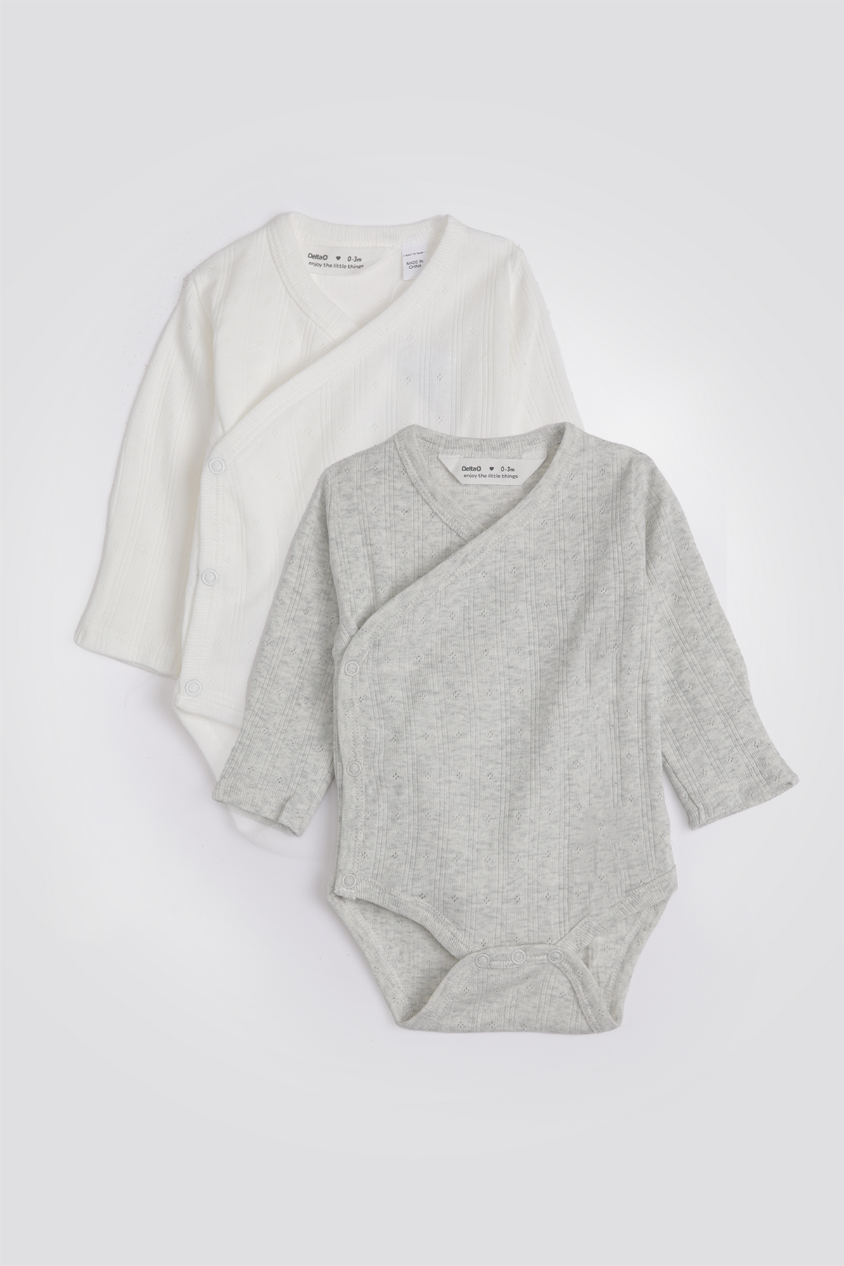 מארז בגדי גוף לתינוק מבית המותג DELTA בעל טקסטורת פוינטל נעימה, בגזרת מעטפת נינוחה, שרוולים ארוכים, וסוגרי טיק-טק בתחתית.