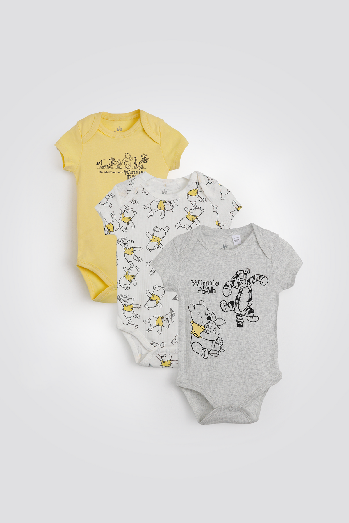 שלישיית בגדי גוף לקיץ מבית המותג DELTA העשויים מבד בטקסטורת ריב עם הדפס מתוק של פו הדוב, מפתח צוואר עגול, שרוולים קצרים וסוגרי טיק טק בתחתית.