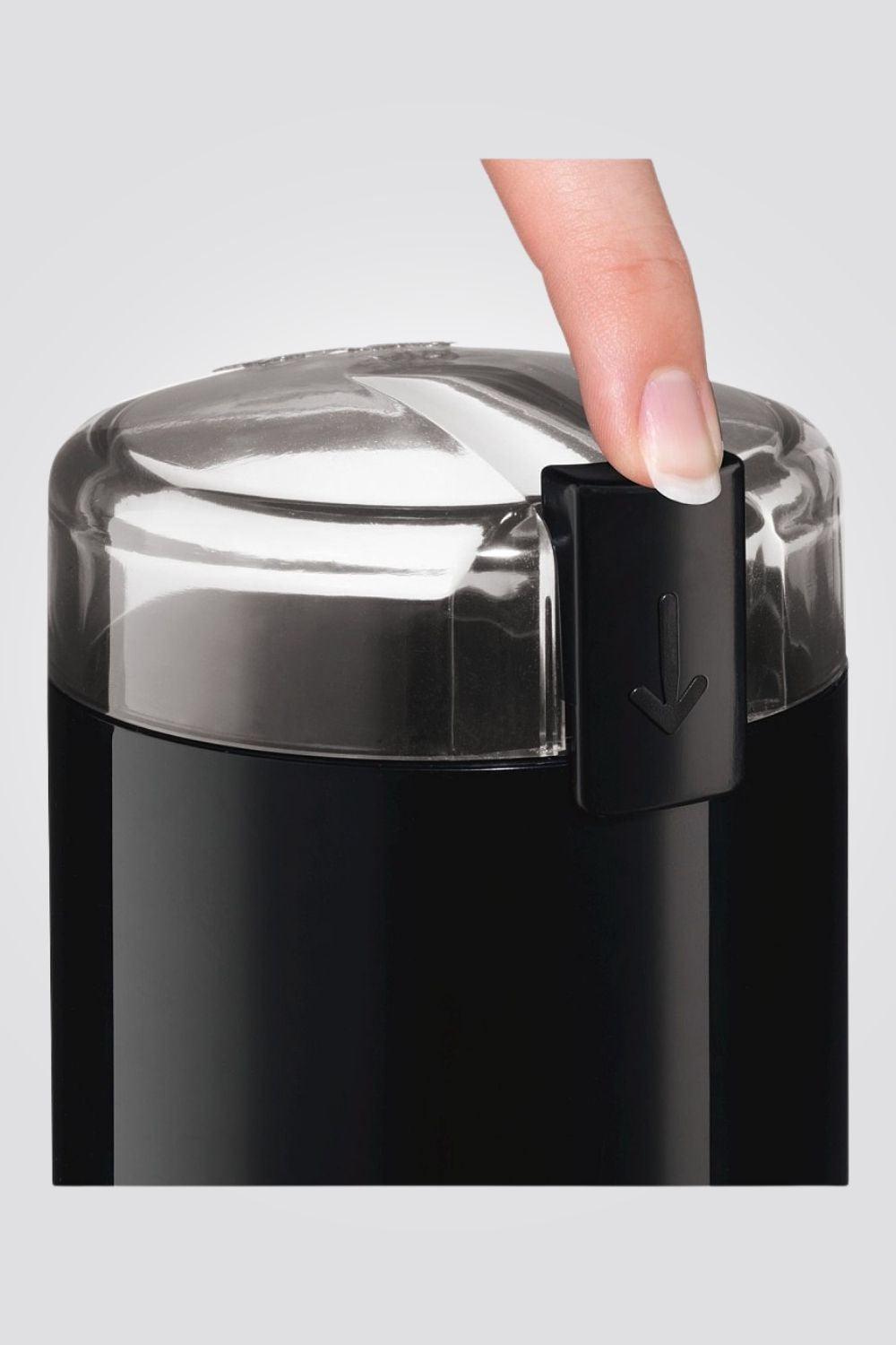 פונקציית בטיחות: טחינת הקפה מתבצעת רק כאשר המכסה מחובר ומתג הבטיחות מופעל כלפי מטה