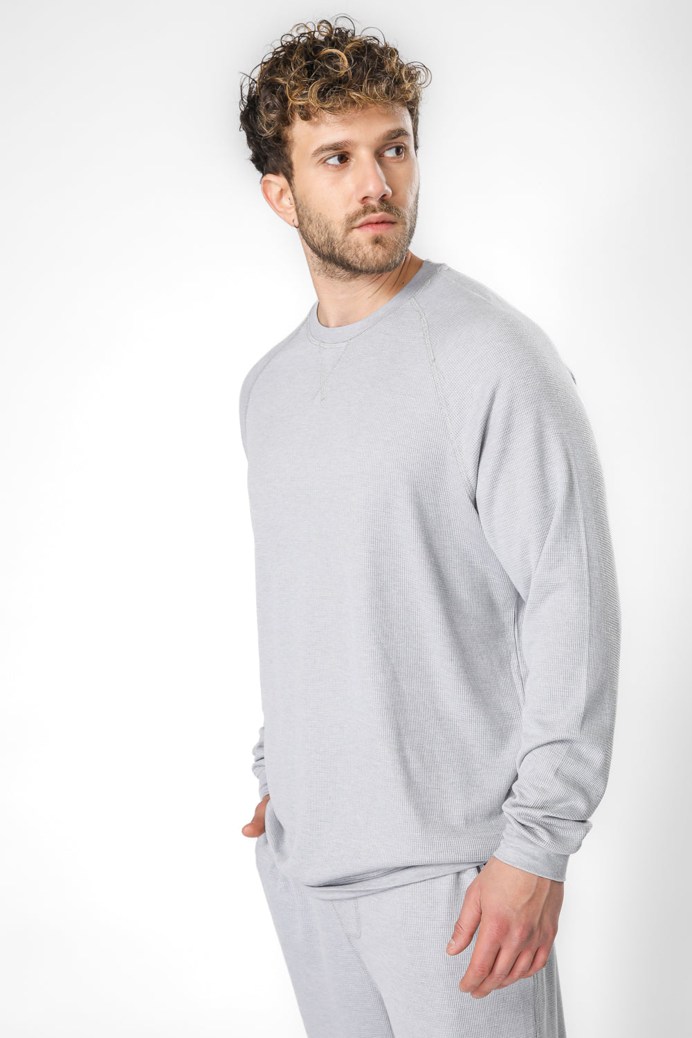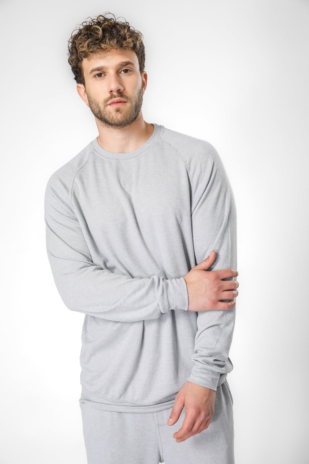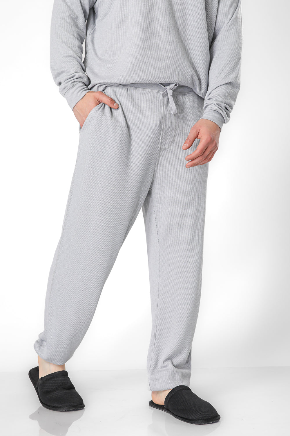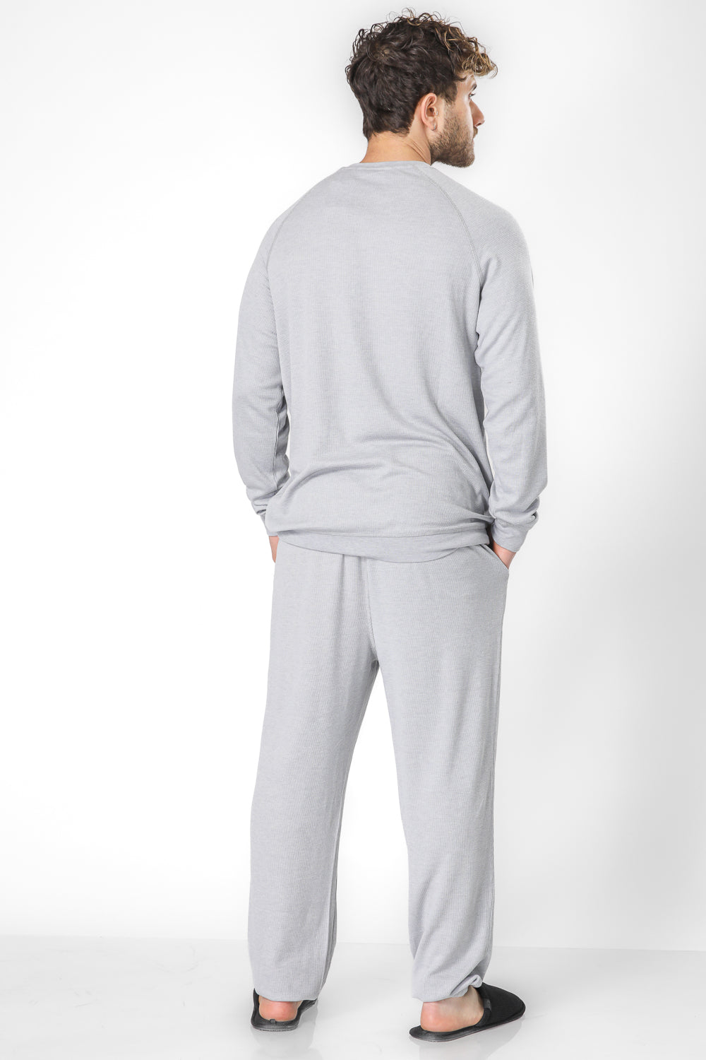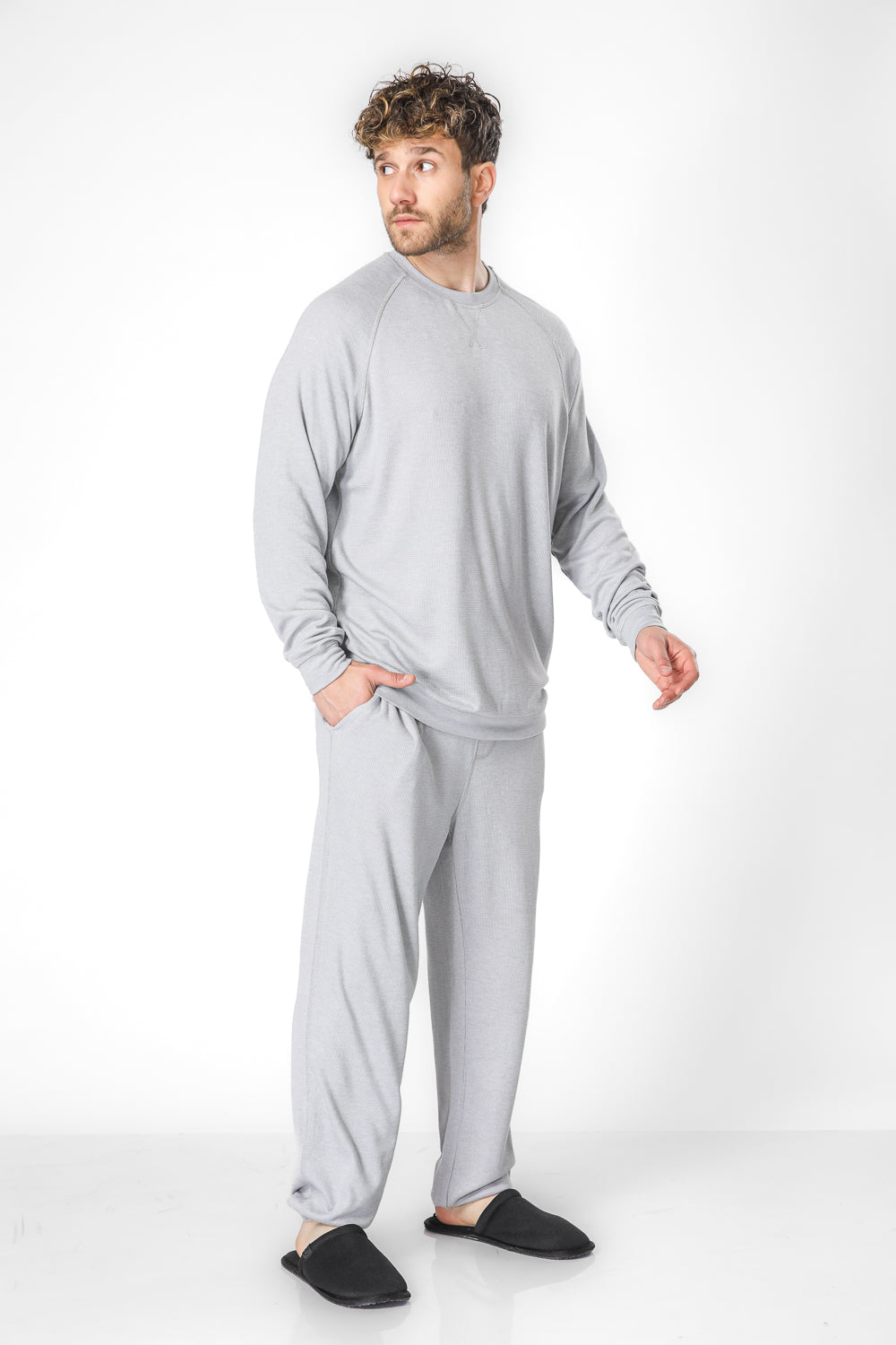 חליפת פנאי לגבר מבית המותג DELTA העשויה מבד נעים ורך בטקסטורת וופל. חולצה עם צווארון עגול, שרוולים ארוכים וסיומת מנג’ט ומכנסיים ארוכים עם גומי במותניים, כיסים וסיומת מנג’ט.