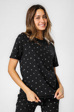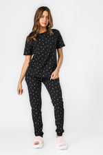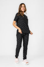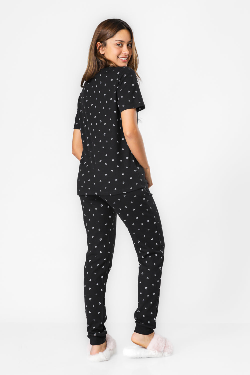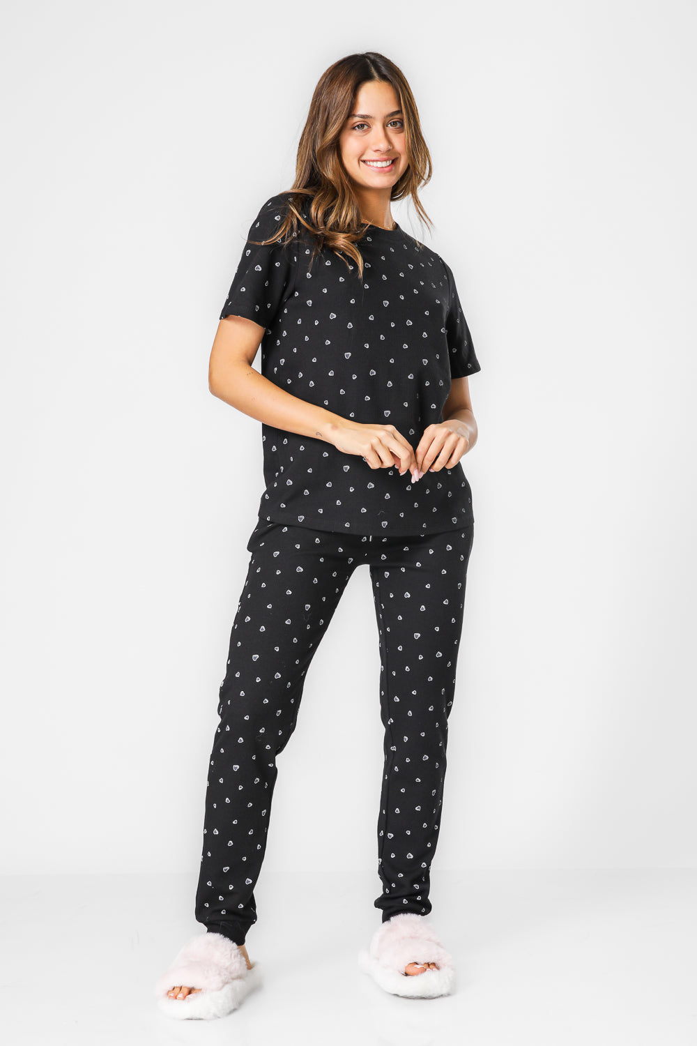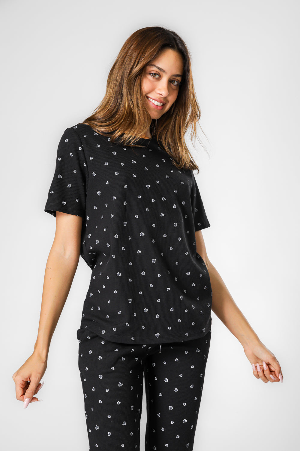 סט פיג'מת מעבר לנשים מבית המותג DELTA בטקסטורת וופל עם הדפס לבבות. חולצה עם צווארון עגול ושרוולים קצרים, ומכנסיים ארוכים עם גומי במותניים, כיסים שרוכי קשירה וסיומת מנג’ט.