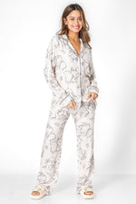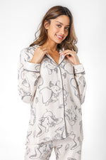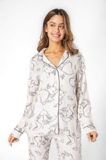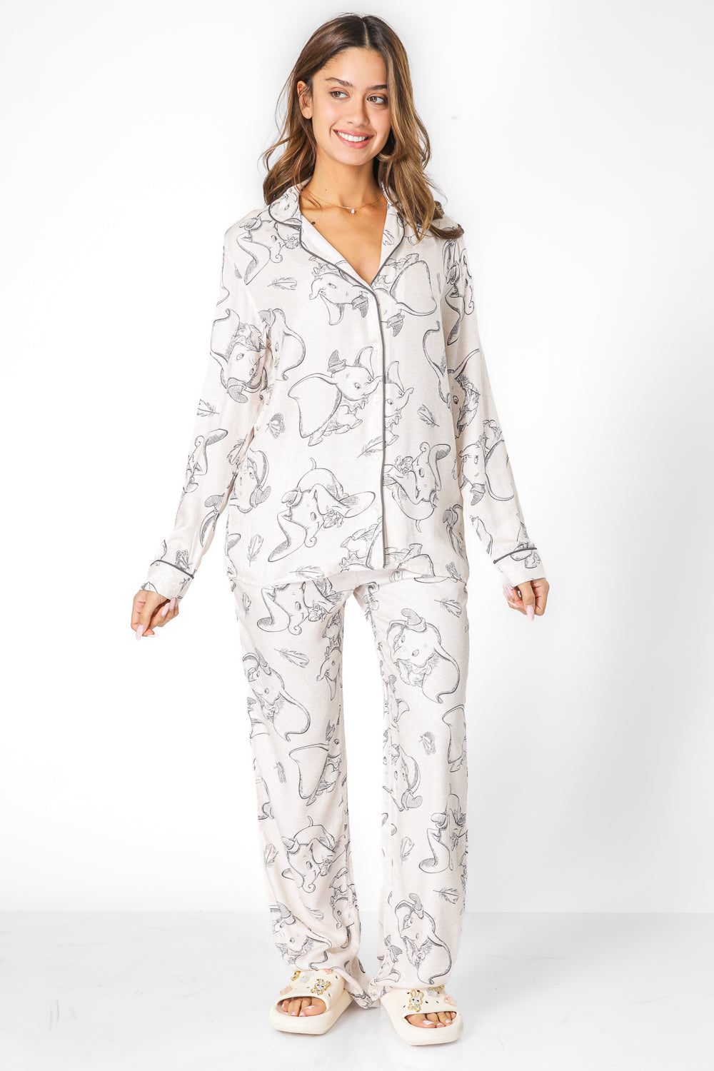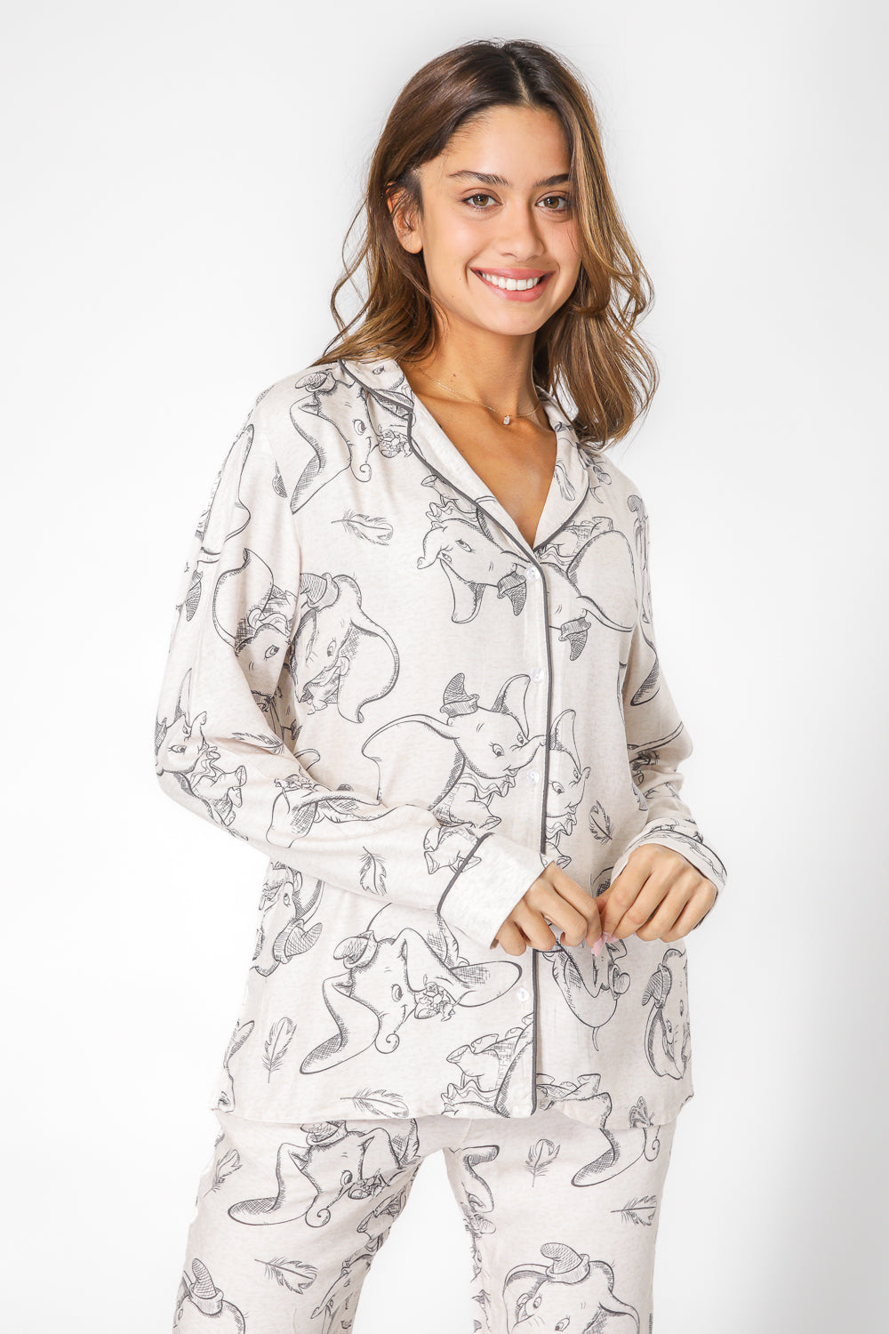 סט פיג'מה לנשים מבית המותג DELTA העשויה מבד אריג דק ונעים בהדפס של דמבו. חולצה מכופתרת עם צווארון משולשים ושרוולים ארוכים ומכנסיים ארוכים בגזרה ישרה עם כיסים, גומי במותניים ושרוכי קשירה