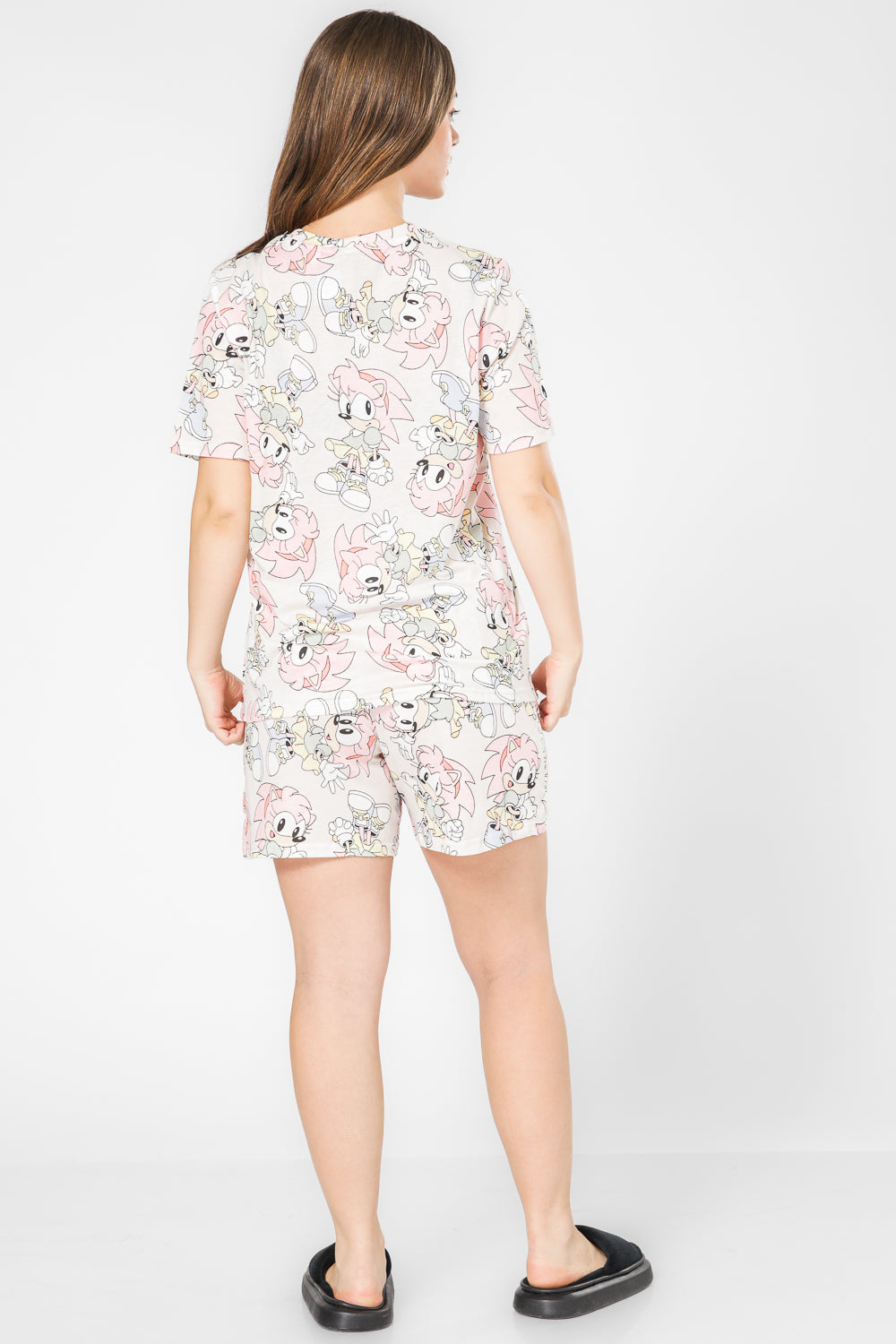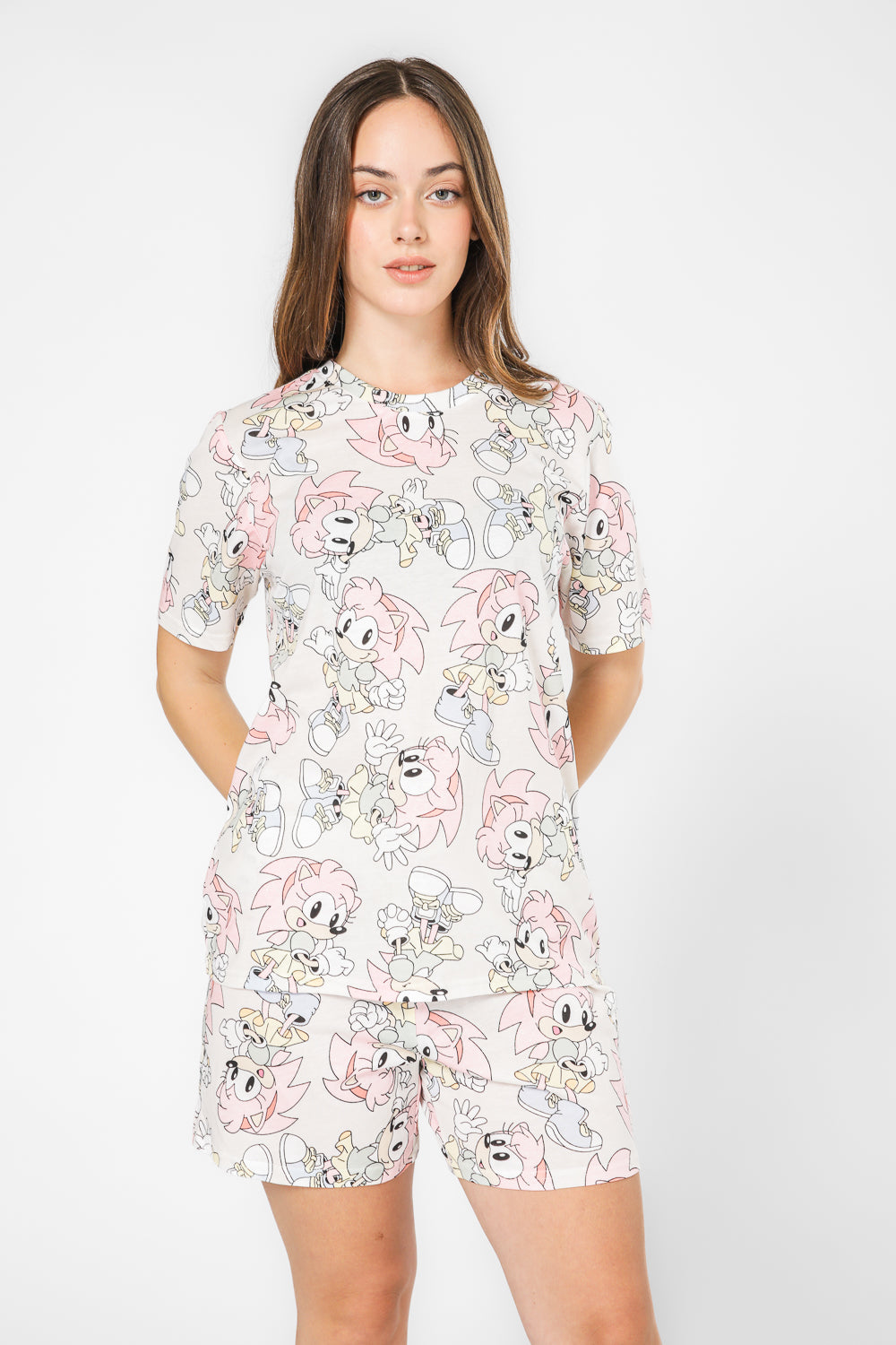 סט פיג'מת קיץ בשילוב הדפס צבעוני של סוניק מבית המותג DELTA הכולל חולצה עם צווארון עגול ושרוולים קצרים ומכנסיים קצרים תואמים עם גומי במותניים ושרוכי קשירה.