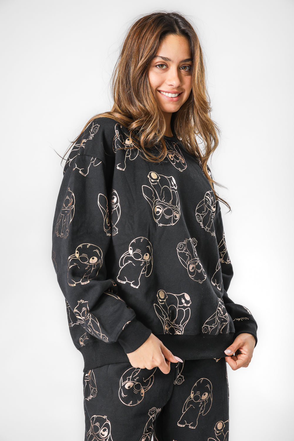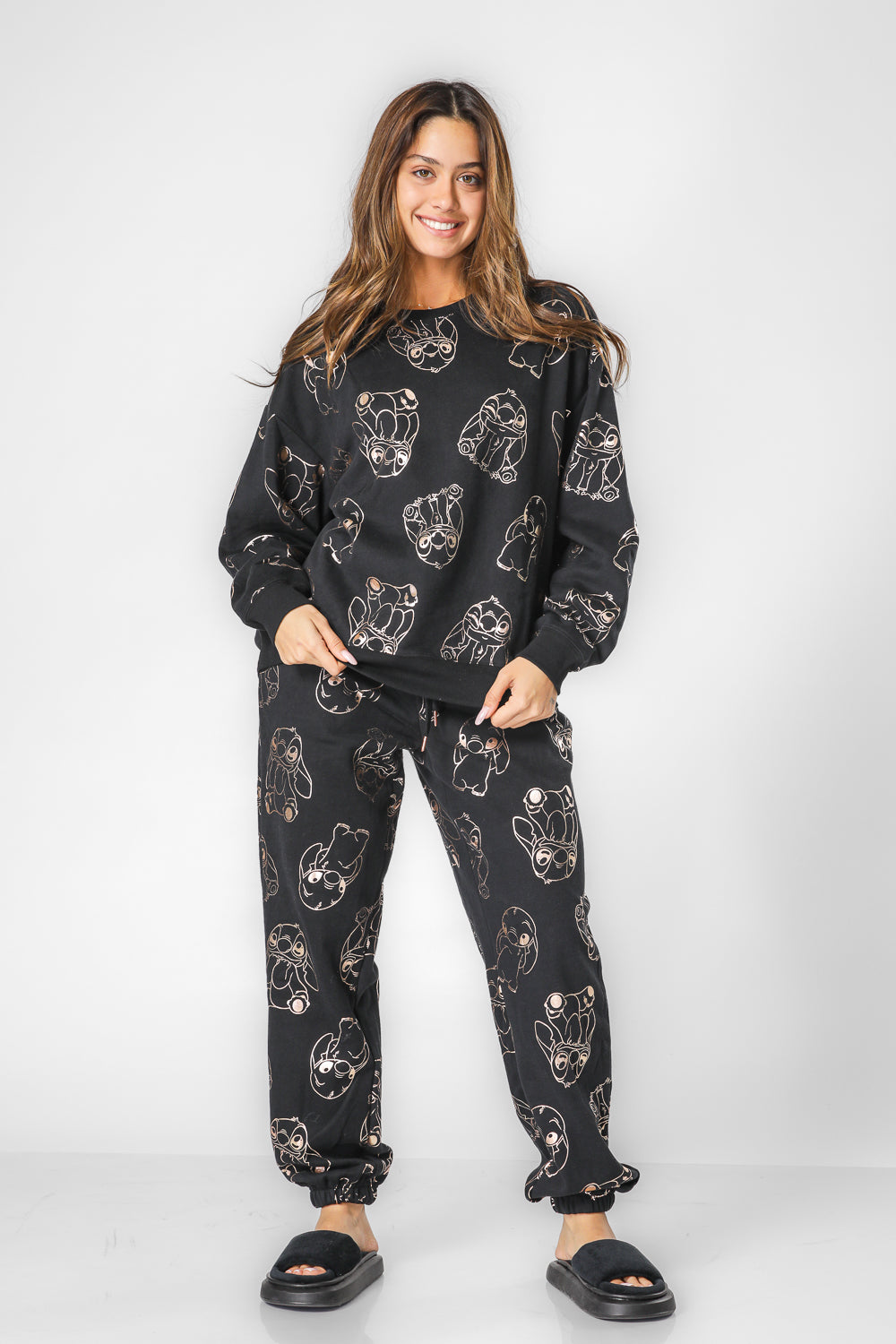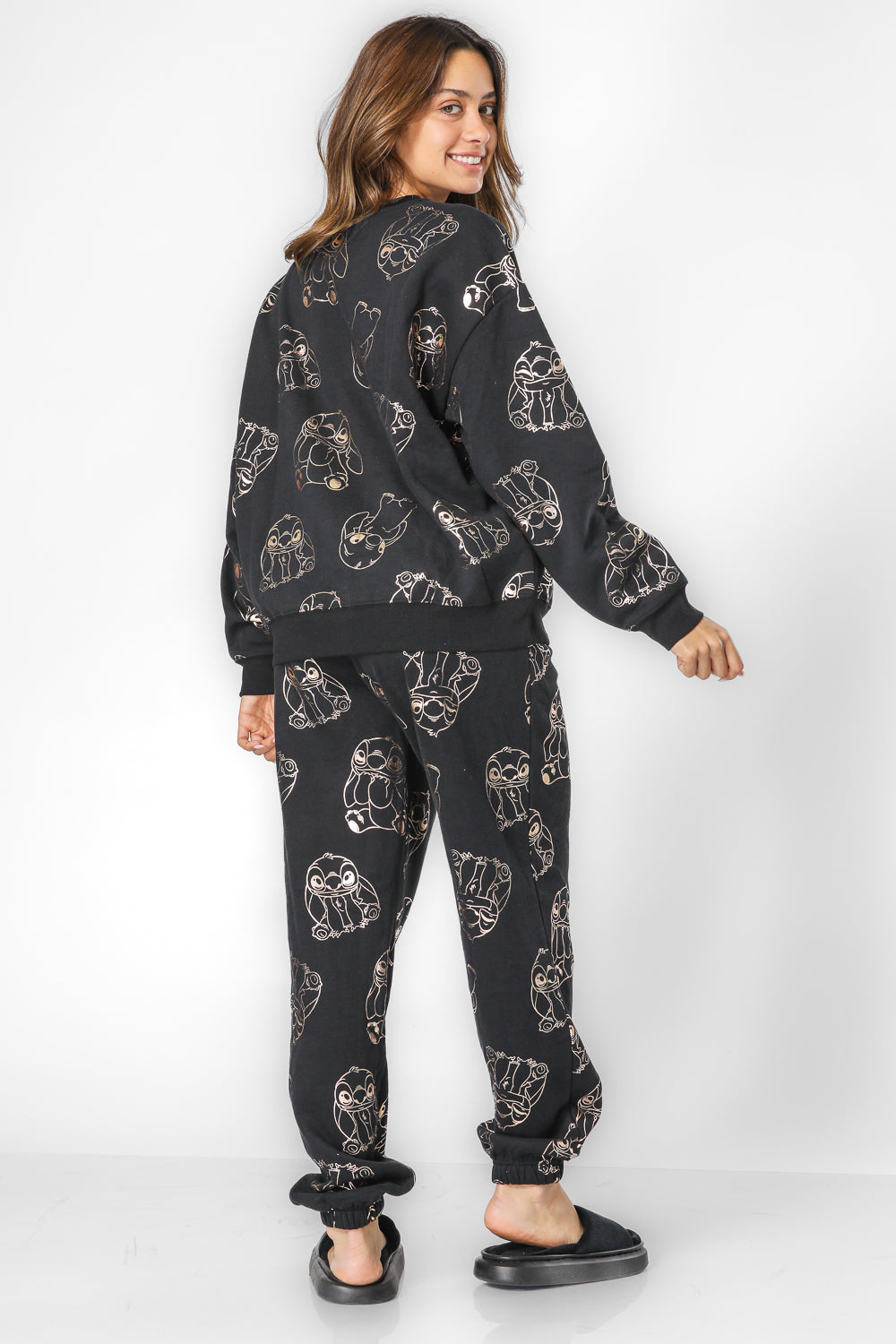 סט פיג’מת חורף לנשים מבית המותג DELTA העשוי מבד פוטר רך ומחמם עם הדפס של סטיץ’. הסט מורכב מחולצה עם צווארון עגול ושרוולים ארוכים עם סיומת מנג’ט ומכנסיים ארוכים עם גומי במותניים וסיומת מנג’ט.