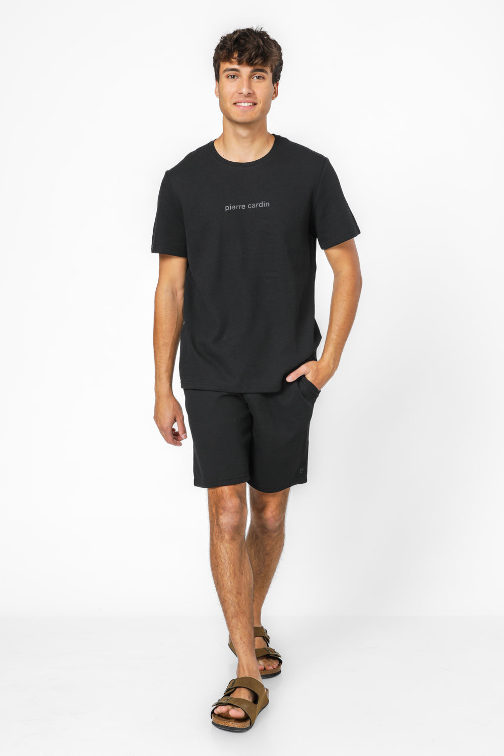 סט פנאי קצר בטקסטורת וופל עם הדפס הלוגו של PIERRE CARDIN. חולצת טי עם מפתח עגול בצוואר, ומכנסיים קצרים עם גומי במותניים, כיס אחורי, כיסים בצדדים ושרוכי קשירה.