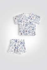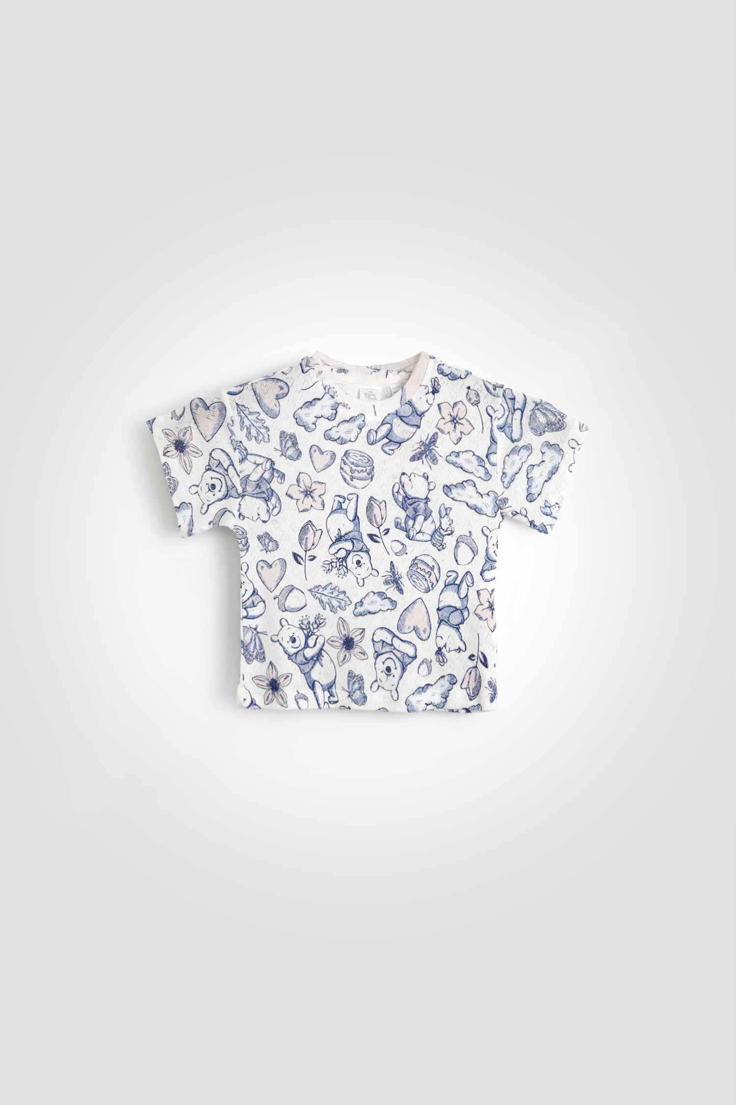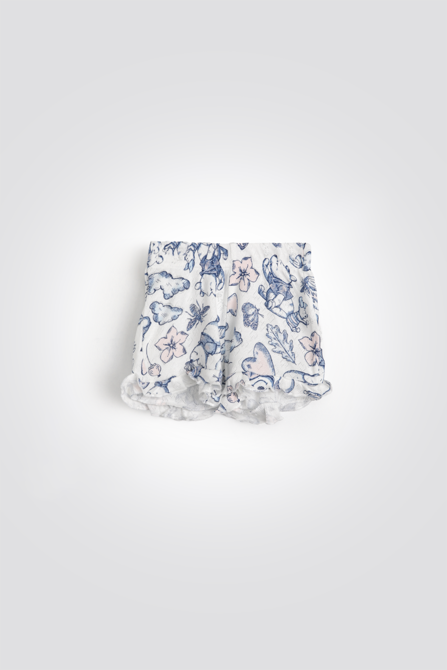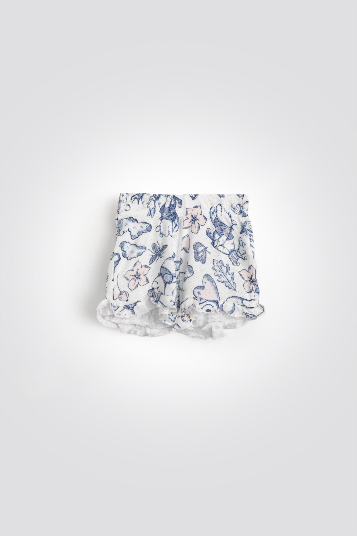 פיג'מת קצרה לילדות מבית המותג DELTA העשויה מבד בטקסטורת פוינטל נעימה עם הדפס מתוק של פו הדוב. חולצה עם צווארון עגול ושרוולים קצרים, ומכנסיים קצרים תואמים עם גומי במותניים.