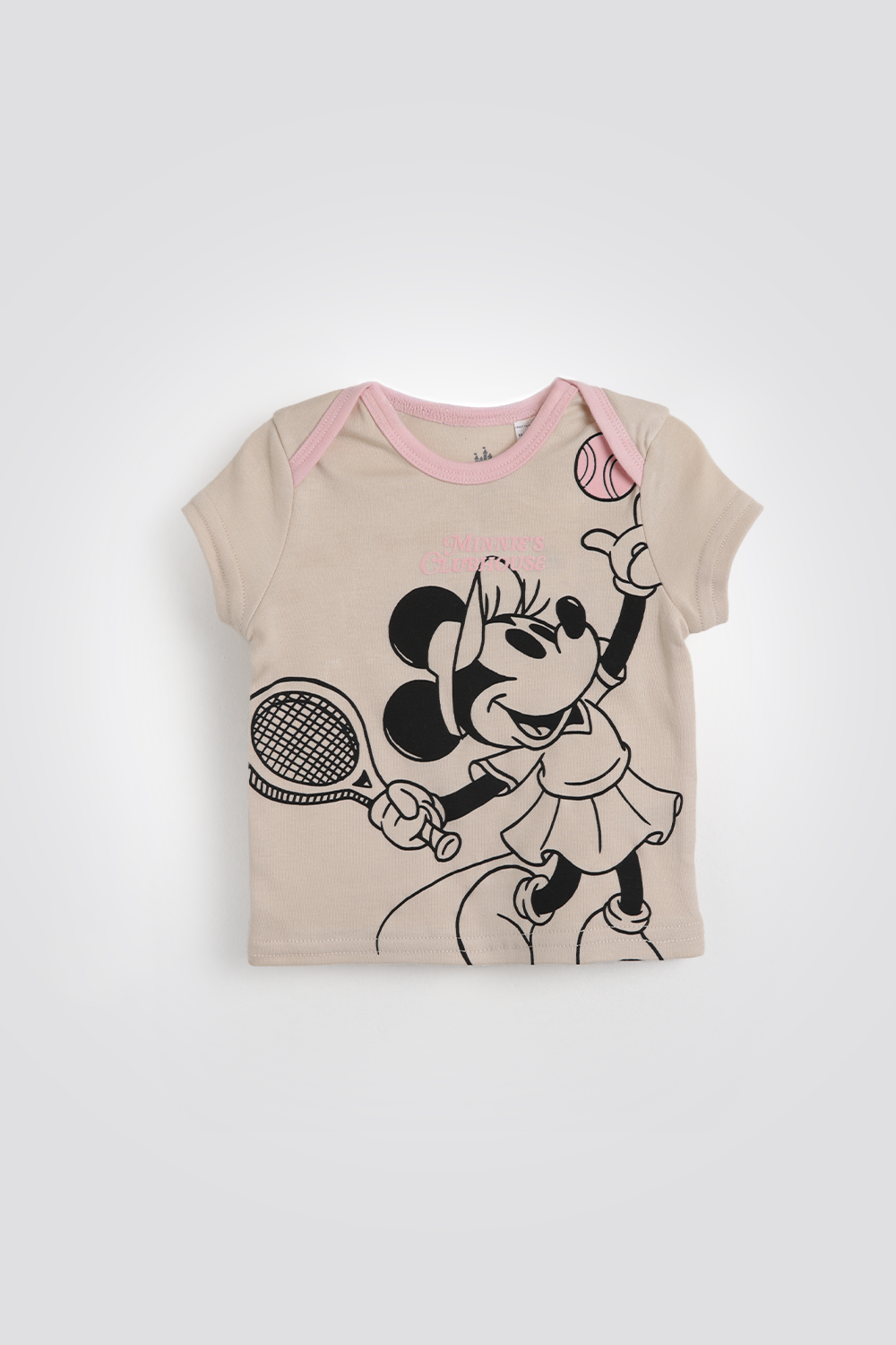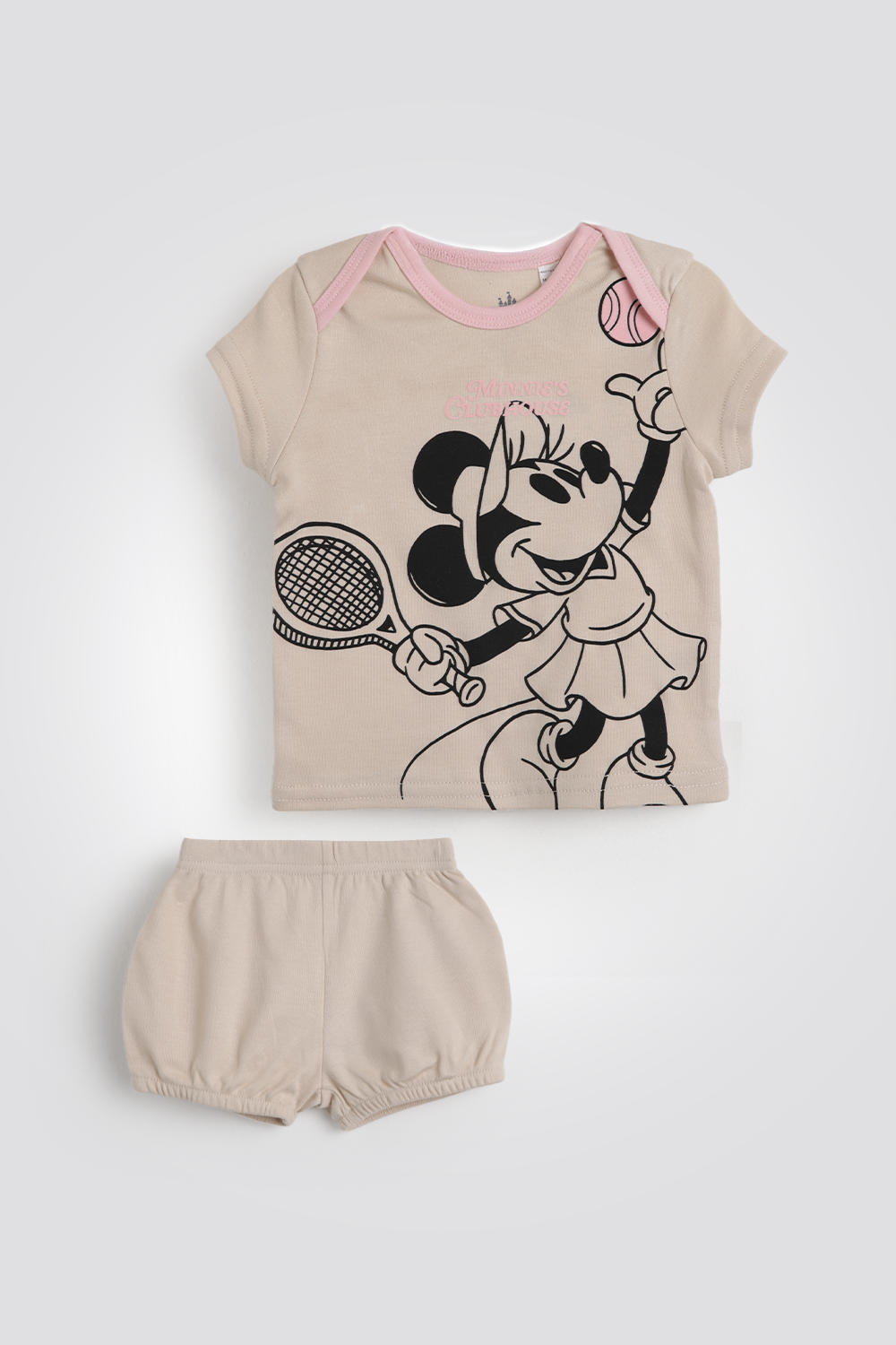 סט פיג'מת קיץ לתינוקות מבית המותג DELTA העשויה בד אינטרלוק נעים ודק עם הדפס מדליק של מיני מאוס. חולצה עם צווארון עגול, שרוולים קצרים ומכנסיים קצרים עם גומי במותניים.