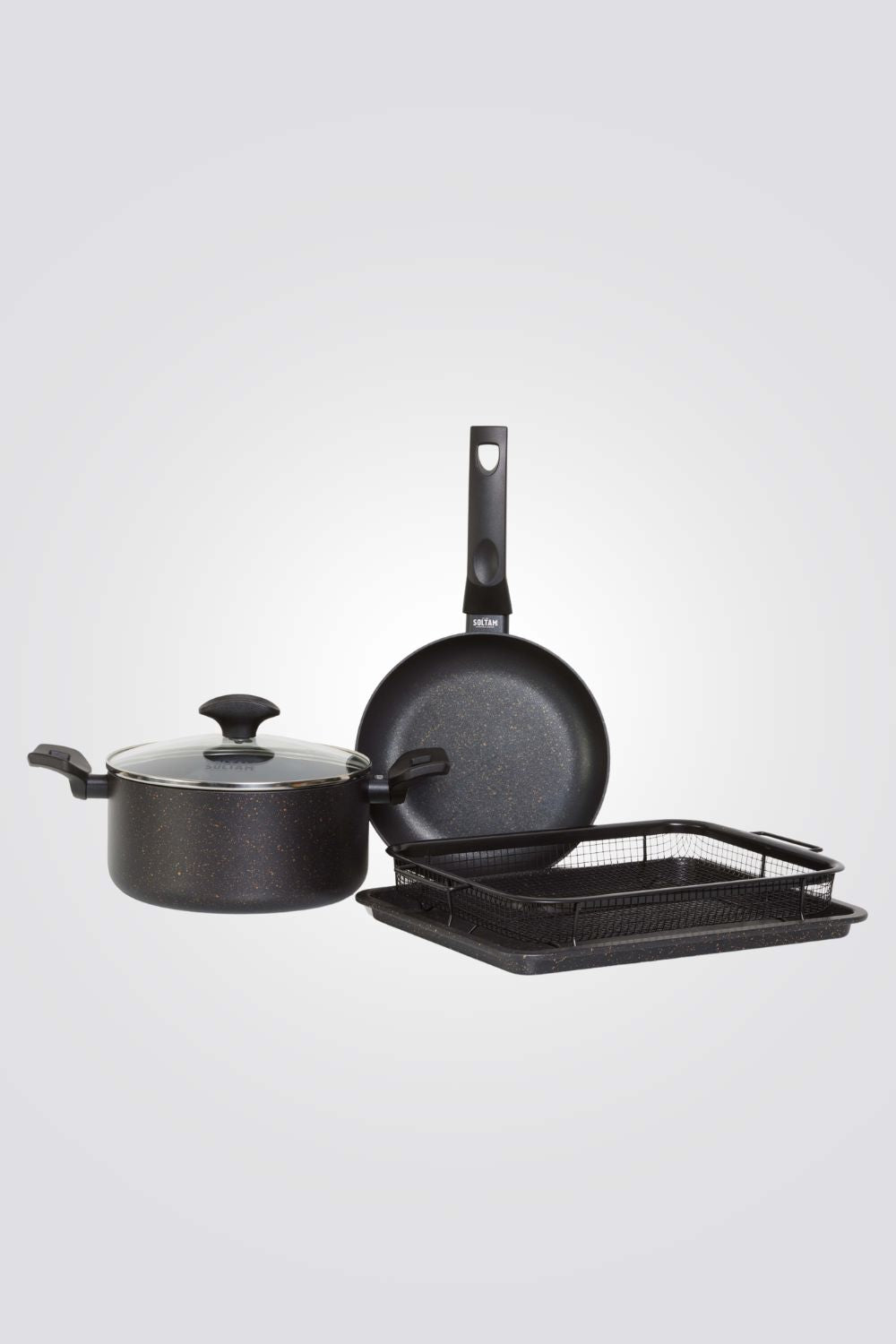 סט מבית המותג SOLTAM, המכיל סיר עם מכסה בגודל 24 ס"מ , מחבת עם ידית שחורה 24 ס"מ וקריספר המכיל רשת ותבנית .
