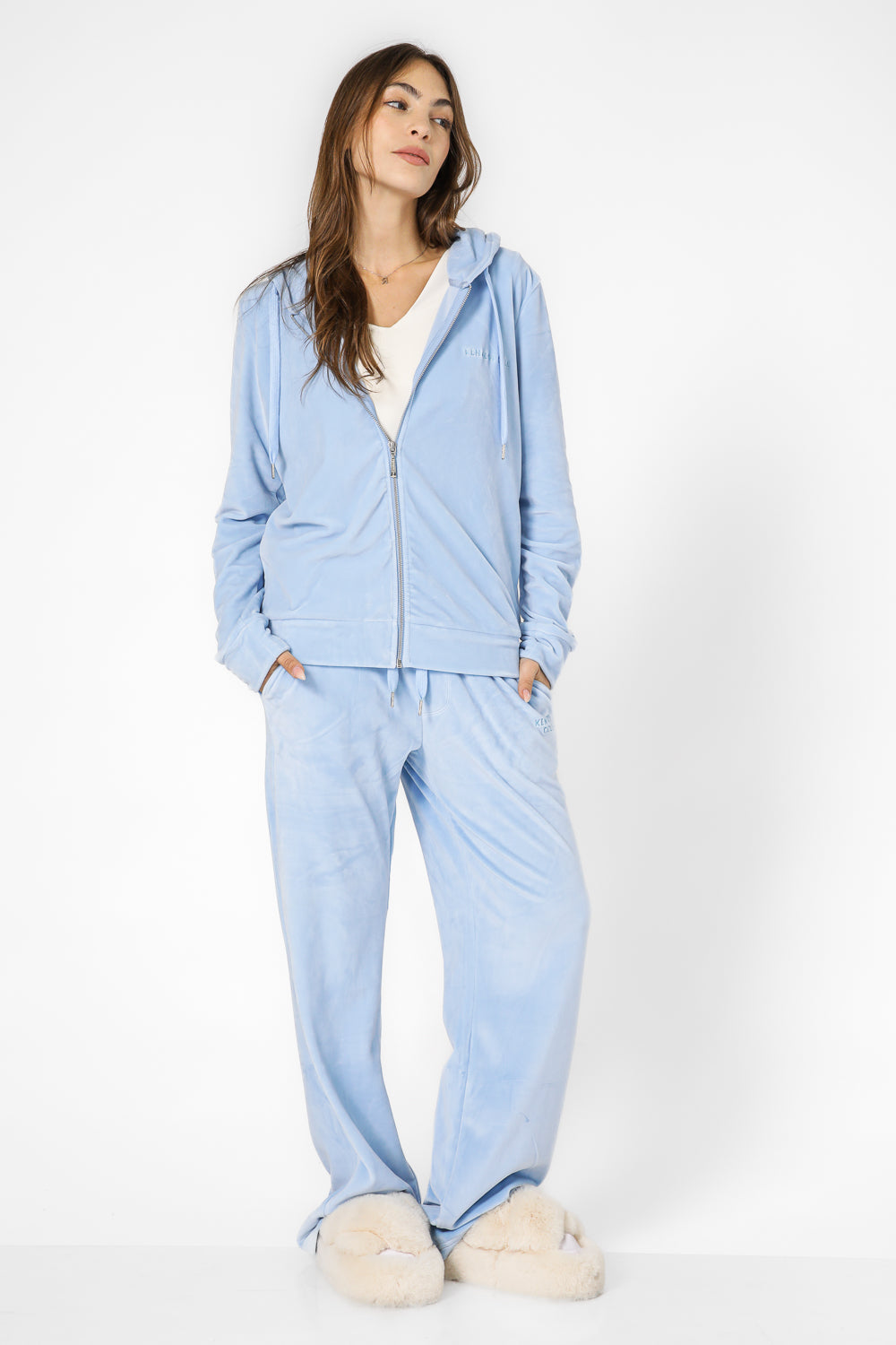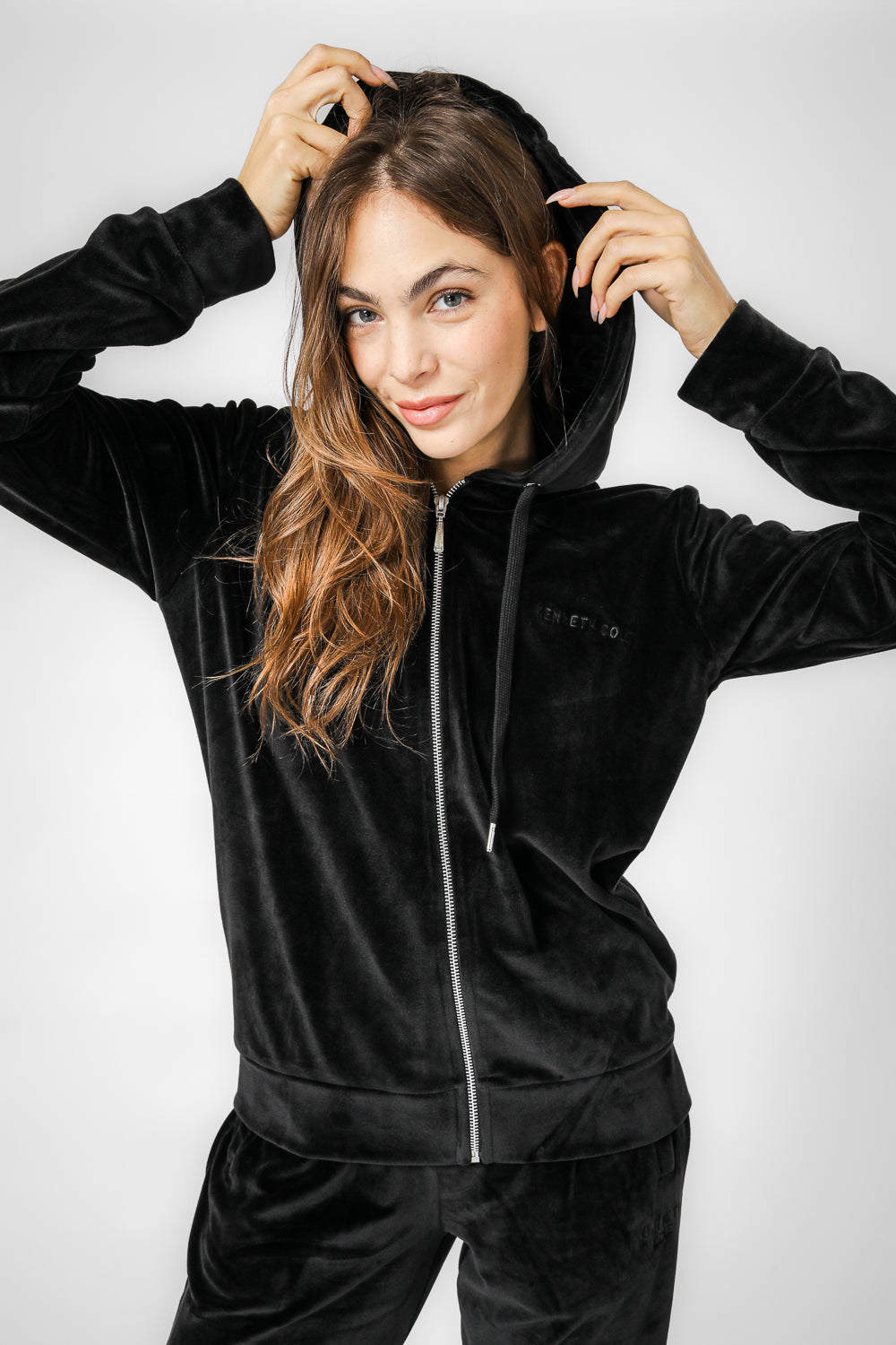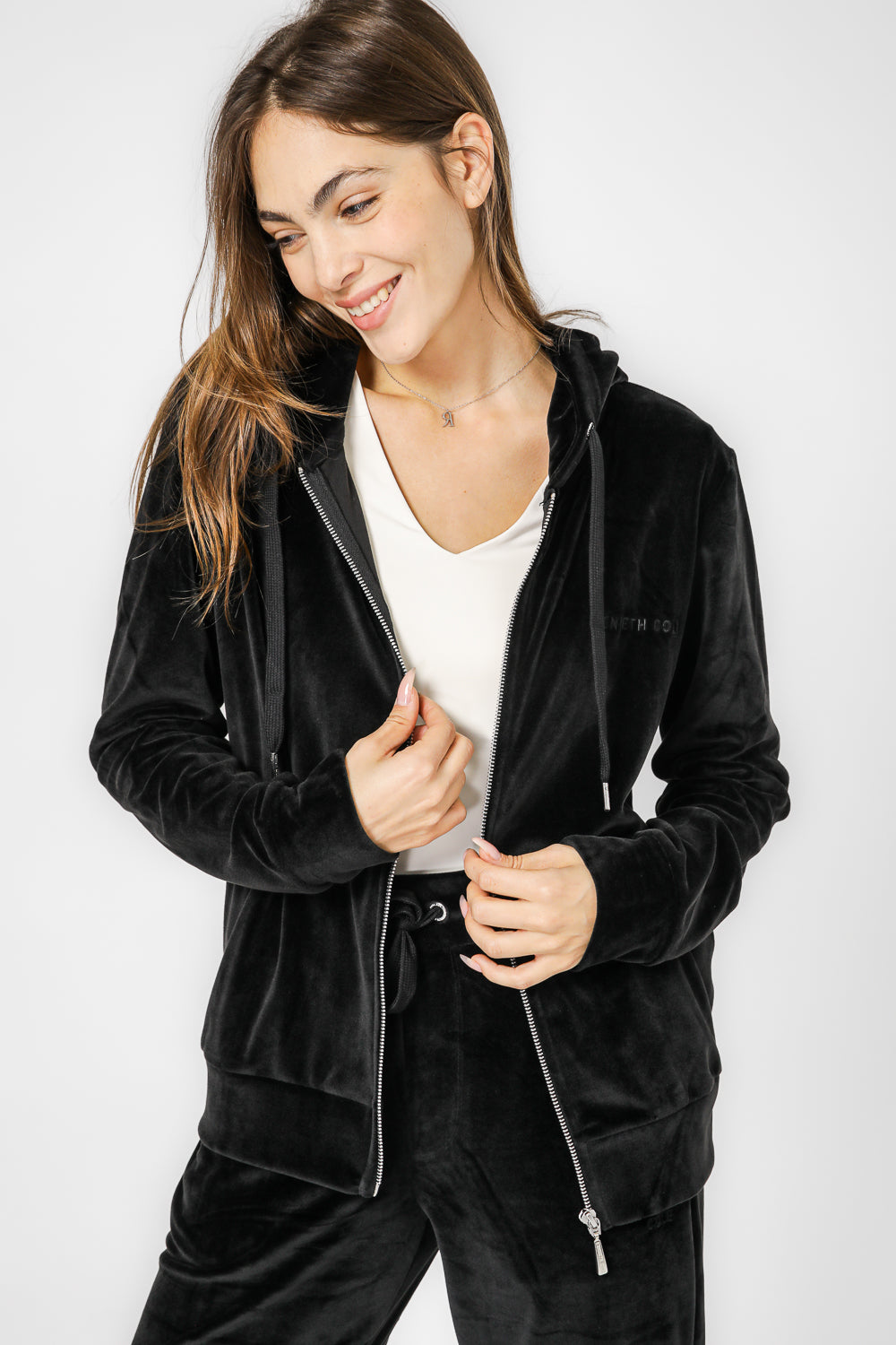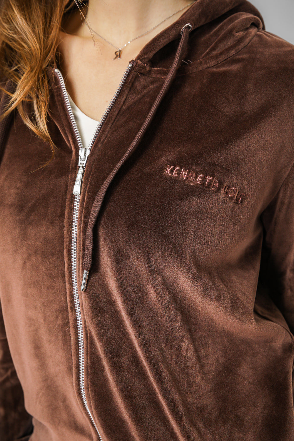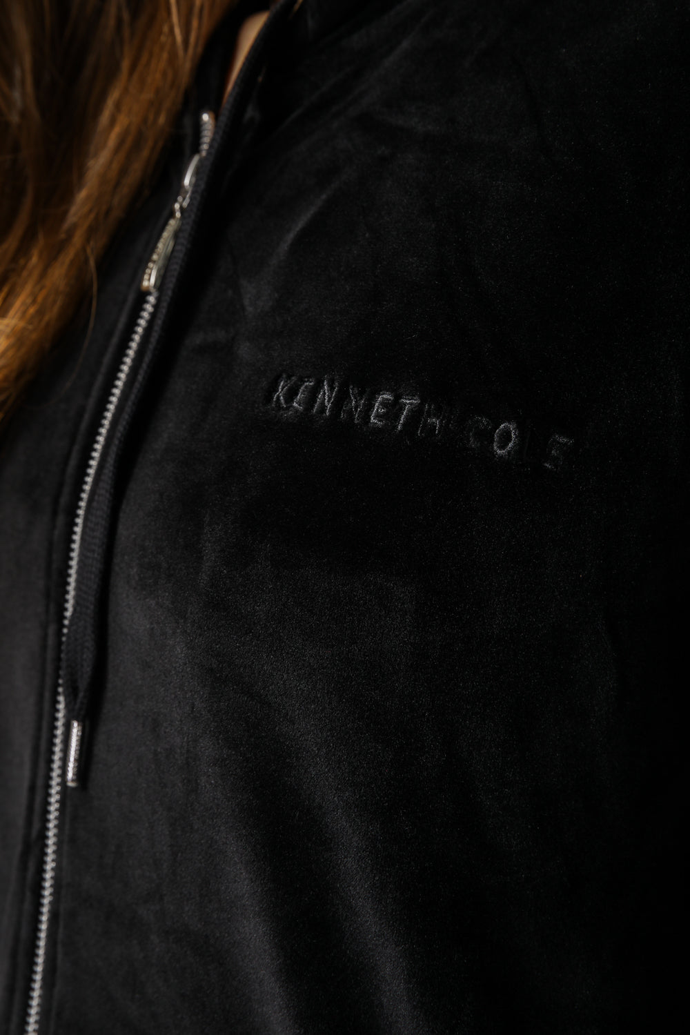 עליונית לנשים מבית המותג KENNETH COLE מבד קטיפה בגזרה קלאסית עם שרוולים ארוכים, כובע קפוצ'ון בשילוב שרוכים וסגירת רוכסן.