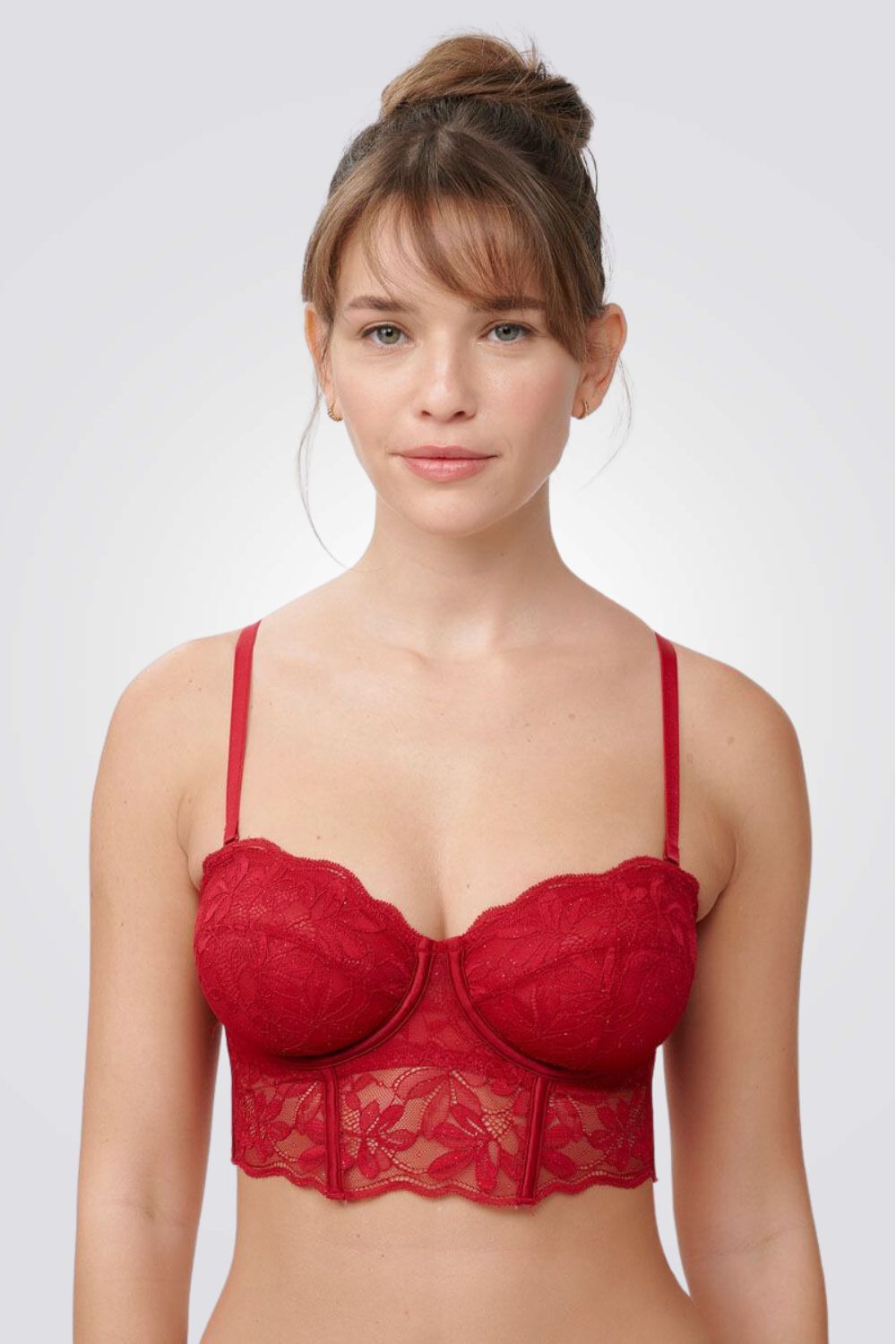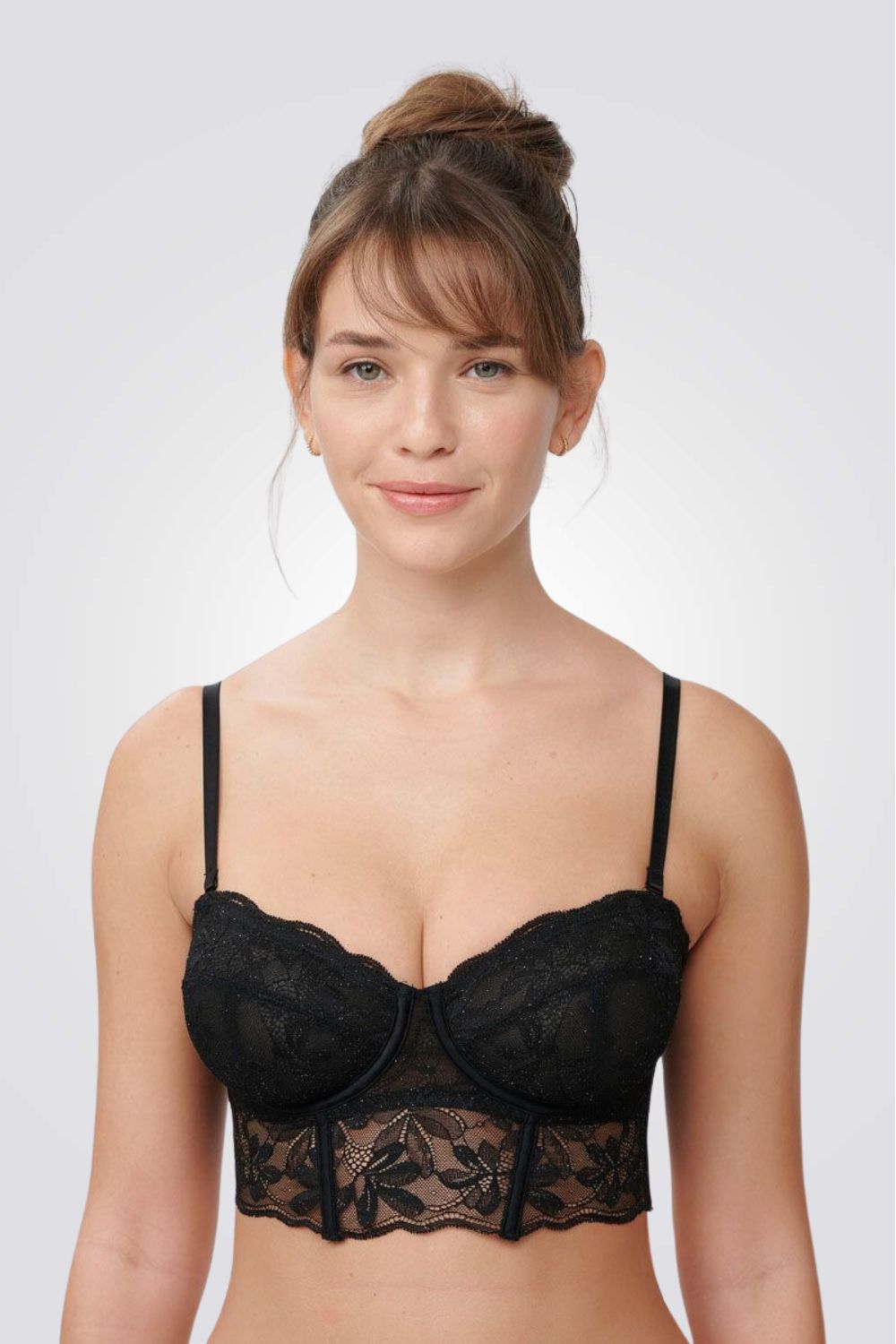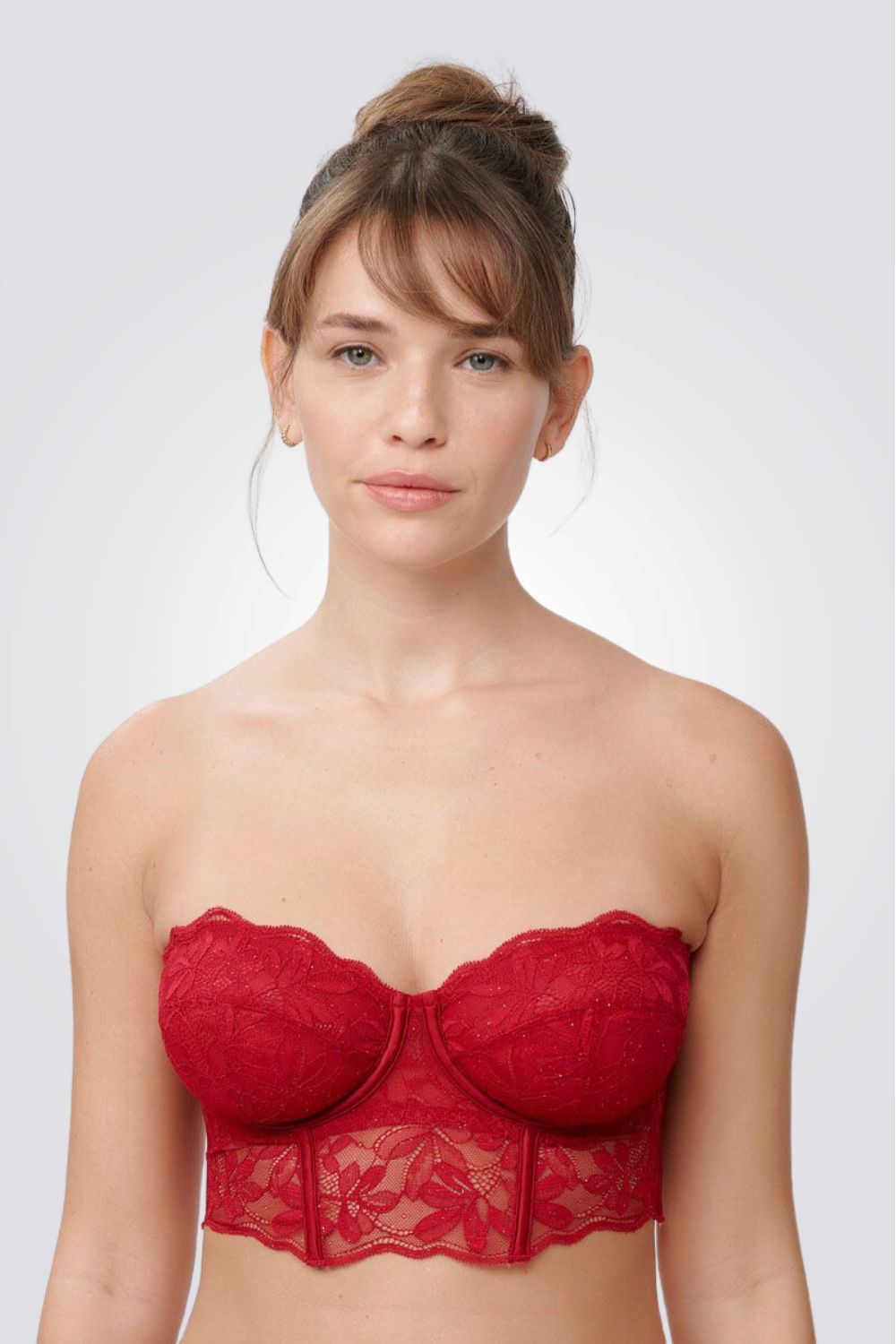 מחוך סטרפלס מבית המותג FEMINA, בעיצוב נוץ עם ברזלים לתמיכה, עשוי בד תחרה פרחוני, כתפיות נשלפות מתכווננות וסגירת קרסים.