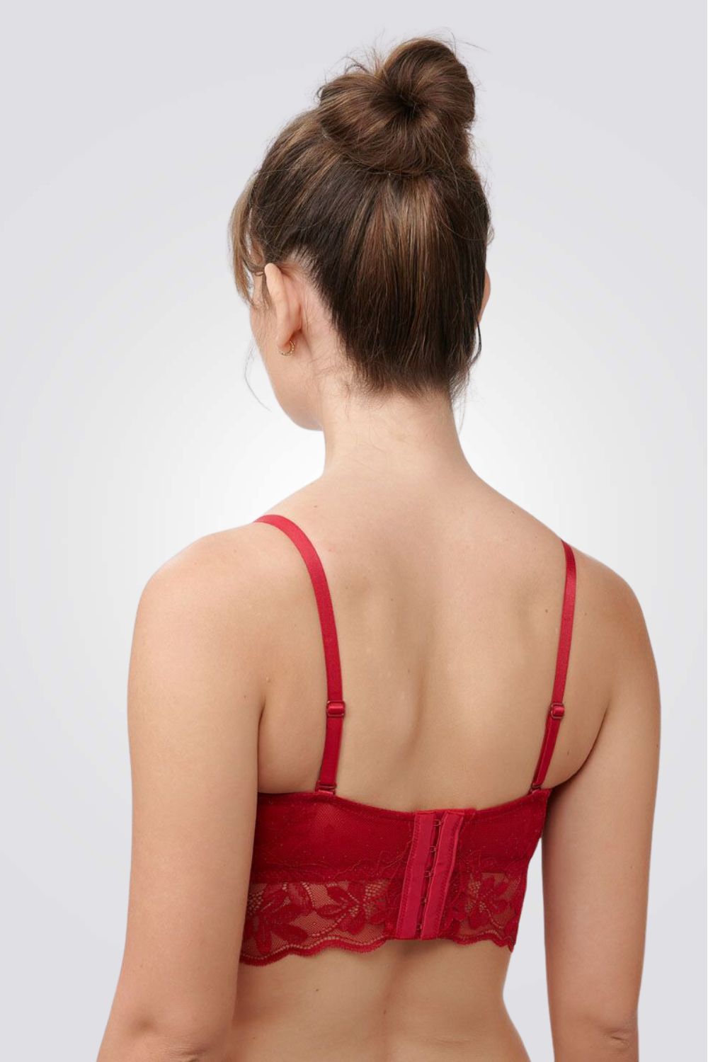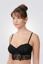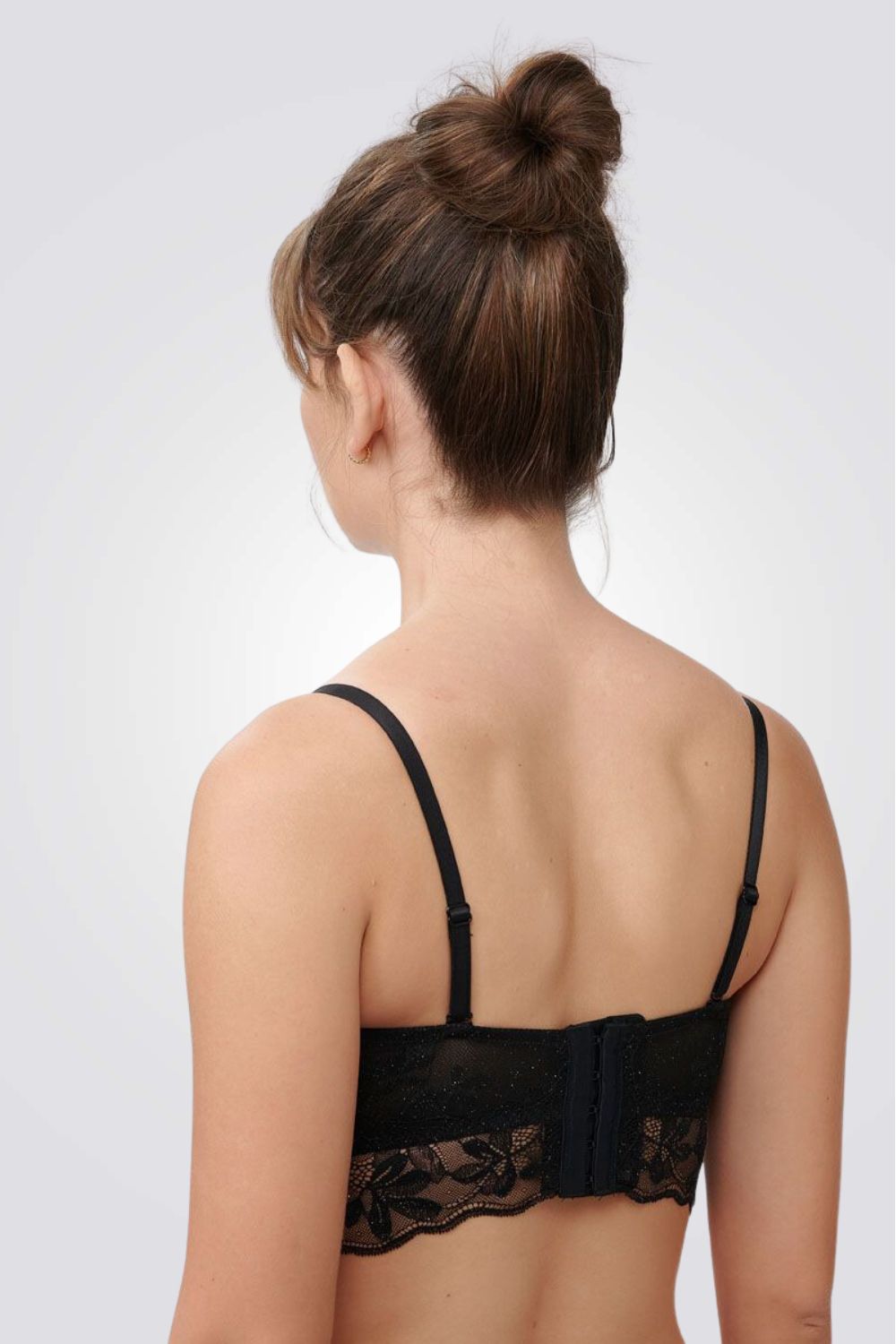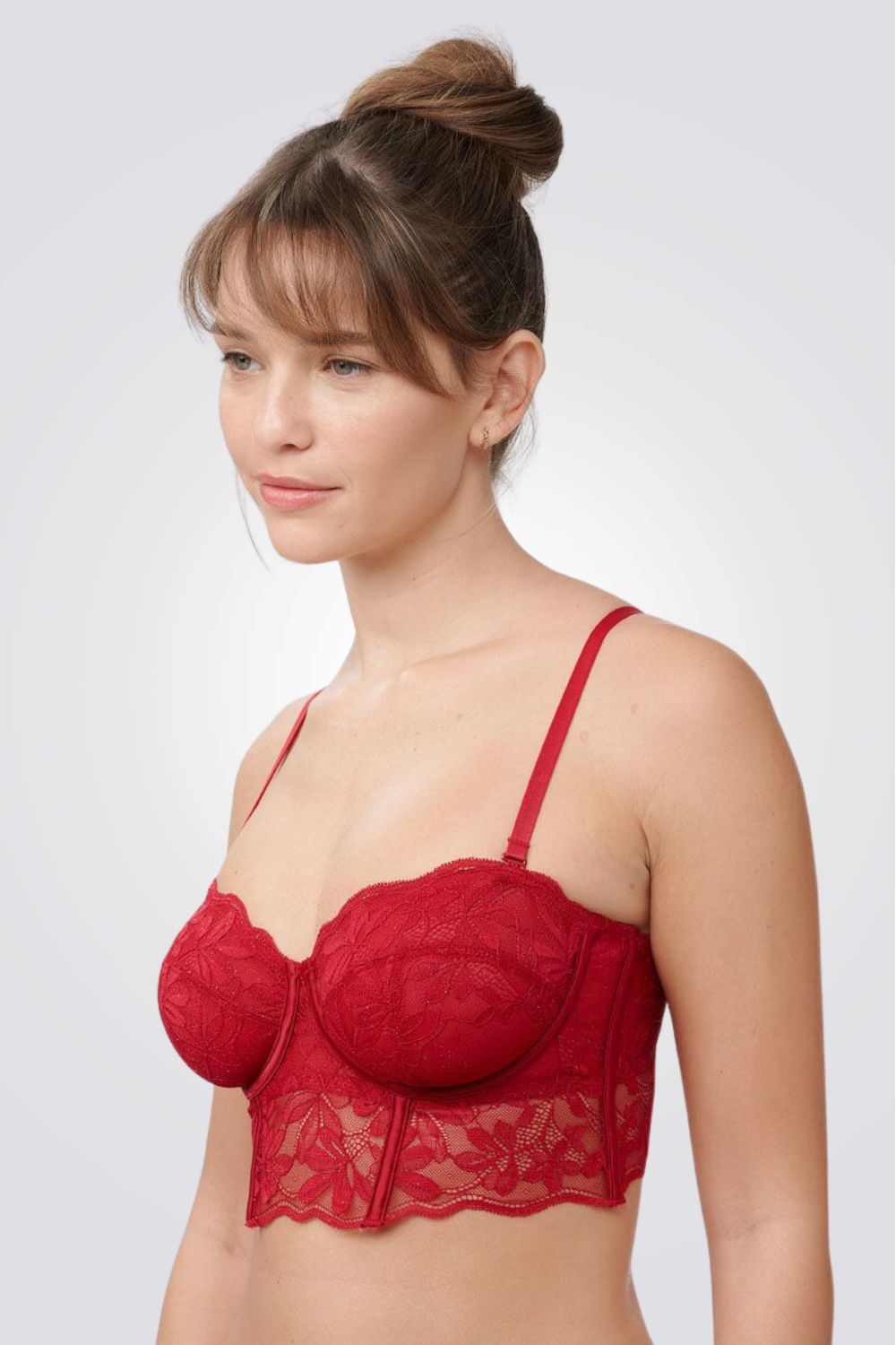מחוך סטרפלס מבית המותג FEMINA, בעיצוב נוץ עם ברזלים לתמיכה, עשוי בד תחרה פרחוני, כתפיות נשלפות מתכווננות וסגירת קרסים.