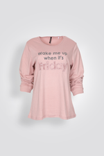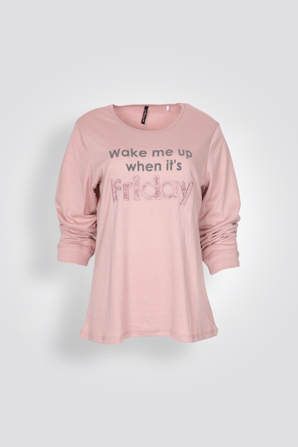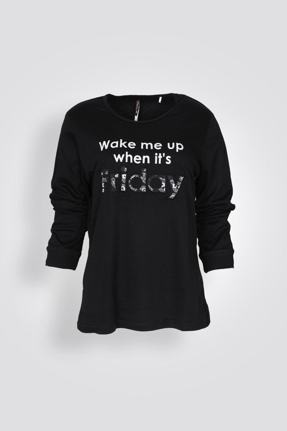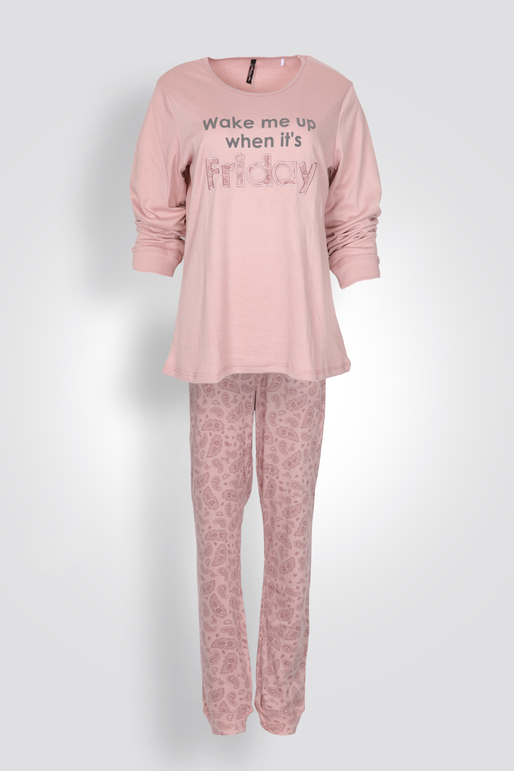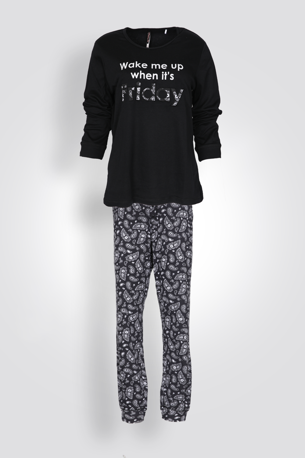 סט פיג’מה לנשים מבית המותג BONITA DE MAS העשויה בד אינטרלוק נעים ומיוחד עם הדפס מרכזי Wake me up when it's friday.