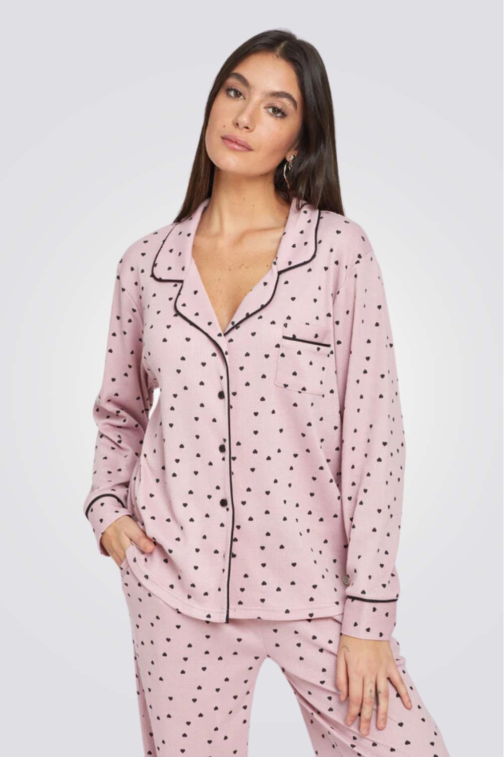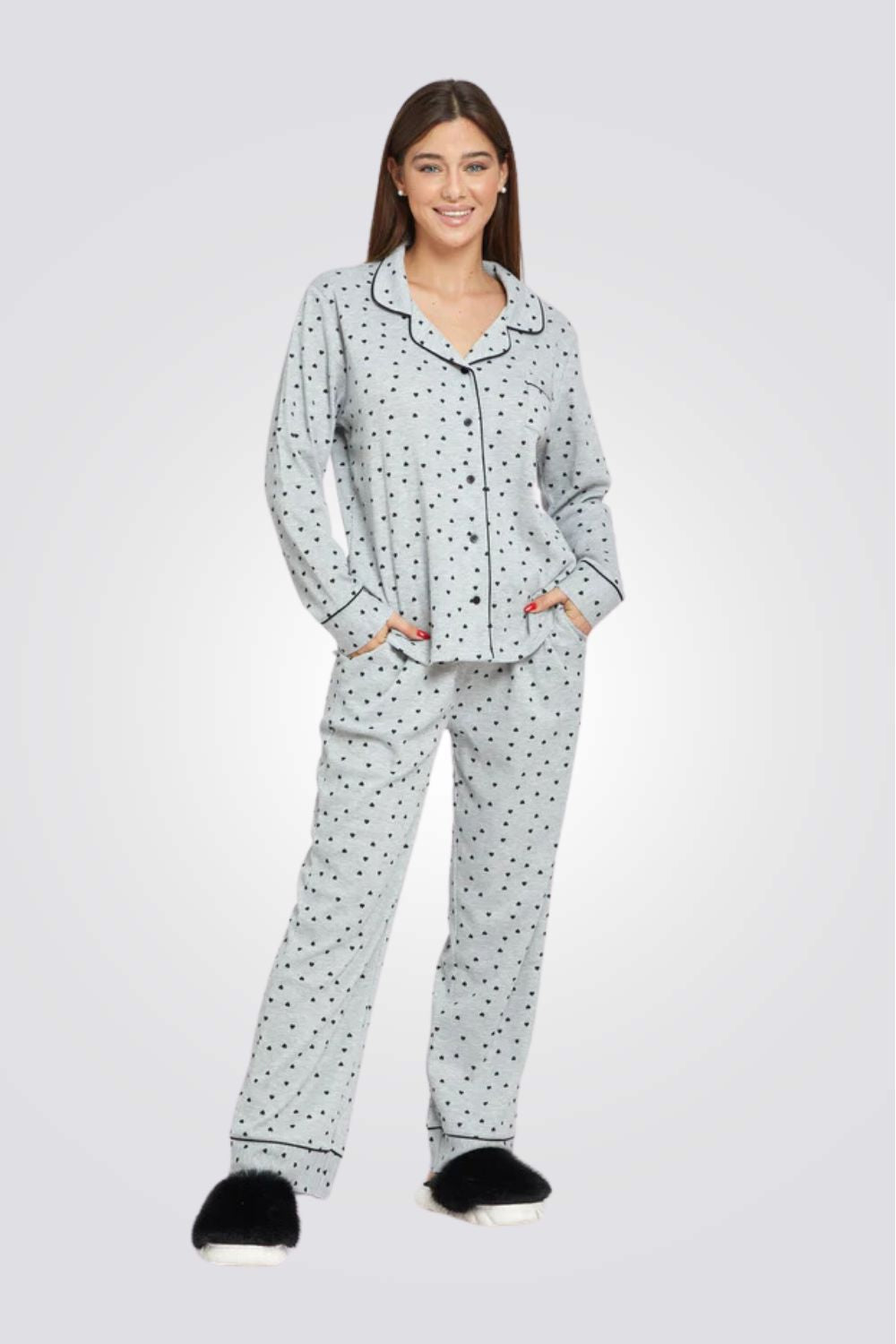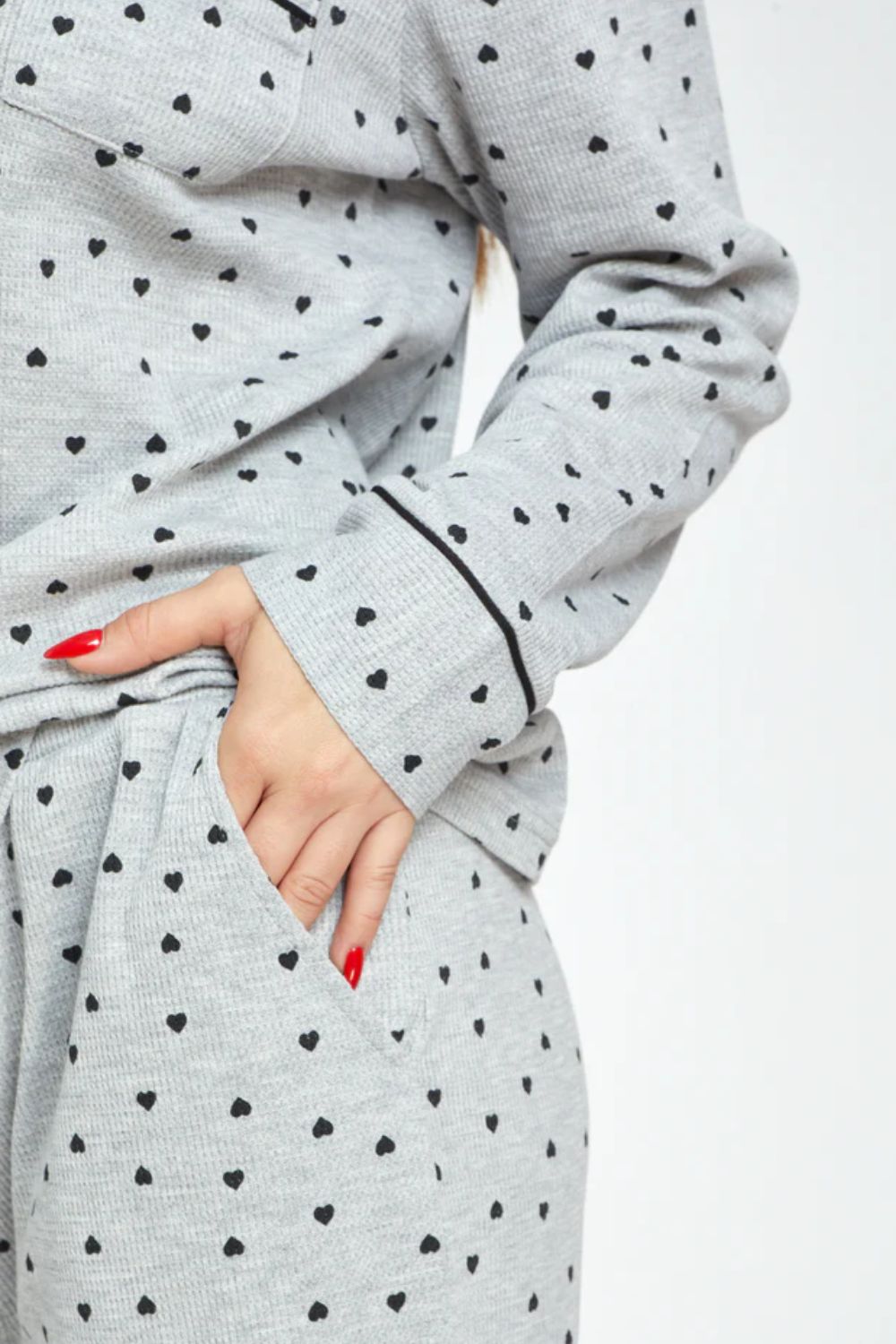 מורכבת מחולצה ארוכה מכופתרת עם כיס, בהדפס לבבות יחד עם מכנסיים ארוכים בגזרה ישרה עם שרוך קשירה ושני כיסים.