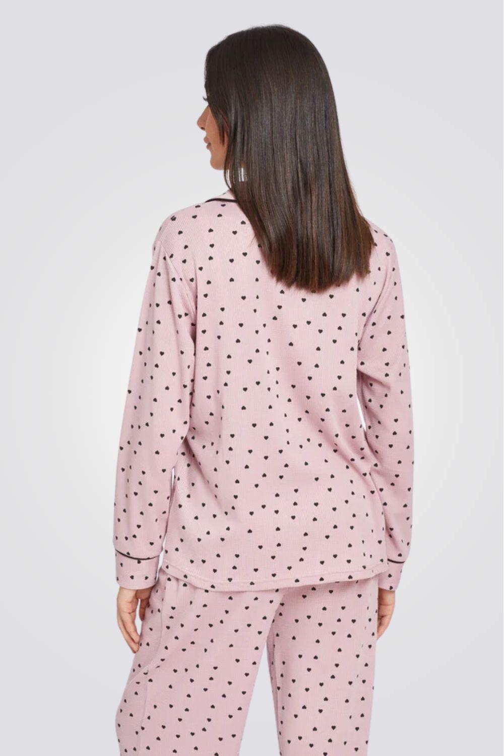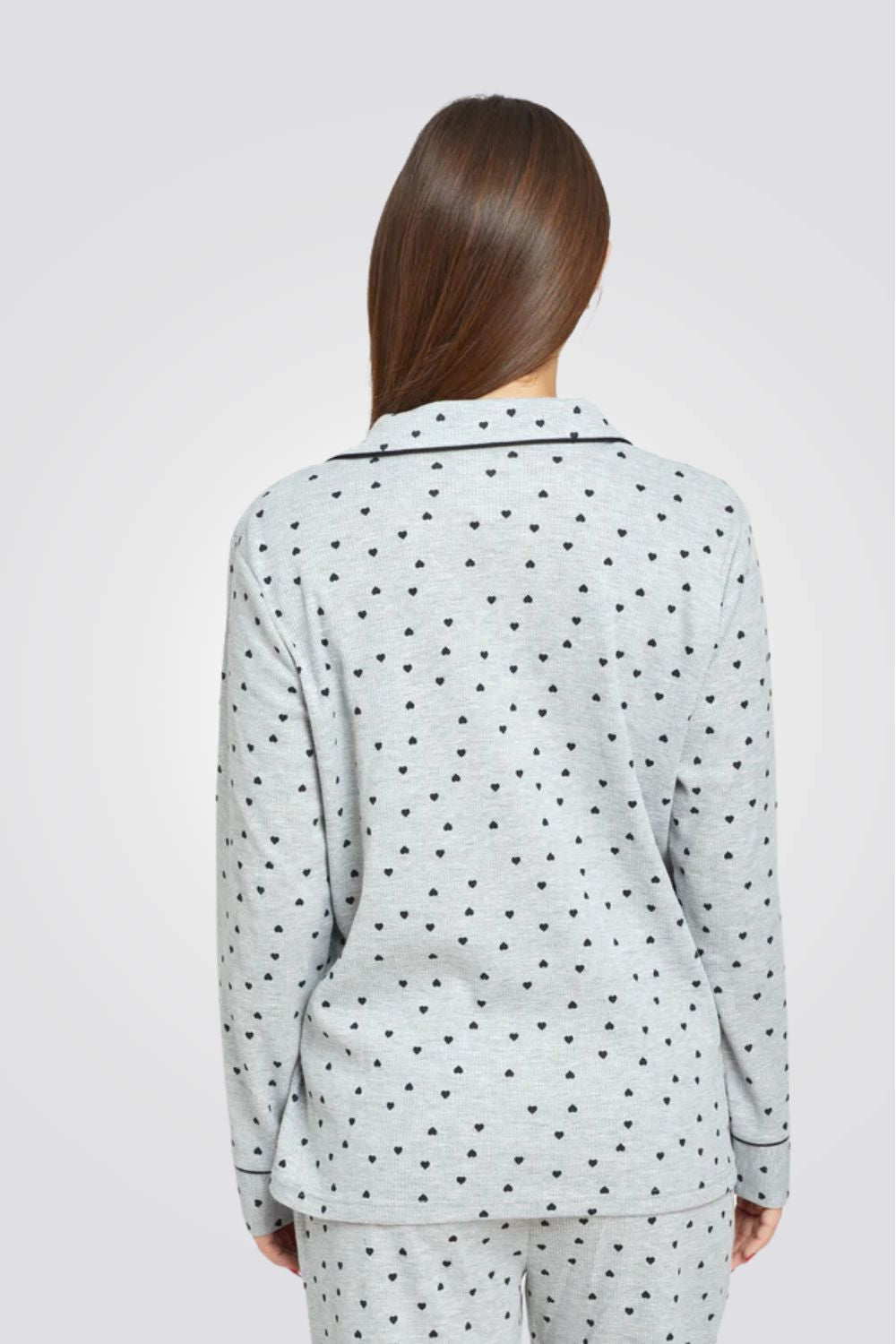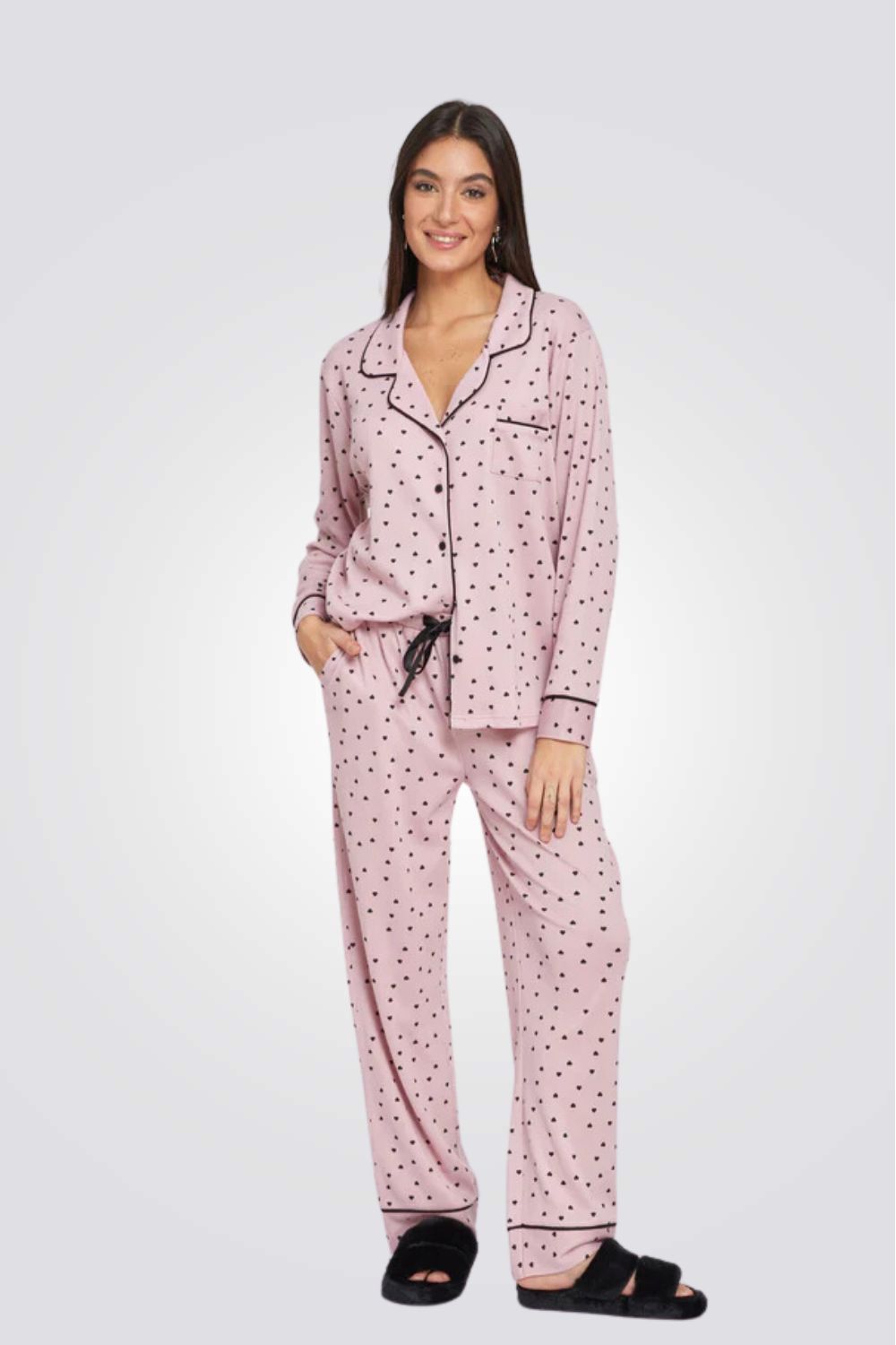 מורכבת מחולצה ארוכה מכופתרת עם כיס, בהדפס לבבות יחד עם מכנסיים ארוכים בגזרה ישרה עם שרוך קשירה ושני כיסים.