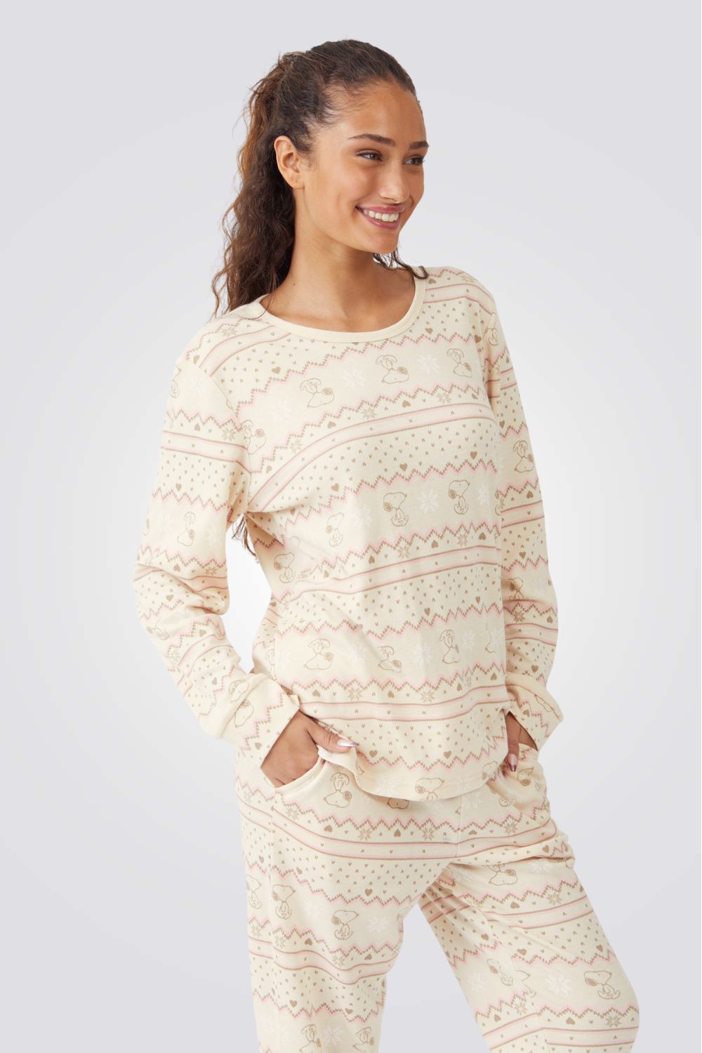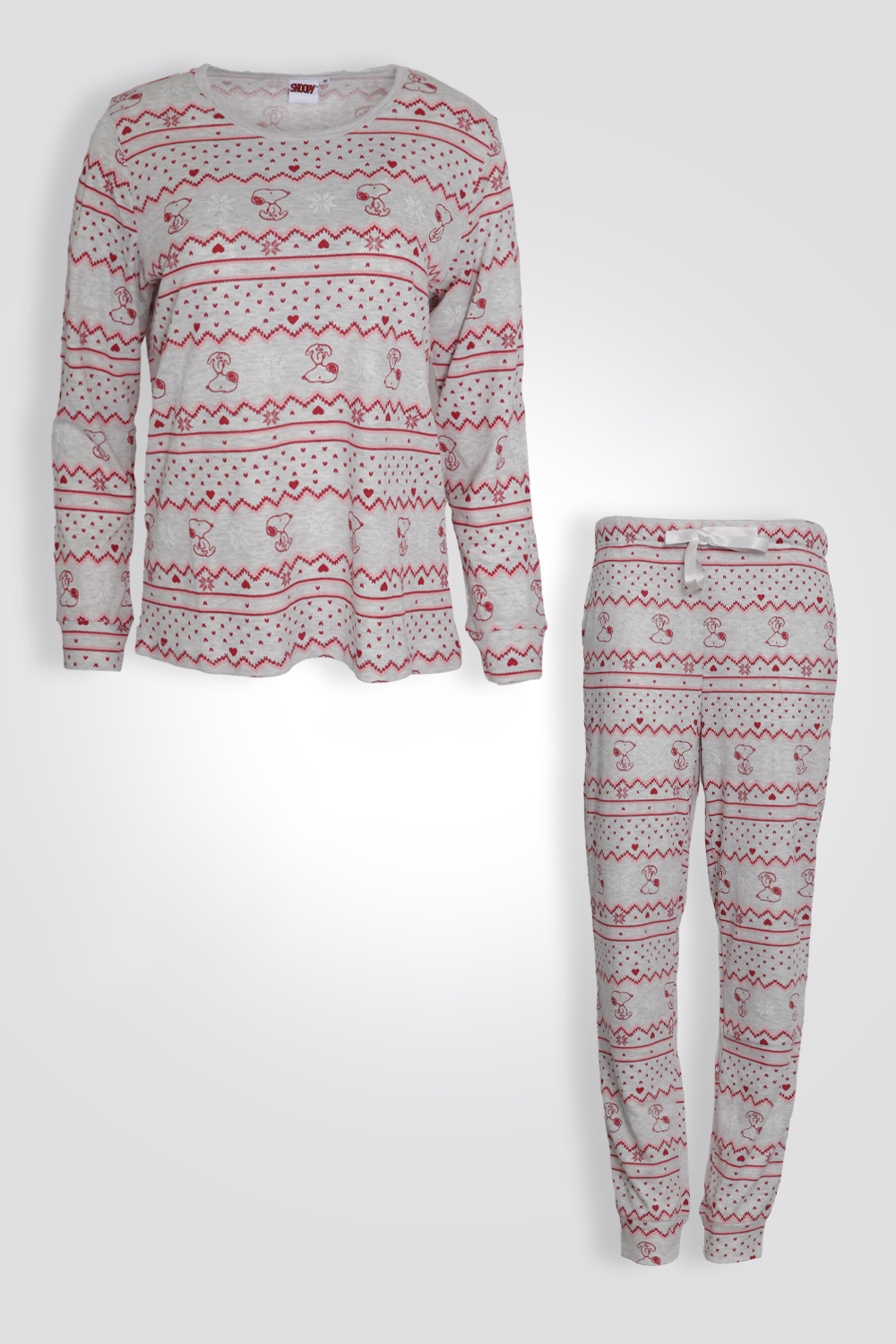 סט פיג'מה לנשים מבית המותג BONITA DE MAS העשוי מבד רך ונעים, בעל שרוולים ארוכים, מכנסיים ארוכים תואמים ודוגמא מתוקה של סנופי.