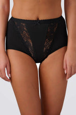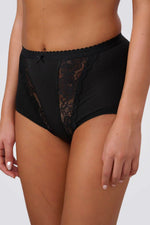 תחתוני מקסי מבית המותג FEMINA לנשים בצבע שחור, בגזרה גבוהה, עשויים מבד לייקרה רך ונעים למגע, בעיצוב עיטורי תחרה פרחונית שקופה בצדי החזית המעניקה מראה נשי ואלגנטי עם פפיון קטן ועדין במרכז.