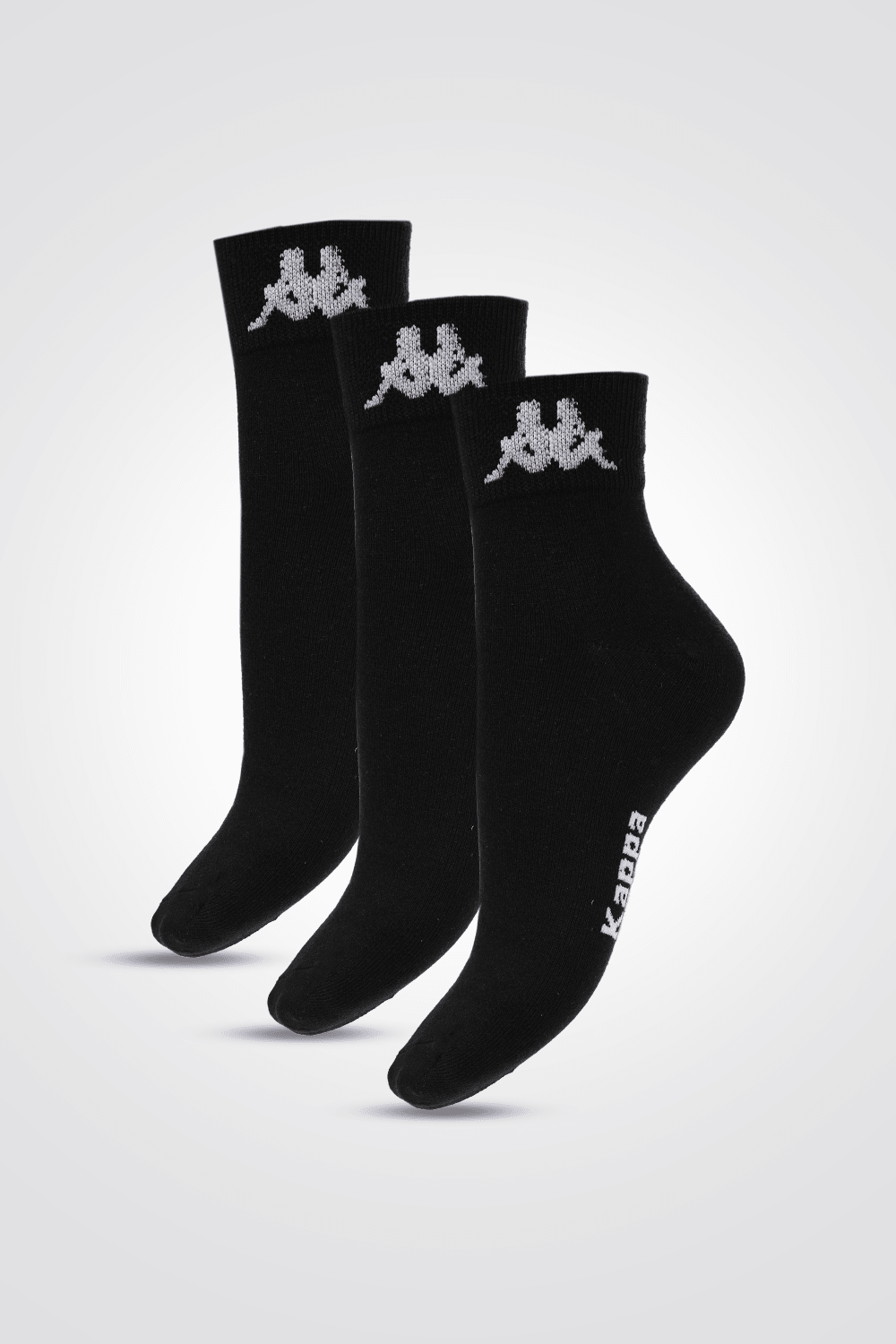 מארז שלישיית גרביים שחורות באורך קצר לגברים של המותג KAPPA, לוגו המותג רקום במכפלת.
