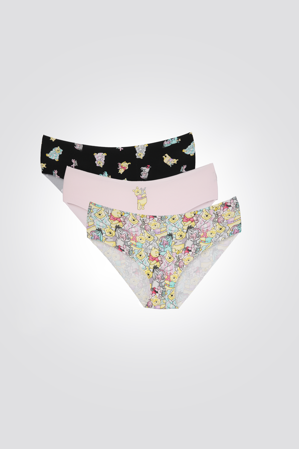 שלישיית תחתונים לנשים מבית המותג DELTA עשויים מבד נעים וגמיש במראה נו-שואו עם הדפסים של פו הדוב בגזרת היפסטר ומיוצר בטכנולוגיית אל-תפר ייחודית לנוחות מירבית.