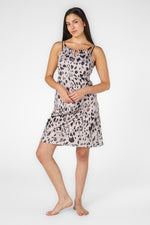 שמלת חוף ללא שרוולים מבית המותג SIMPLY STAR בעלת צאוורון קשירה עגול, רצועות דקיקות ובהדפס מנומר