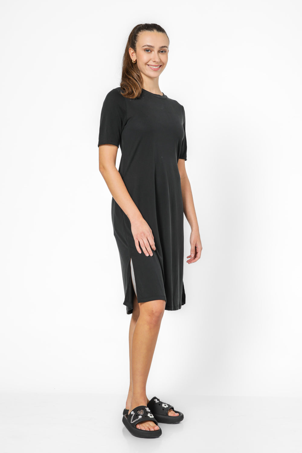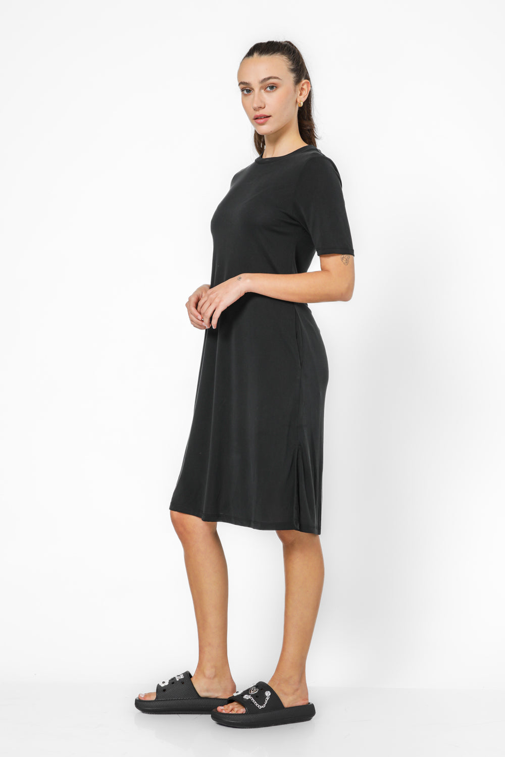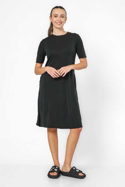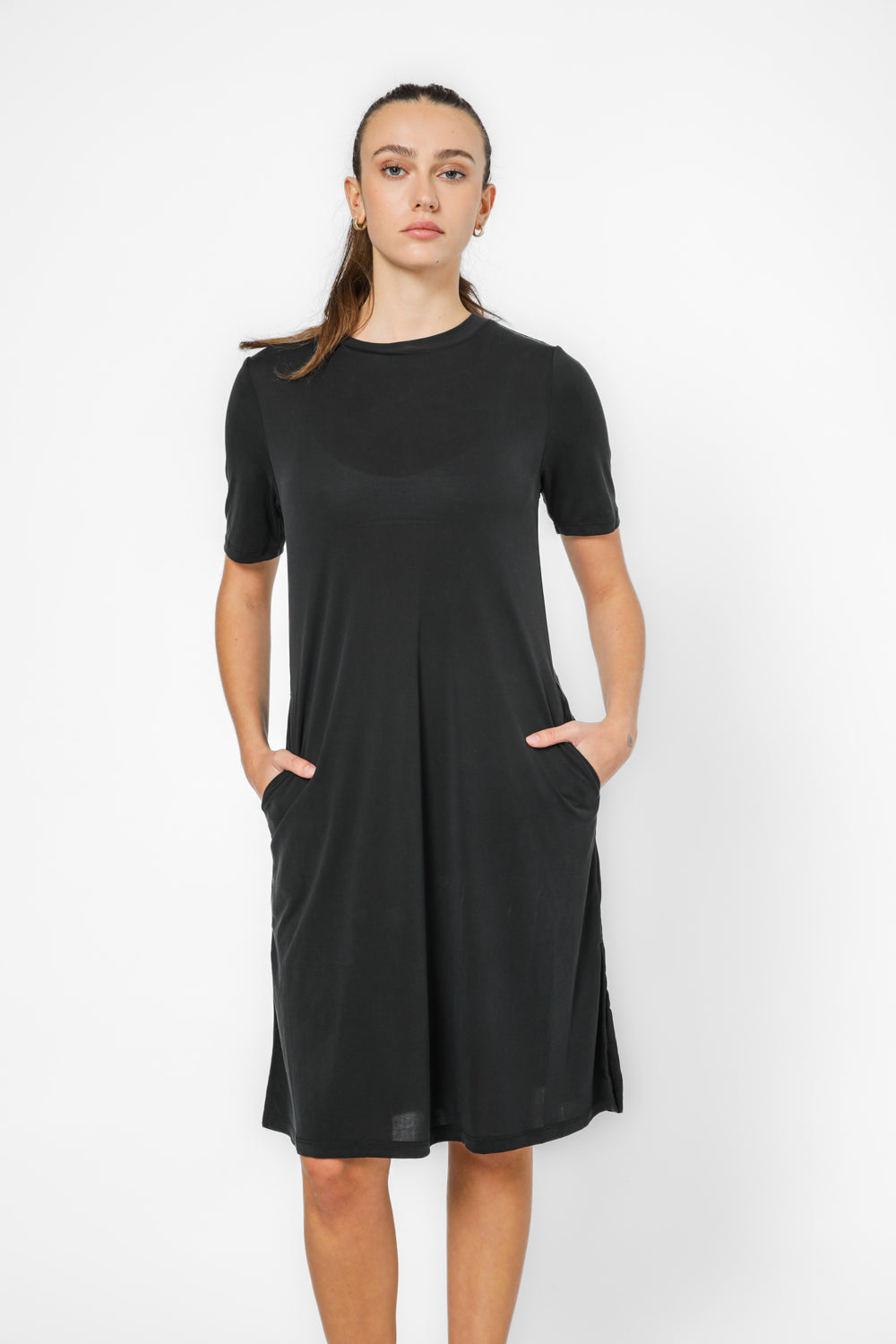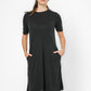 שמלה קצרה עד הברך מבית המותג DELTA מורכבת משילוב בד מודל קליל וגמיש עם צווארון עגול, שרוולים קצרים וכיסים.