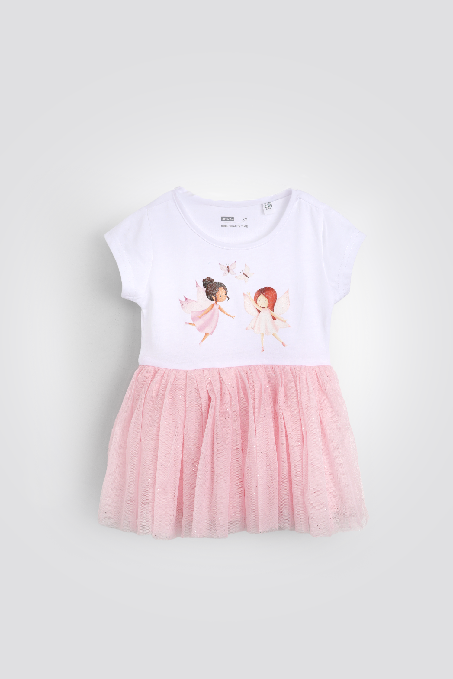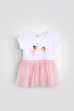 שמלה קצרה לילדות מבית המותג DELTA בעלת הדפס פיות קסום, מפתח צוואר עגול, שרוולים קצרים וחצאית טול.
