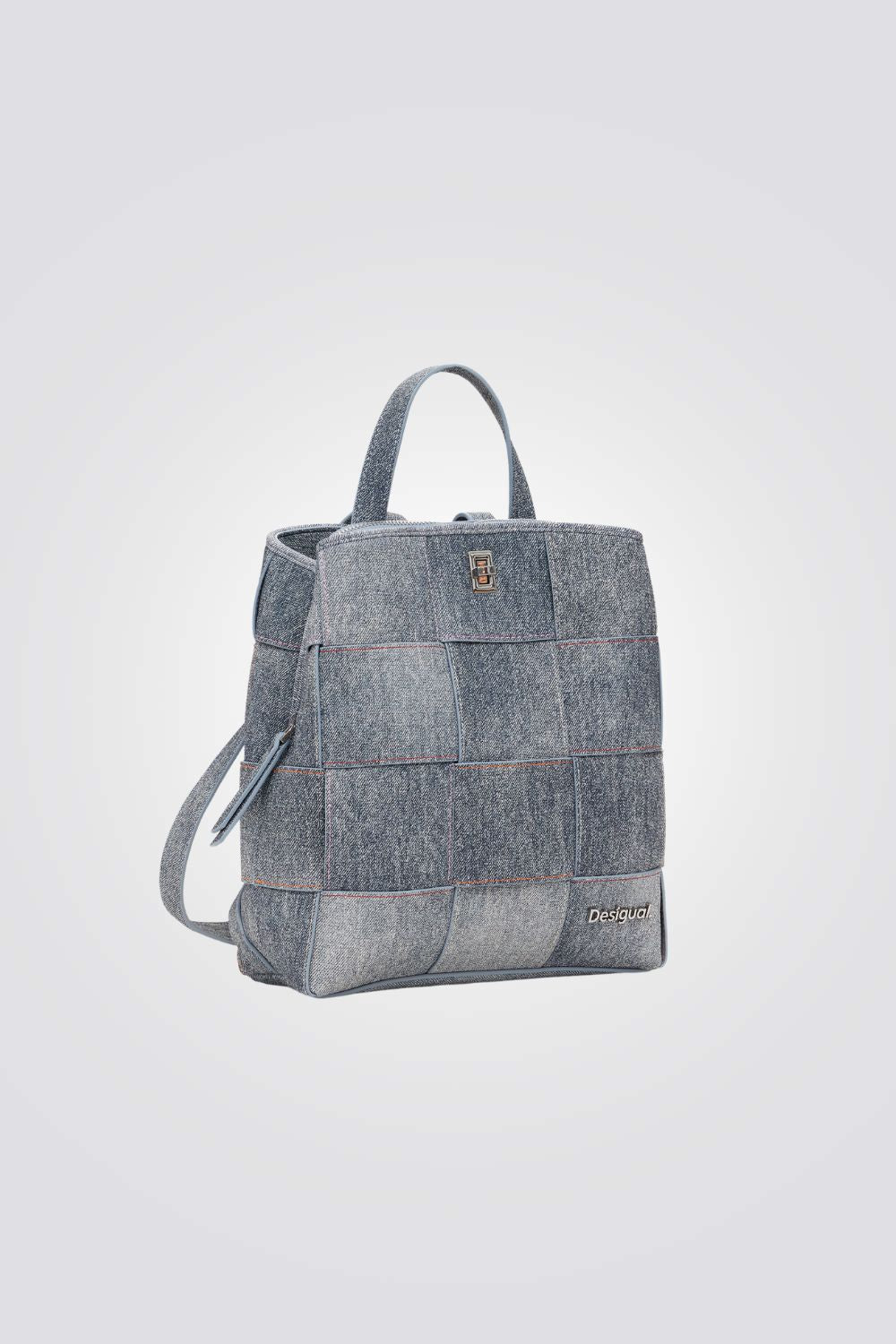 תיק גב לנשים מבית המותג DESIGUAL, בצבע ג'ינס אפור משופשף ,עם דוגמת ריבועים המוסיפה סטייל ושיק, שתי רצועות גב ועוד רצועת יד קצרה.