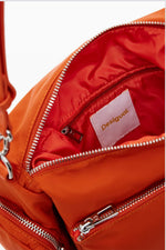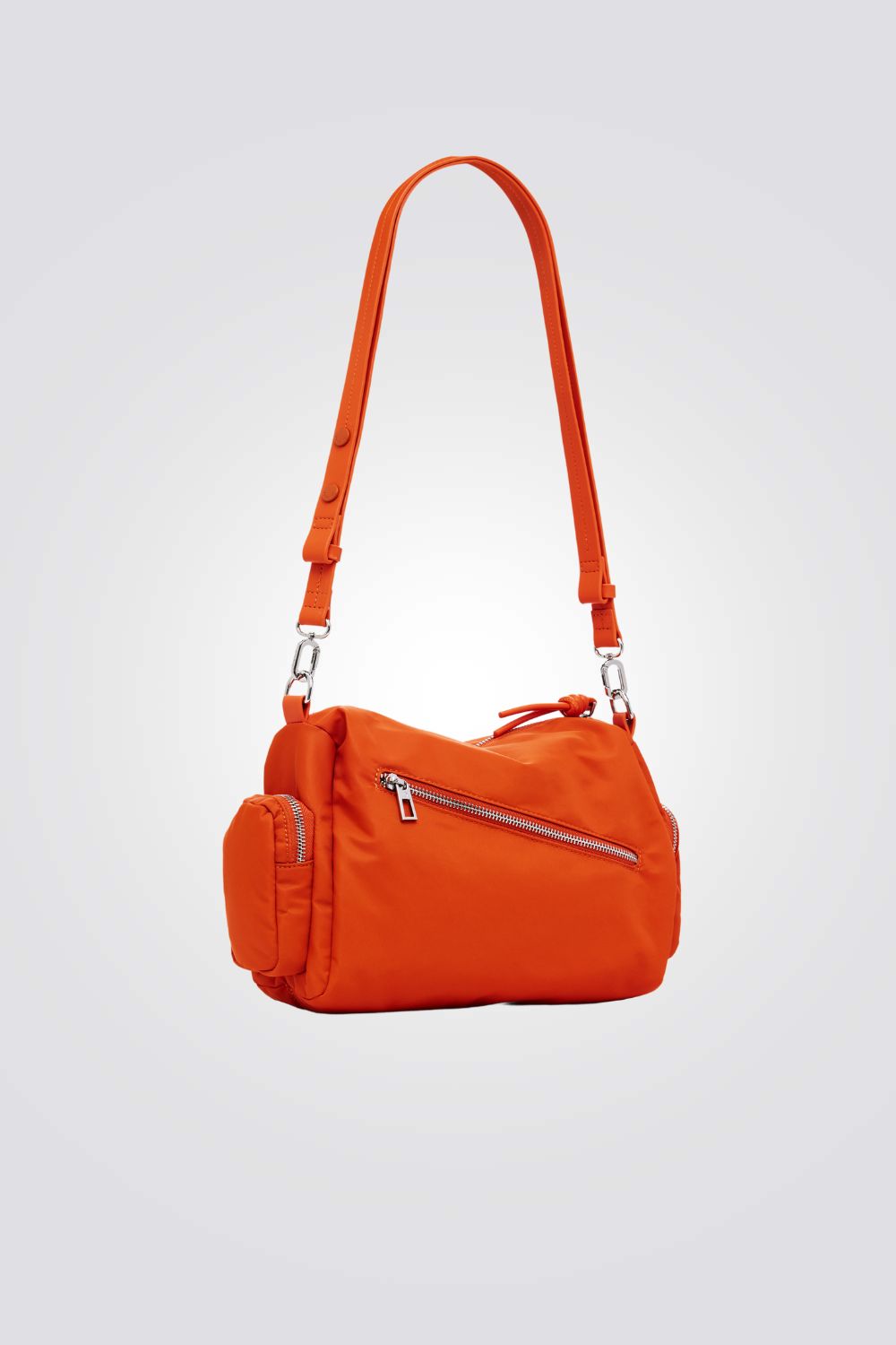 תיק כתף לנשים מבית המותג DESIGUAL,בצבע כתום, בעיצוב שיקי ומודרני, תאים רבים לאחסון עם סגירת רוכסן, ושתי רצועות ארוכות.