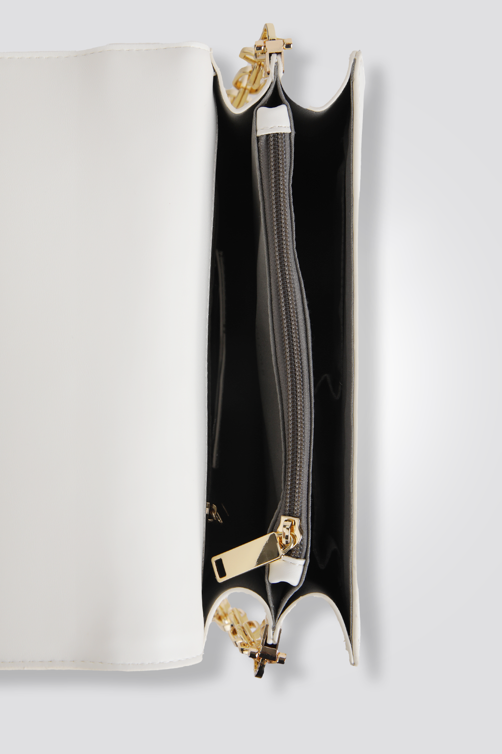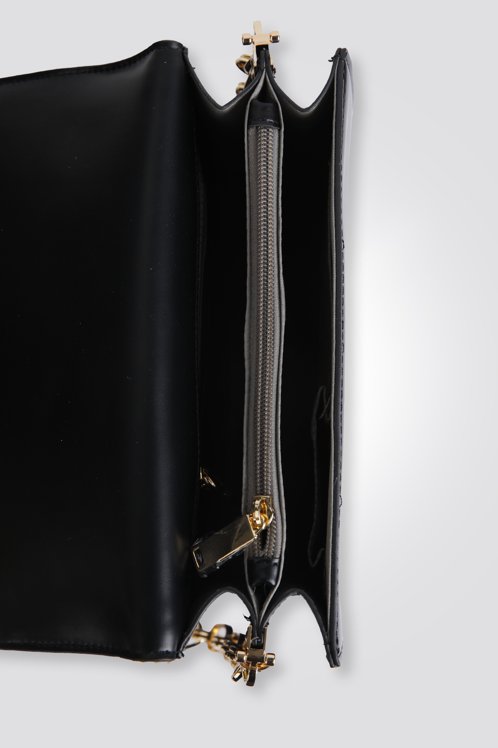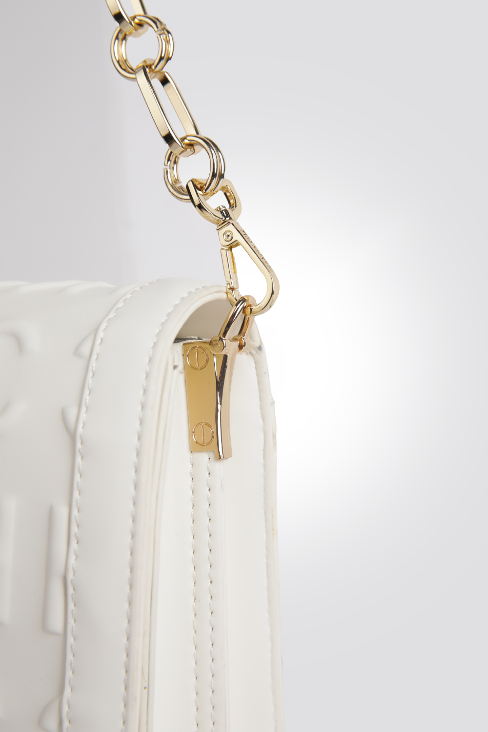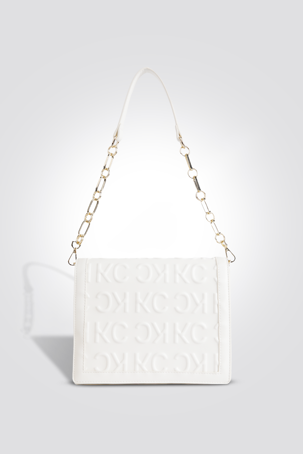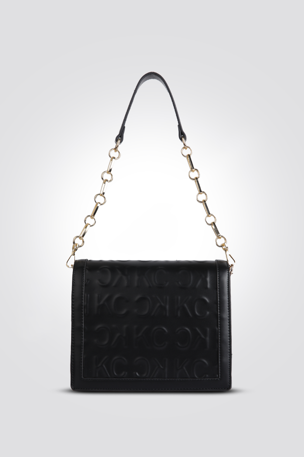 תיק צד מבית המותג KENNETH COLE, תא אמצעי עם סגירת רוכסן ורצועה עם שרשרת בצבע זהב ואותיות המותג מובלטות.